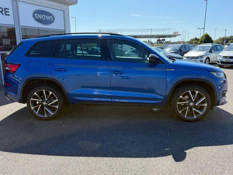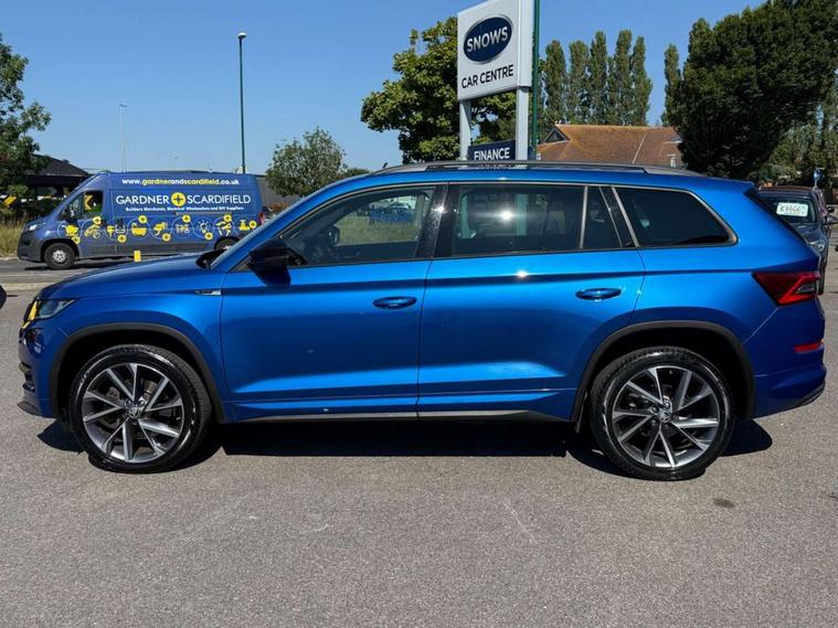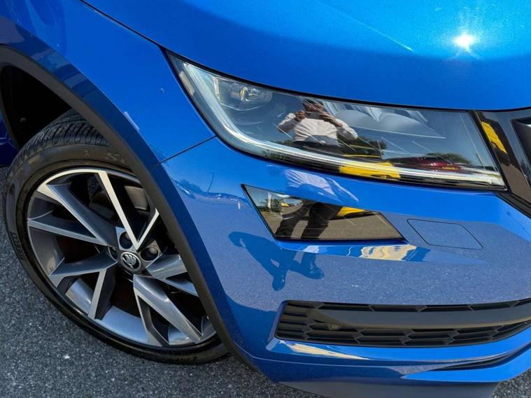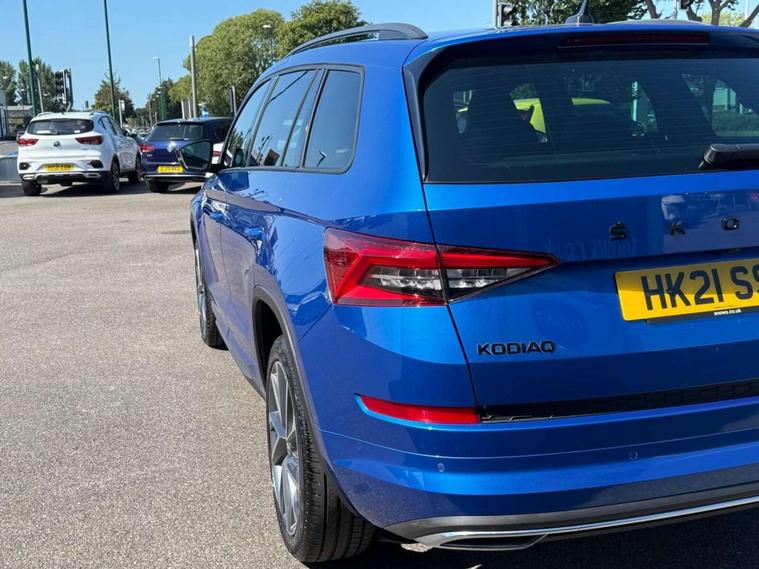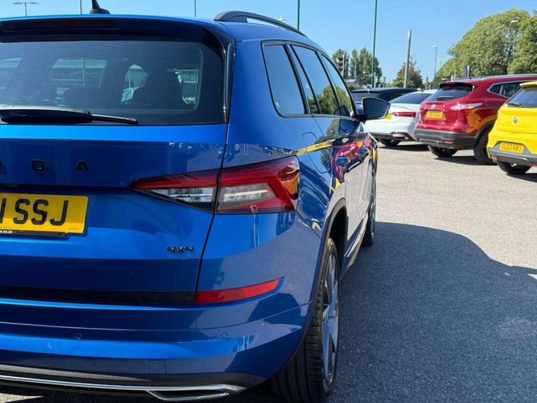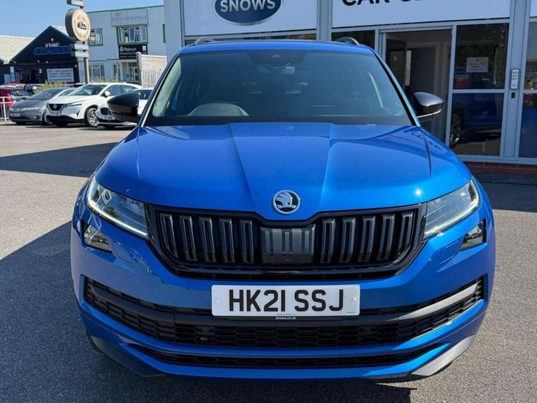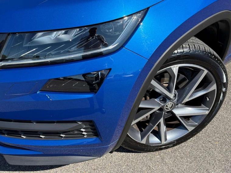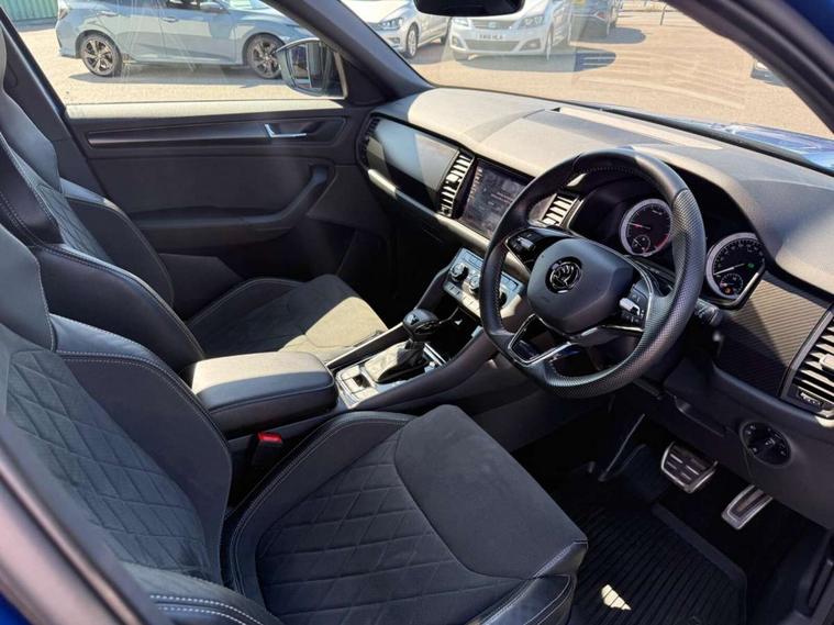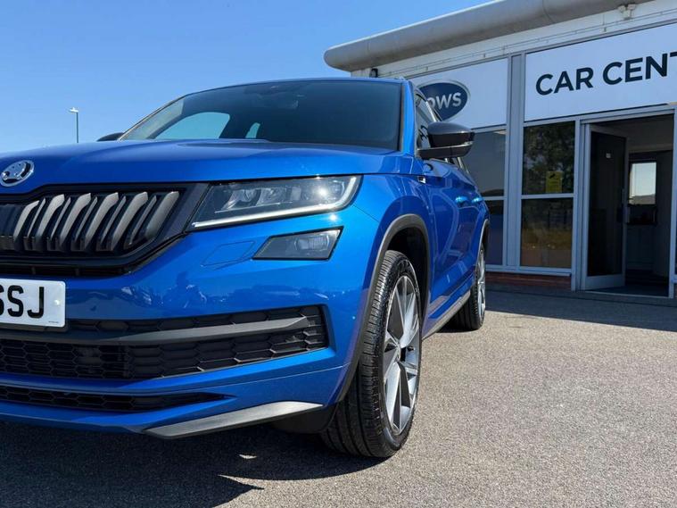 Bluetooth system, Columbus satellite navigation with 9.2" touch screen and integrated Wi-Fi + WLAN and web radio, Digital voice enhancement, ECO Stop/start function, Exterior temperature indicator, Map care, Progressive steering, Smartlink wireless for apple carplay and wired for android auto, Speed limiter, Sports dials, Tailgate unlocking from outside, USB C Port x 2 in front centre console, DAB Digital radio, Aero front windscreen wipers with intermittent function, Aero rear window wiper, Auto dimming rear view mirror, Automatic activation of hazard warning lights, Black electric window control buttons, Black roof rails and door mirrors with radiator grille and window surrounds, Black wheel arch surrounds, Body colour bumpers, Body colour door handles, Chrome exhaust tailpipe, Electric front and rear windows, Electrically adjustable/heated/foldable and auto dimming door mirrors with memory function, Front door steps with SportLine logo, Full LED Headlights with adaptive front light system and LED daytime running lights, Headlight washers, Heated rear window, LED front fog lights with static cornering light function, LED rear fog light, LED third brake light in rear spoiler, Light assistant (coming home/tunnel light), Rain and light sensors, Rear diffuser, Rear spoiler, Safety reflectors on front and rear doors, Sportline badge on front fender, Sports front and rear bumpers, Sunset privacy glass, Tailgate lettering in Black, Without engine designation, 12V socket in boot, 2 rails with 2 hooks including 4 hooks for net programme, 4 foldable roof handles with rear coat hooks, 4 lashing points on luggage floor, 60:40 foldable rear seat with sliding adjustment and backrest angle adjustment, Alcantara door panels, Aluminium pedals, Black roof headlining, Bottle holders in door panel in the 1.5 litre front and 1 litre rear, Cargo storage compartments, Centre console with open storage box, cup holder and 12V socket, Chrome headlight control button, Chrome interior door handles, Coat hooks on B pillar, Covered storage compartment on driver side, Front and rear door armrest with black adductor trim, Front and rear height adjustable headrests, Front centre armrest with storage compartment, cup holder and 12V socket, Front courtesy lights, Gear shift lever with chrome frame and black gloss insert, Illuminated and cooled glovebox, Illuminated luggage compartment, Isofix child seat fittings in outer rear seats with top tether, Manually adjustable steering column, Microsuede/leather upholstery with front sports seats, Net programme in boot (1x horizontal Net, 2x vertical Nets), Overhead glasses storage compartment, Paddles on steering wheel for DSG gearbox, Pollen filter, Rear centre armrest with cupholders, Roll up luggage compartment cover with intermediate position, Small Bags on the inner sides of the front backrests, Storage compartment in lower middle instrument panel with closing, Three rear height adjustable headrests, Ticket holder on A Pillar, Umbrella in door panel, LED Interior Light pack - Kodiaq Scout/Sport Line/VRS/Laurin + Klement, Auto door release and activation of warning lights in the event of an accident, Driver and passenger airbags, Electronic parking brake with hill hold control, Emergency rear braking signal, ESC (incl. ABS+MSR+ASR+EDS+HBA+DSR+RBS+MKB), Front and rear three point safety belt on all seats, Front assist includes AEB city/urban, Front passenger airbag deactivation switch, Front side airbags, Fuel cut off safety device, Head and knee airbags, Rear disc brakes, Safety vest holder in door, Seat belt reminder for all seats, Two tone horn, Tyre pressure monitor, Warning lights in front doors, Alarm with interior monitoring and tilt sensor with safe function, Immobiliser, Keyless entry and start system (KESSY), Remote central locking, Black air vent surround, Carbon finish dashboard and door inserts, 20" Vega Anthracite alloy wheels with anti-theft wheel bolts,
