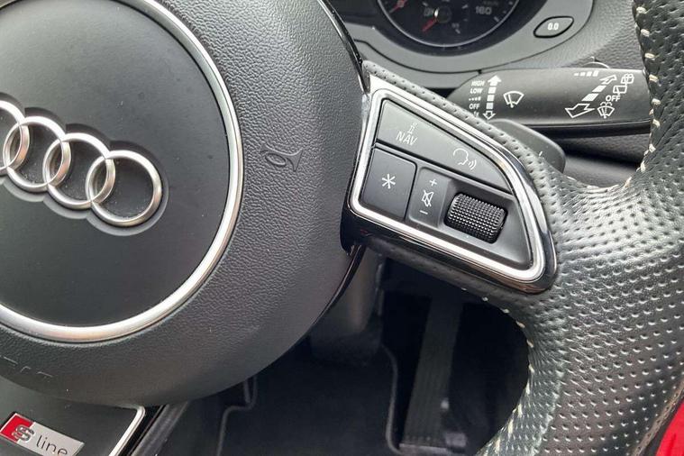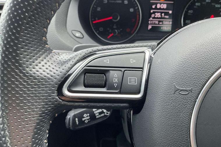 6.5" colour display screen, Audi drive select, Cruise control, Electro-mechanical PAS, Low washer fluid indicator, MMI - Multi Media Interface control system, On board computer, Remote electric boot opening/closing, Service interval indicator, Voice control system, Dynamic suspension, Audi music interface, DAB digital radio module, Acoustic windscreen, Aluminium window surround, Auto dimming rear view mirror, Body colour door mirrors, Body coloured bumpers, Chrome exhaust tailpipe, Coming home function, Door mirror integrated indicators, Front and rear electric windows, Front fog lights, Front lip spoiler, Heated windscreen washer jets, LED daytime running lights, LED headlights with headlight washers, LED rear lights, Light and rain sensor for auto activation of lights and windscreen wipers, Loading sill protector in stainless steel, Rear diffuser with platinum insert, Rear wiper, S Line body styling, Sunband for windscreen, 12V socket in rear centre console, 3 spoke multi-function Q design steering wheel with paddle shift, Aluminium door sill trims, Black cloth headlining, Door sill trim strips, Dual zone climate control, Electric front lumbar adjustment, Front and rear headrests, Front and rear velour floor mats, Front centre armrest with storage compartment and angle adjustment, Front sports seats, Height/reach adjust steering wheel, ISOFIX on front passenger and rear outer seats, Jack and tool kit, Perforated leather gearknob, Retractable luggage cover, Split fold rear seat, Storage compartment and 12V socket, Under floor storage in luggage area, 3x3 point rear seatbelts, ABS+Electronic Brake force Distribution, Curtain airbags, Driver and passenger airbags, Driver and passenger side airbags, EDL + ASR, Electrically operated child locks on rear doors, Electromechanical parking brake, ESP, First aid kit, Front passenger airbag deactivation, Head airbags, Seatbelt warning light, Tyre pressure monitoring system, Warning triangle, Locking wheel bolts, Remote central locking, Thatcham category 1 alarm + immobiliser, Matt brushed aluminium fascia and door trim inlays,