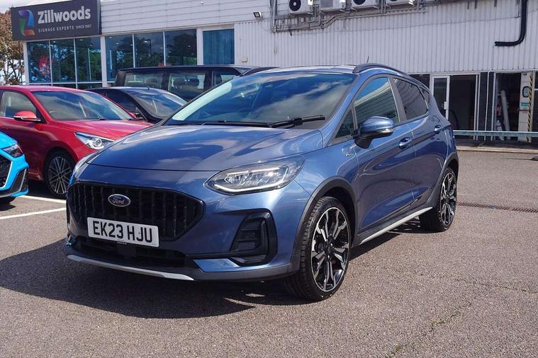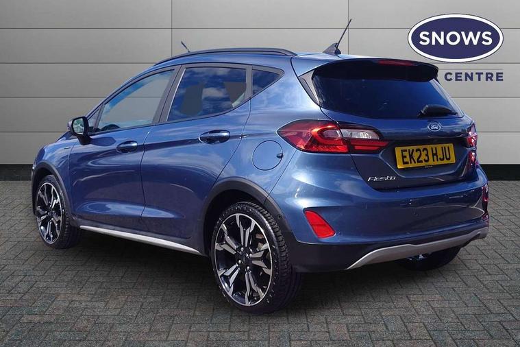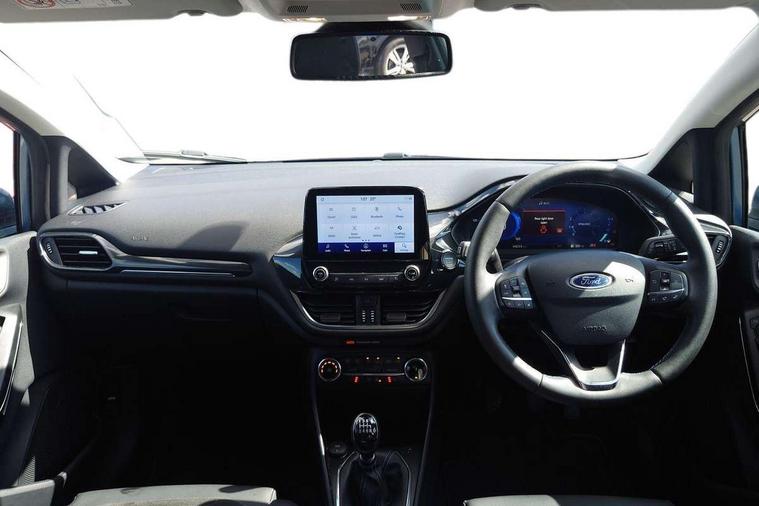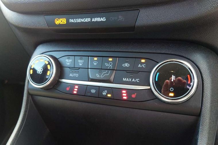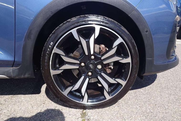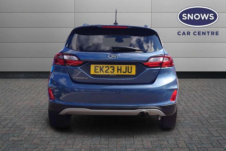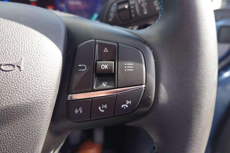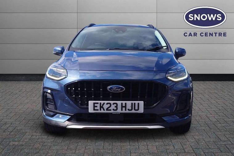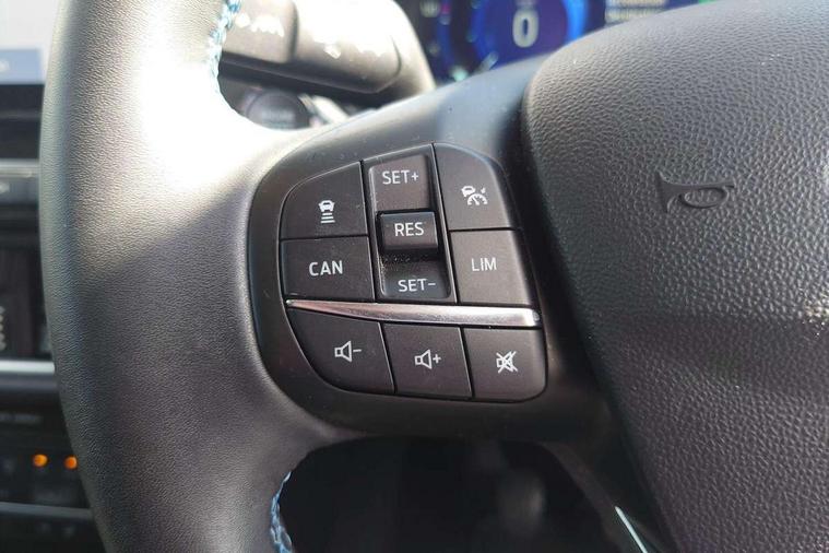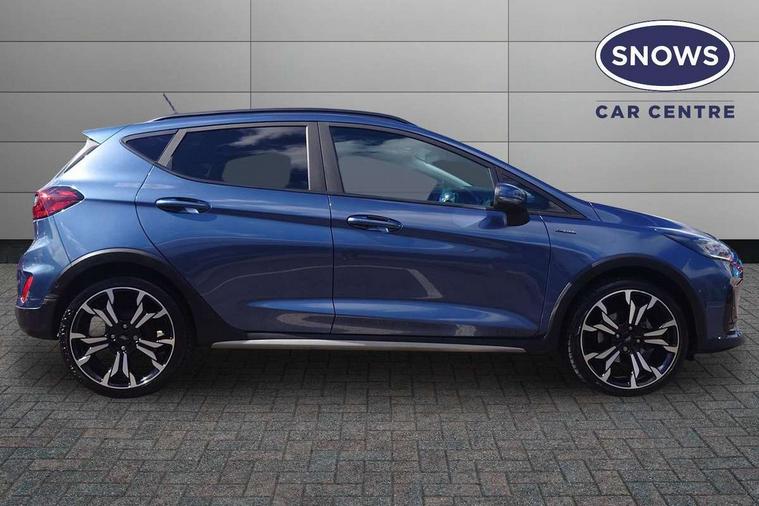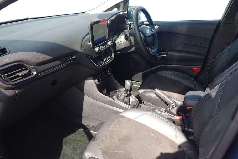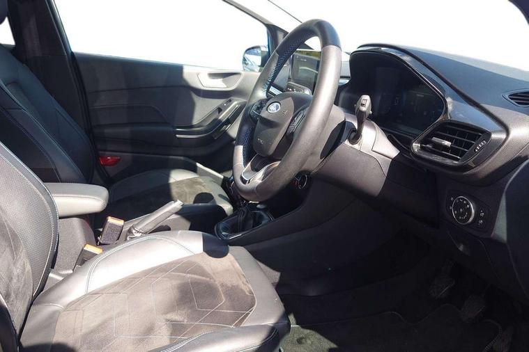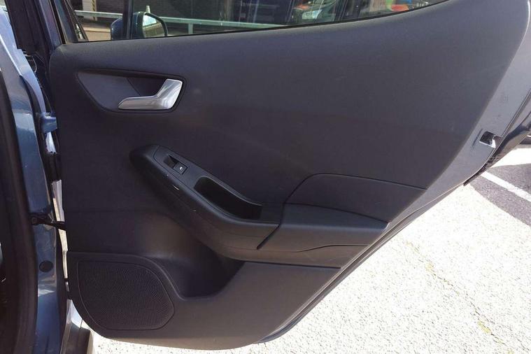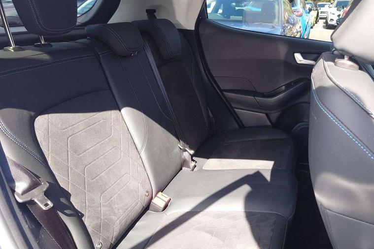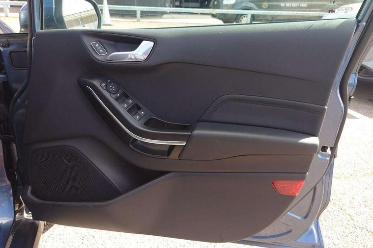 Driver alert system, Electric power steering, Ford easy fuel, Lane keep assist, Lane keeping aid, Rear parking distance sensors, Rear view camera, Selectable drive modes (Normal, Sport, Track), Trip computer, Rough road suspension with increased ride height adjust, 3rd brake light, Auto high beam, Automatic headlights, Body colour bumpers, Body coloured electrically operated with side indicators, Electric front windows/one touch facility, Electric rear windows, LED rear lights, Quickclear heated windscreen, Rain sensing wipers and auto dimming rear view mirror, Rear privacy glass, Rear side wing doors, Rear wiper, Rugged bodystyling kit with active front wing badges, 3 rear headrests, 3 seat bench in 2nd row, 4 way manually adjustable passenger seat, Adjustable head restraints, Centre console with opening armrest, 2x cupholders, 12v and USB, EATC - Electronic Auto Temperature control, Heated front seats and steering wheel, Leather gear knob, Manual 4-way driver seat adjust, Premium floor mats, Sensico partial premium leather upholstery with blue stitching, Sensico wrapped steering wheel, Single front passenger seat, Winter pack [GTBAB]- Fiesta, 3 point seatbelts on all rear seats, Electronic stability control with hill start assist, Front and rear seat belt warning, Manual child lock in rear doors, Tyre pressure monitoring system, Ford keyfree system with Keyless entry and keyless start, MyKey system, Remote central locking, Thatcham alarm with power door dead locks, 18" 5x2 spoke alloys with bi-colour black machined finish,