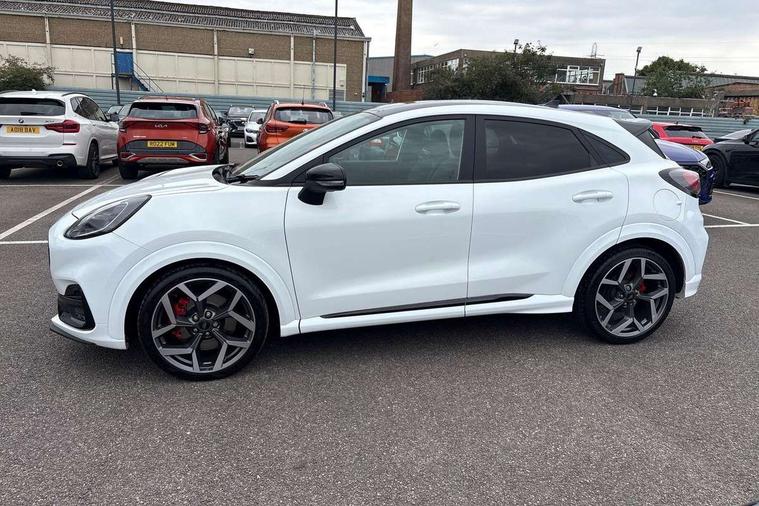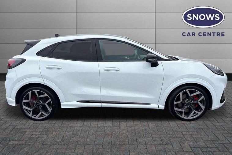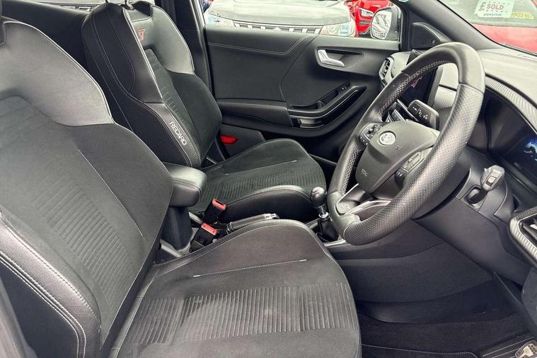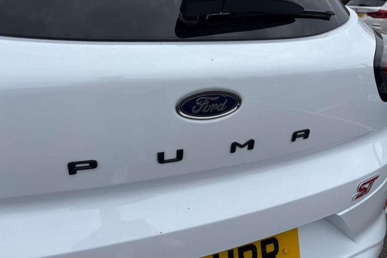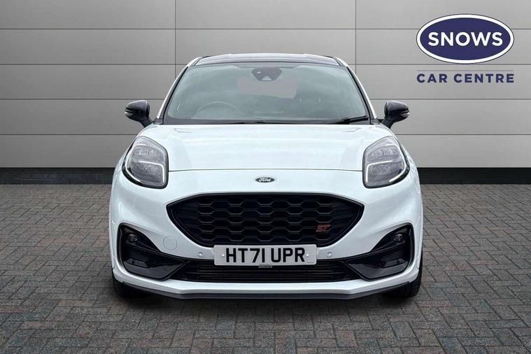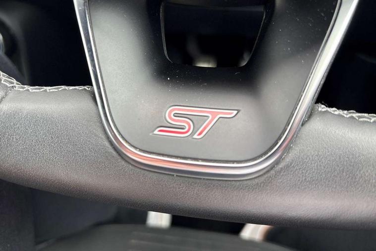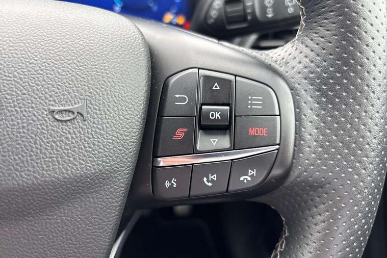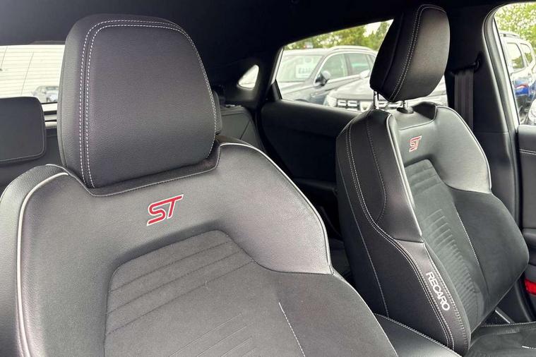 Cruise control with Intelligent speed assist, Driver impairment monitor, Emergency call service, Ford easy fuel, Front and rear parking sensors, Full digital 12.3" instrument cluster, Lane keeping aid with lane departure warning, Power assist steering, Selectable drive modes (normal, sport, eco, track), Speed sign recognition, Wireless charging pad, Engine sound enhancer, ST suspension, Automatic headlights with auto high beam, Automatic rain sensing wipers, Dual chrome exhaust, Fixed LED signature headlamps, Front fog lamps, LED daytime running lights, LED rear lamps, Power foldable heated door mirrors with puddle lamps and puma logo protection, Privacy glass to side rear windows and tailgate glass, Quickclear heated windscreen, Rear side wing doors, Rear wiper, ST scuff plates, Third brake light, Unique ST body styling kit including contrast black roof, large rear spoiler and wing mirrors, plus Ford Performance embossed splitter, 3 seat bench in 2nd row, Alloy sports pedals, Centre console with armrest and stowage, Electronic automatic temperature control (EATC), Ford megabox extended bootspace, Ford Performance sensico partial premium leather upholstery with metal grey stitching, Front and rear floor mats, Front and rear head restraints, Heated front seats, Heated steering wheel, Manual 6 way driver seat adjust with lumbar adjustment, Manual 6 way passenger seat with lumbar seat adjustment, Single front passenger seat, ST flat bottomed steering wheel with metal grey stitching, ST logo projection, Unique ST gear shift knob, B&O Premium Audio system + Ford SYNC 3 navigation pack - Puma, 3 rear seatbelts, Child safety lock, Electronic stability control (ESC) and hill start assist, Pre-collision assist with autonomous emergency braking, pedestrian/cyclist detection and post-collision braking, Red brake calipers, Tyre pressure monitoring system (TPMS), Keyless entry and power start button, Thatcham alarm, Carbon look interior deco spears, Tyre inflation kit,
