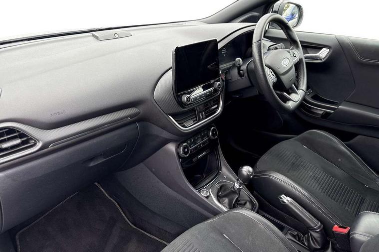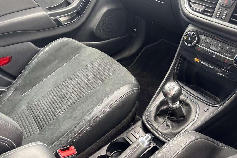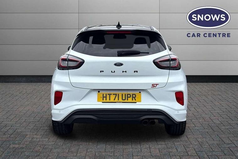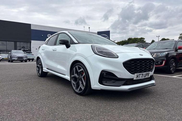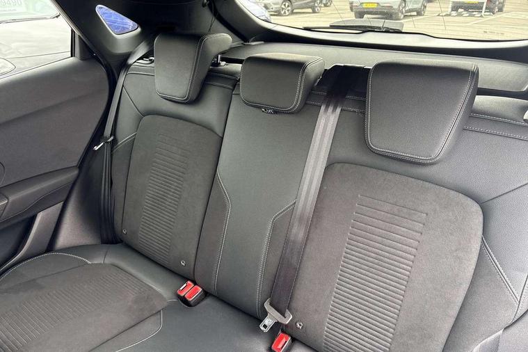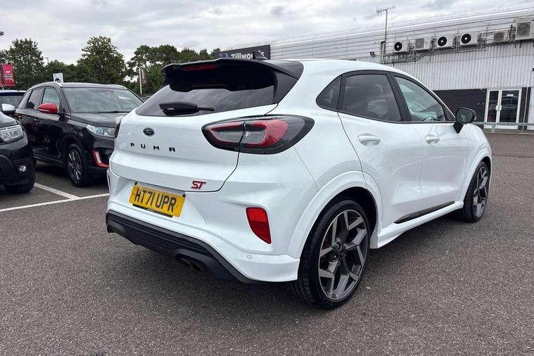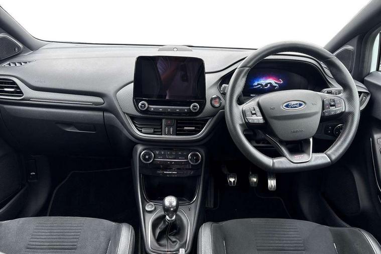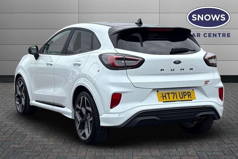 Cruise control with Intelligent speed assist, Driver impairment monitor, Emergency call service, Ford easy fuel, Front and rear parking sensors, Full digital 12.3" instrument cluster, Lane keeping aid with lane departure warning, Power assist steering, Selectable drive modes (normal, sport, eco, track), Speed sign recognition, Wireless charging pad, Engine sound enhancer, ST suspension, Automatic headlights with auto high beam, Automatic rain sensing wipers, Dual chrome exhaust, Fixed LED signature headlamps, Front fog lamps, LED daytime running lights, LED rear lamps, Power foldable heated door mirrors with puddle lamps and puma logo protection, Privacy glass to side rear windows and tailgate glass, Quickclear heated windscreen, Rear side wing doors, Rear wiper, ST scuff plates, Third brake light, Unique ST body styling kit including contrast black roof, large rear spoiler and wing mirrors, plus Ford Performance embossed splitter, 3 seat bench in 2nd row, Alloy sports pedals, Centre console with armrest and stowage, Electronic automatic temperature control (EATC), Ford megabox extended bootspace, Ford Performance sensico partial premium leather upholstery with metal grey stitching, Front and rear floor mats, Front and rear head restraints, Heated front seats, Heated steering wheel, Manual 6 way driver seat adjust with lumbar adjustment, Manual 6 way passenger seat with lumbar seat adjustment, Single front passenger seat, ST flat bottomed steering wheel with metal grey stitching, ST logo projection, Unique ST gear shift knob, B&O Premium Audio system + Ford SYNC 3 navigation pack - Puma, 3 rear seatbelts, Child safety lock, Electronic stability control (ESC) and hill start assist, Pre-collision assist with autonomous emergency braking, pedestrian/cyclist detection and post-collision braking, Red brake calipers, Tyre pressure monitoring system (TPMS), Keyless entry and power start button, Thatcham alarm, Carbon look interior deco spears, Tyre inflation kit,