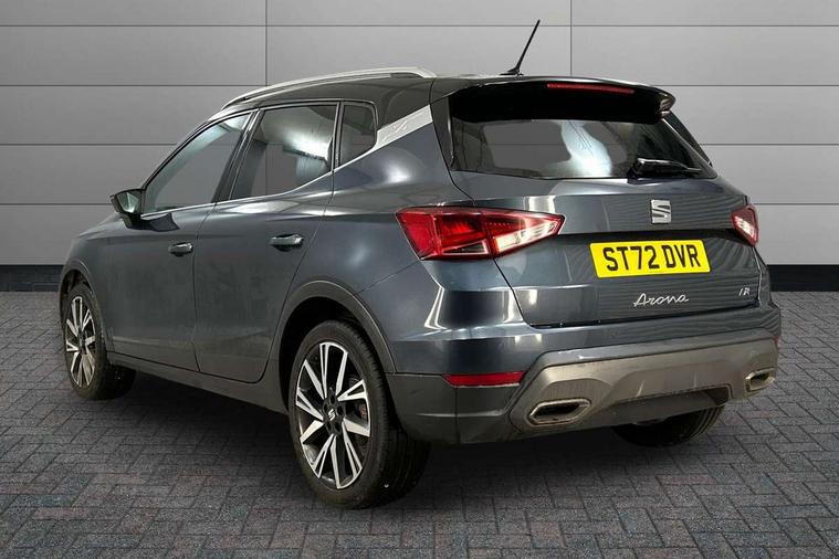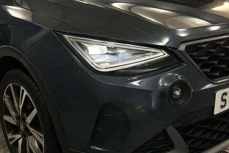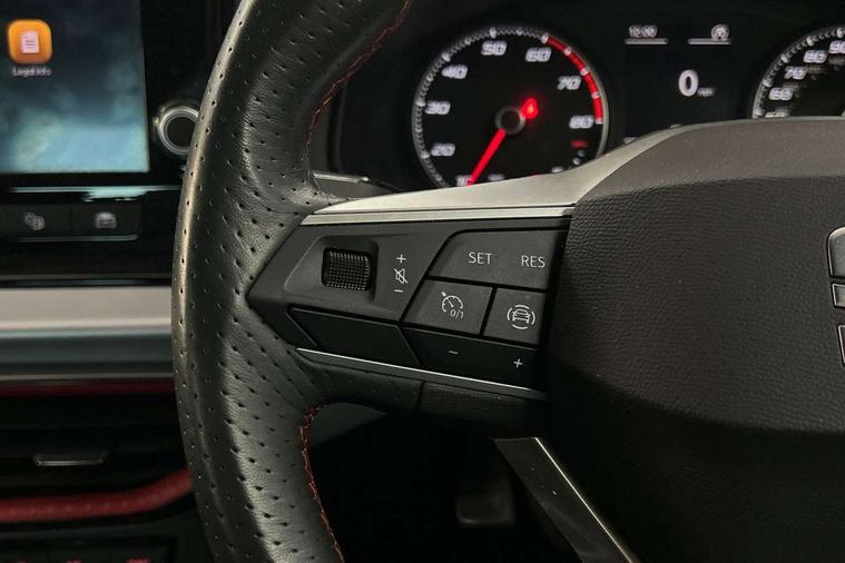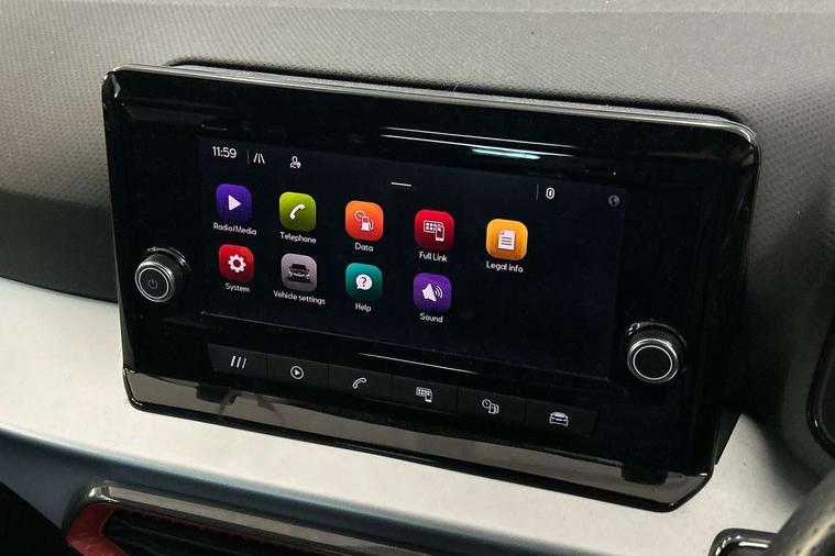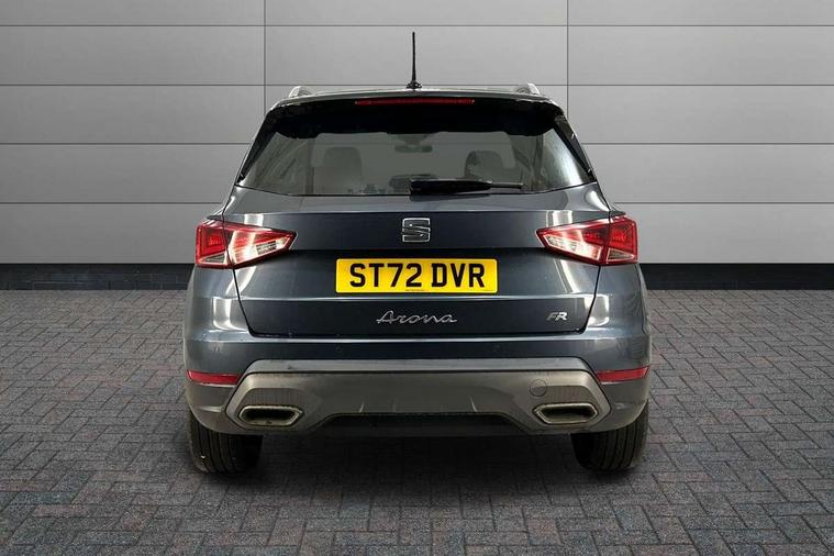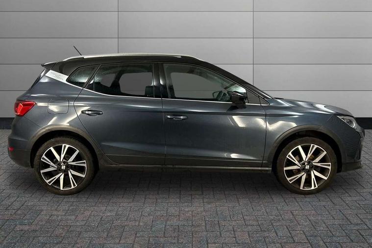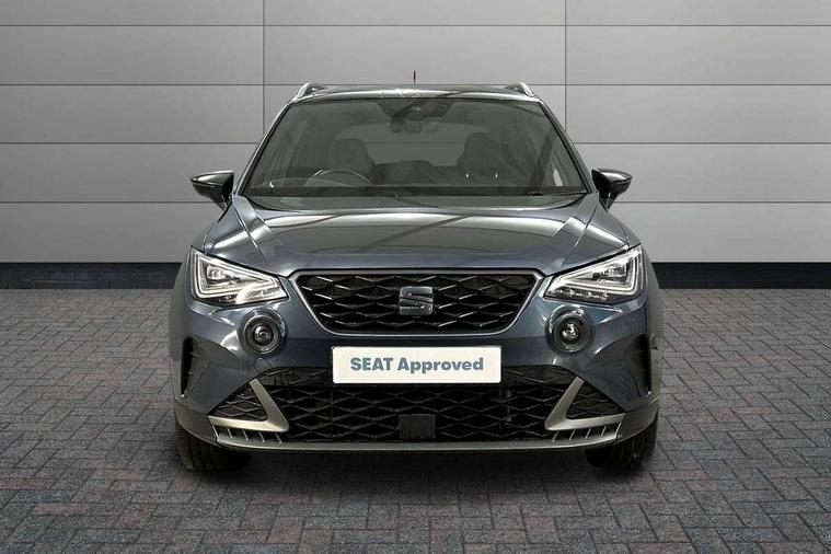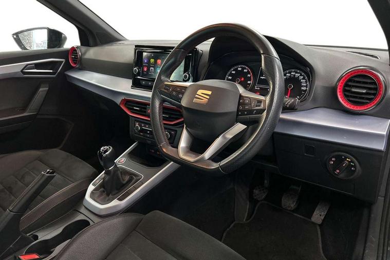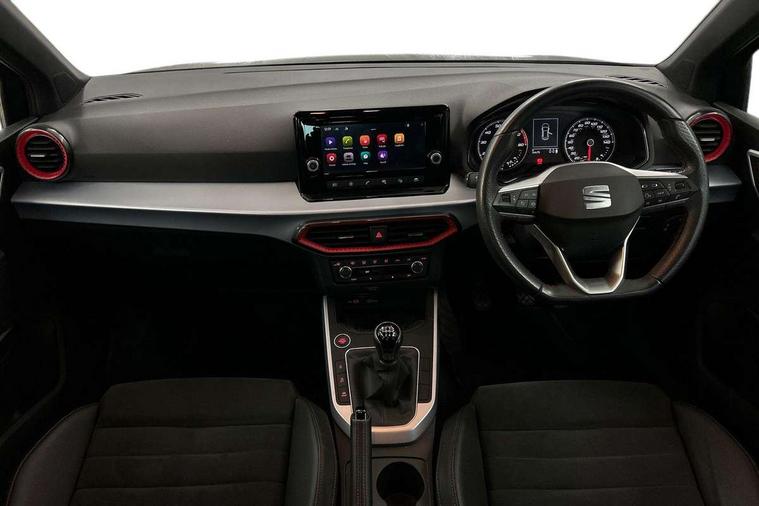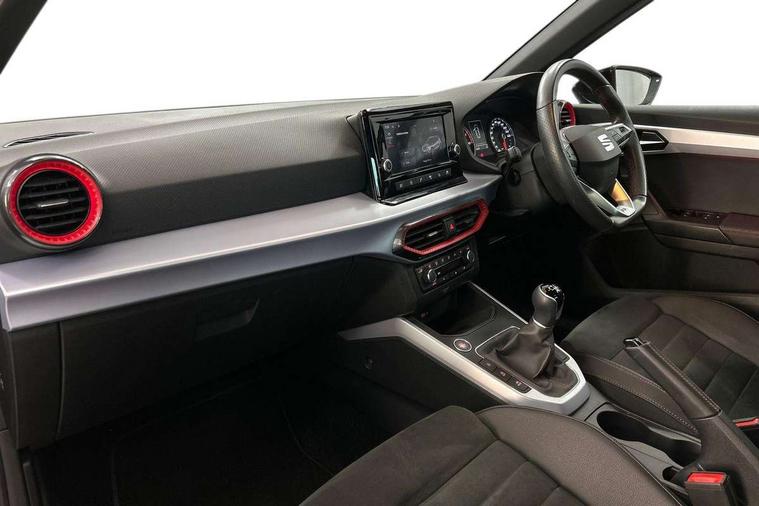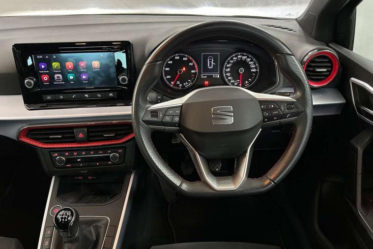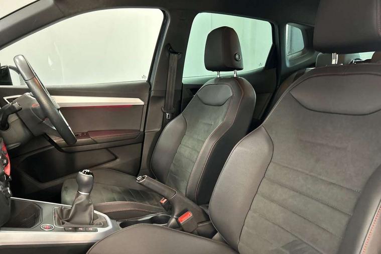 'Lights On' Reminder warning buzzer, Analogue cockpit with physical dials, Digital clock, E-call, Electric speed sensitive power steering, Full Link Smartphone Integration with Mirror Link, Apple Car Play, Google Android Auto with USB Type C cable for Apple and Android compatibility, Lane keeping system, Low fuel warning light, Outside temperature display, Rear parking sensor, RPM counter, Seat connect with safety, service and remote, SEAT Drive profile - Four different models normal-sport-eco-individual, steering response, throttle response, Trip computer, Wireless phone charger, Bluetooth interface for hands free and audio streaming, DAB digital radio and AM/FM radio, Media system with 8.25" colour touchscreen with USB port (type c), Steering wheel mounted audio controls, Anti theft roof antenna, Automatic activation of hazard warning lights, Body coloured bumpers, Body coloured door handle inserts, Chrome roof rails and window surrounds, Dark tinted rear windows, Dimming rear view mirror, Electric front/rear windows, Electrically adjustable and heated door mirrors, Front fog lights with cornering function and rear fog light, FULL LED automatic headlights with dynamic headlight range control, coming and leaving home, LED daytime running lights, LED rear tail lights and licence plate lights, Protective side mouldings, Rear side wing doors, Rear spoiler, Rear window wash/wipe, Roof colour door mirrors, Third brake light, Twin exhaust pipe styling hidden exhaust pipe, Visible VIN plate, Windshield wiper with intermittent control and potentiometer, 2 cupholders, 3 seat bench in 2nd row, 60/40 split folding rear seat, Aircare filter, Black interior roof, Double boot floor, Driver sunvisor with covered mirror + card holder, Dual zone climate control, Front comfort seats, Front courtesy light with 2x front and 2x rear reading lights, Gear shift indicator, Height adjustable front seats, Height/reach adjustable steering column, Illuminated boot, Instrument lighting with brightness control, Interior ambient lighting, Interior light in footwell, central console and door panel, ISOFIX points in outer rear seats with top tether anchorage points, Microsuede cloth upholstery, Passenger sunvisor with vanity mirror, Perforated flat bottomed leather steering wheel/gear knob/handbrake with red stitching and FR logo, Single front passenger seat, Two front and three rear height adjustable headrests, Interior chrome pack - Arona, 3 point seatbelts on all rear seats, ABS, Active front headrests, Child locks on rear doors, Driver and front passenger airbags with front passenger airbag de activation, front side and curtain airbags, Electronic stability control, Emergency Brake Assist (EBA) and front assist, Front and rear seatbelt reminder, Hill hold control, Multi-Collision braking, Tiredness recognition system, Traction control, Tyre pressure monitoring system, Alarm with back-up horn, Electronic engine immobiliser, KESSY Keyless entry and go, Locking wheel bolts, Remote central locking + deadlocks, Tow away protection, Titan black dashboard,