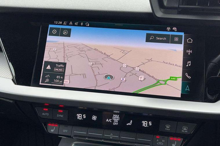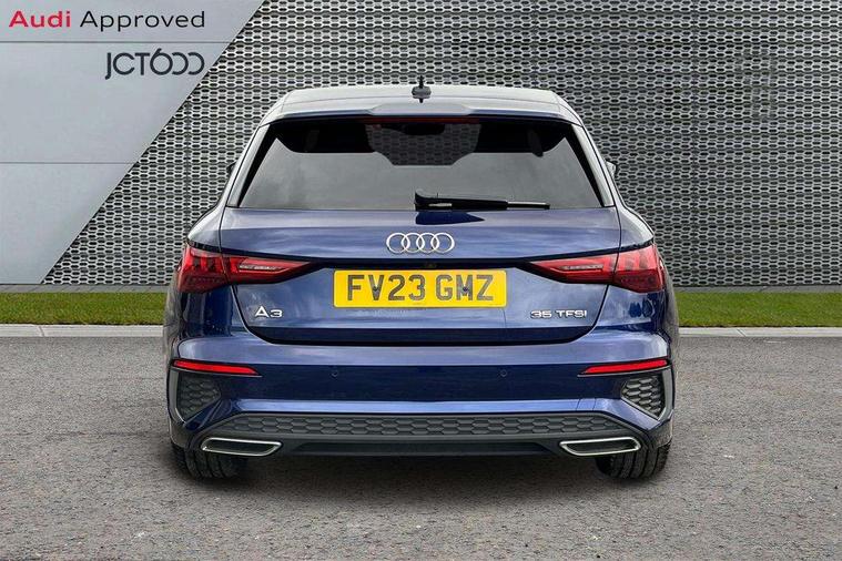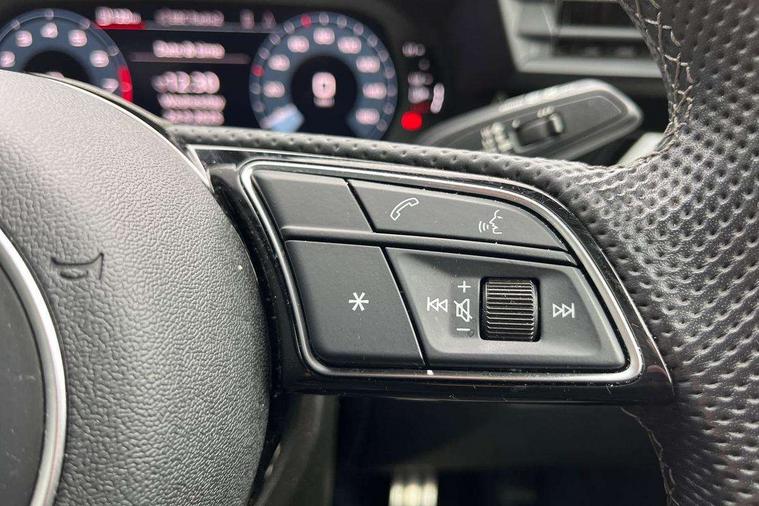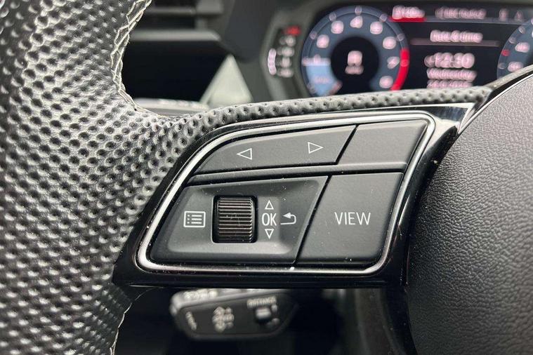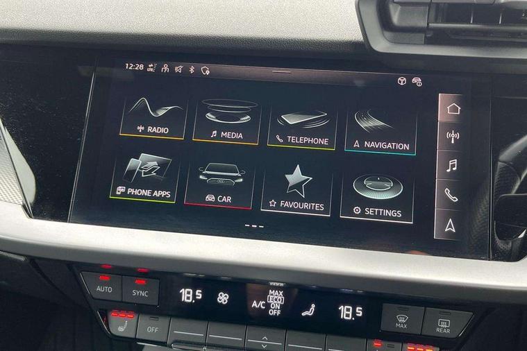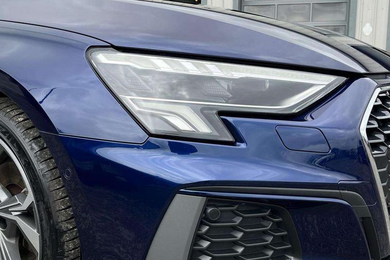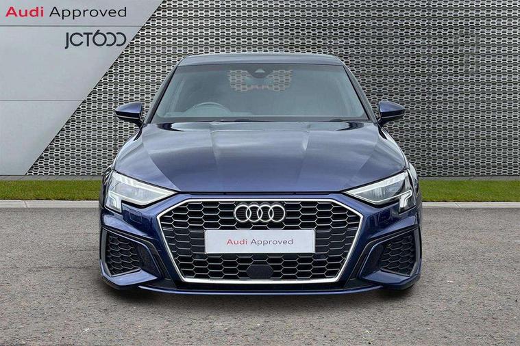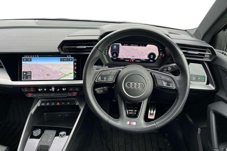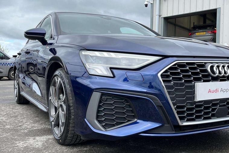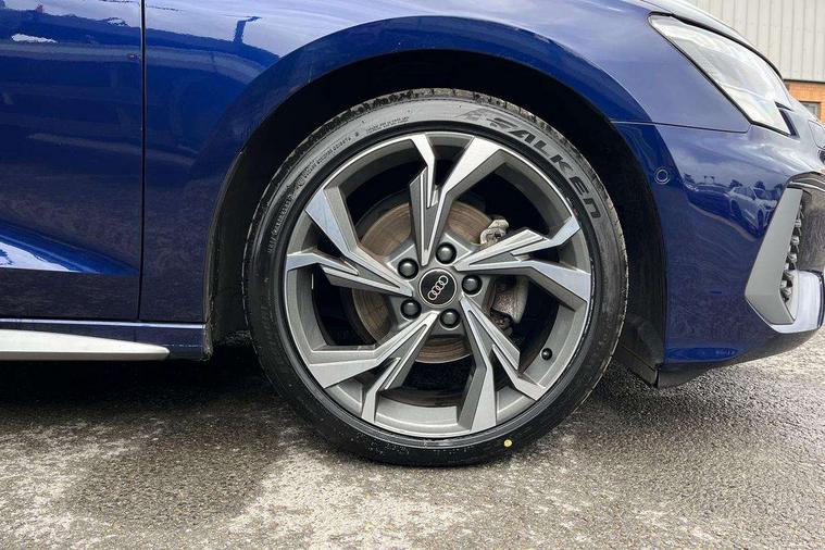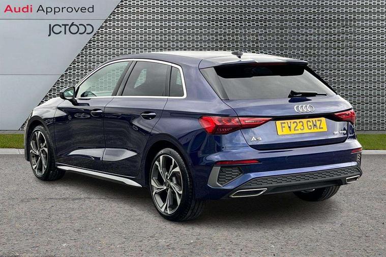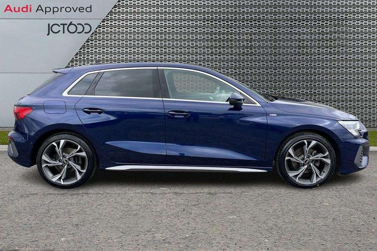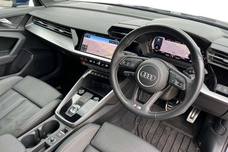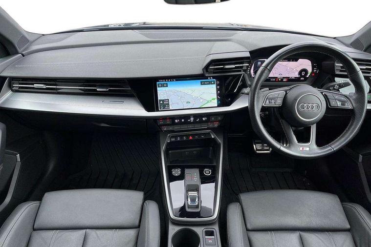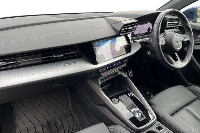 Audi drive select (Auto, Comfort, Dynamic, Efficiency and Individual), Audi smartphone interface, Audi Virtual Cockpit - 10.25" digital and colour instrument cluster, Automatic start/stop system with recuperation, Bluetooth interface, Collision avoidance assistant, e-Call (emergency call), Electromechanical power speed sensitive steering, Lane departure warning system, MMI Navigation Plus with high resolution 10.1" colour touch screen display, Service indicator, Trip computer, Voice control system with natural language interaction, Sports suspension, 2xUSB-C connection with data and charging functions, 6 passive loudspeakers, DAB Digital radio, 3rd brake light, Acoustic glass windscreen, Aluminium window trim, Auto dimming frameless rear view mirror, Body colour exterior mirrors, Electrically adjustable/heated/folding/auto dimming door mirrors with integrated LED indications + kerb view function for passenger side, Front electric windows, Illuminated aluminium inserts front door sills with S logo, LED daytime running lights, LED headlights with LED rear lights and dynamic rear indicators, Light and rain sensors, Privacy glass - dark tinted rear window, rear door and side windows, Rear electric windows, Rear side air outlets in grained matt black, Rear side wing doors, Rear wiper, S line bumpers, S roof spoiler, 12V socket and storage compartment in front centre console, 3 seat bench in 2nd row, 3 spoke leather multifunction steering wheel with paddle shift, 4 way electrically adjustable lumbar support for driver and front passenger, 60/40 split folding rear seat bench, Black cloth headlining, Dual zone electronic climate control, Front and rear centre armrest in leather, Front and rear headrests, Front/rear floor mats, Height and reach adjustable steering wheel, Interior lighting - glove compartment light and right hand side, Luggage compartment floor covering, Manual boot compartment lid, Manually adjustable front seats, Seat side bolsters, Single front passenger seat, Stainless steel pedals and front footrest in black, Twin leather upholstery with front sports seats S embossed logo, Aluminium interior elements pack - A3 Sportback, LED interior lighting pack - A3 Sportback, S line styling pack - A3 Sportback, 3x3 point rear seat belts, Driver and front passenger airbag with passenger airbag deactivation, Electronic Stabilisation Control (ESC) including ABS, ASR and EDL, First aid kit with warning triangle and 2 safety vests, Front side airbags with head airbags and interaction airbag, Pre-sense front with pedestrian and cyclist detection, Seatbelt monitoring, Tyre pressure loss indicator, Anti theft alarm, Anti-theft wheel bolts, Electronically operated child lock, Immobiliser, Remote control central locking, Dark spectrum aluminium inlays, accent surfaces in the dashboard and centre console in platinum grey silk effect paint finish,
