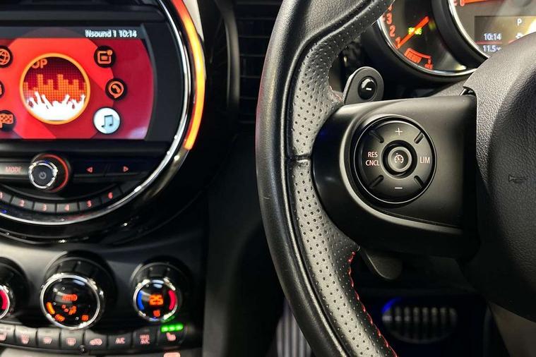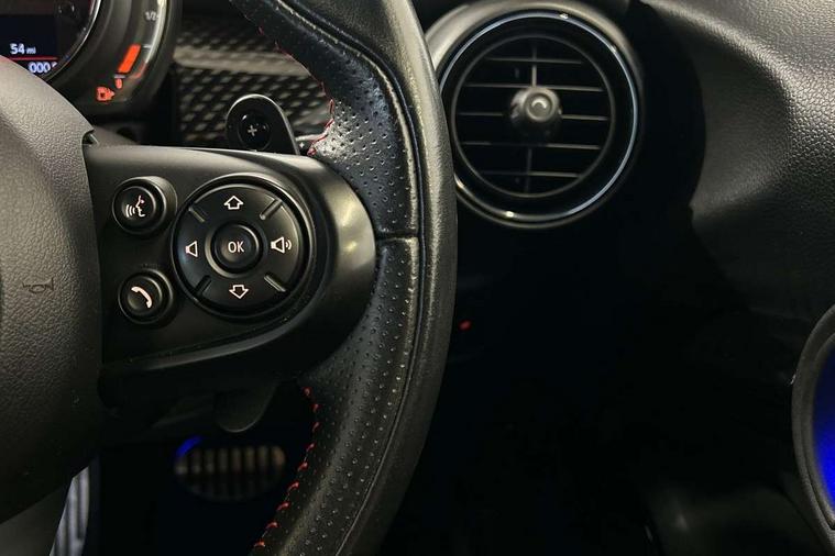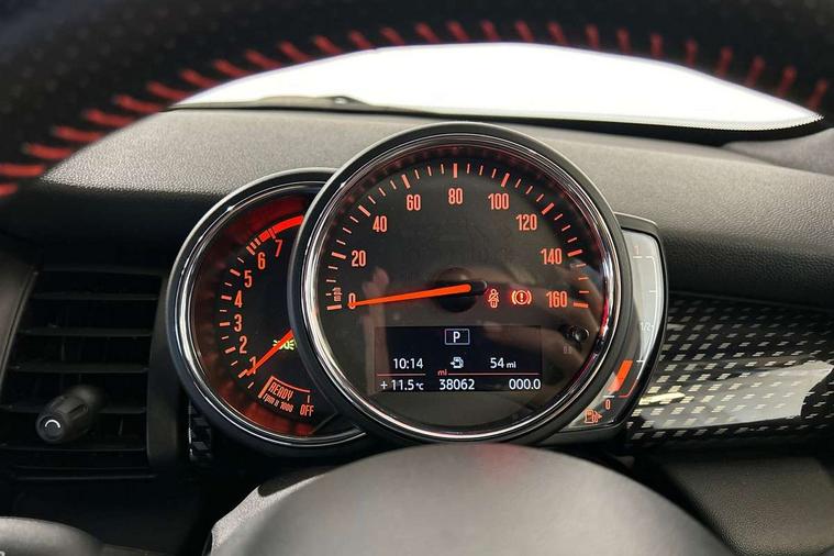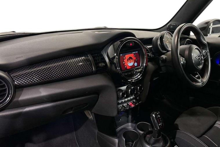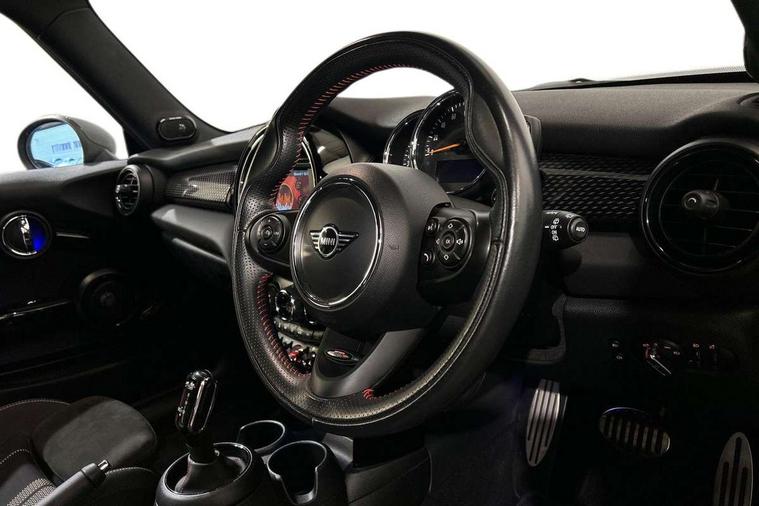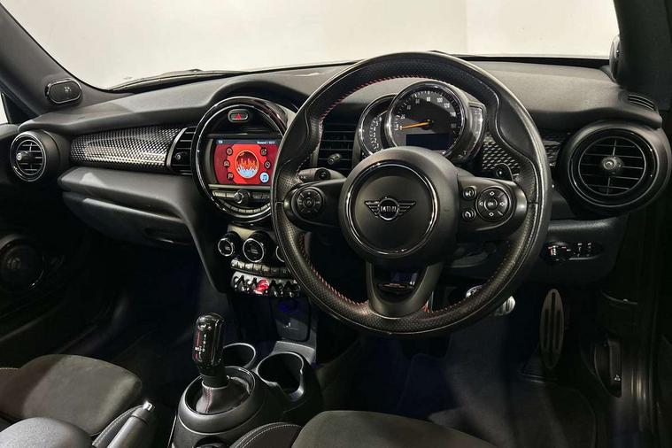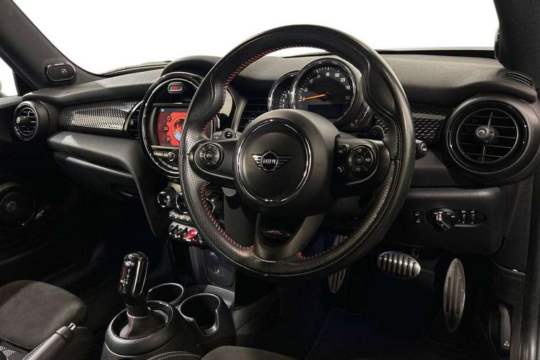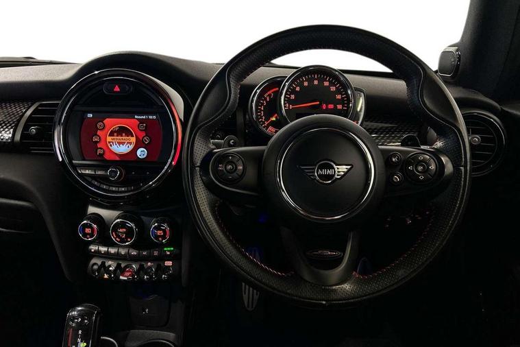 Compatible mobile phone bluetooth with audio streaming, Instrument cluster, Mini E-call, MINI TeleServices, On board computer, Service interval indicator, Performance Control, Steptronic sport transmission with double clutch and steering wheel paddles, 6.5" touchscreen with LED ring, FM tuner and DAB digital radio, Automatic headlight activation switch, Bonnet scoop, Chrome border honeycomb structure radiator grille with S badge, Chrome plated fuel cap, Dynamic brake lights, Electric front+rear windows, Heated rear window, Heated windscreen washer jets, John Cooper Works - aerodynamic kit (front and rear apron, spoiler), front and rear sport bumpers and part-painted side sills with door sill finishers, John Cooper Works rear spoiler, LED headlight with closed ring and daytime driving lights, Metal door sill strips with Cooper S imprint, Model logo Cooper S on right of tailgate, Rain sensor window wipers, Rear fog lights, Rear LED lights with union jack design, Rear window wiper, Side scuttle panel with integrated indicator, Sun/heat protection glass, Two central exhaust tailpipes with chrome finisher, White indicator lenses, 12V Accessory socket in centre console, 4 lashing eyes in luggage compartment, 60/40 split folding rear seat, Anthracite headlining, Chrome interior highlights, Cupholders, Front and rear isofix with front passenger airbag deactivation, Glove compartment, Height and length steering column adjustment, Interior lighting with 12 basic colours selectable via toggle switch in roof, John Cooper Works leather steering wheel with contrasting stitching in Chilli Red with John Cooper Works logo, John Cooper Works Logo in seat, Leather gearshift lever and handbrake gaiters, LED reading lights, vanity mirror lights, front foot well light and spotlight on front seats, Manual air conditioning, Mechanical seat adjustment, driver seat height adjust, forward/back and front seats backrest, Mini logo projection on floor from drivers exterior mirror, Multifunction steering wheel, Storage compartments in doors, Storage pocket on back of front seats, Sunvisors with vanity mirrors, Tool kit, 3 point seatbelts on all four seats, 6 Airbags - front, side, head and seat belt tensioners, Anti-lock braking system (ABS), DSC - Dynamic Stability Control, Front and rear disc brakes, Hill start assist, Two tone horn, Tyre pressure monitoring system, Alarm system with tilt sensor, monitoring doors, bonnet interior and tailgate, Electronic vehicle immobiliser, Start/stop toggle with keyless go,