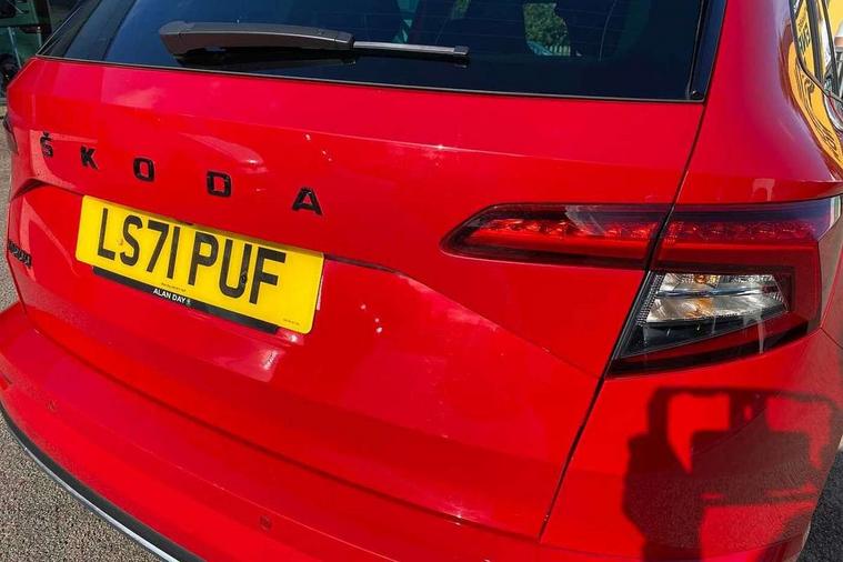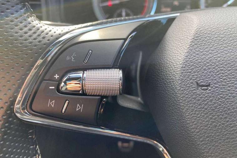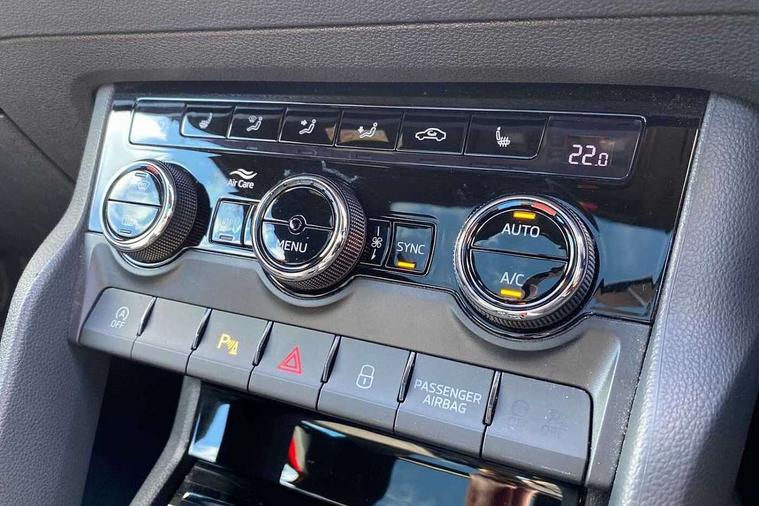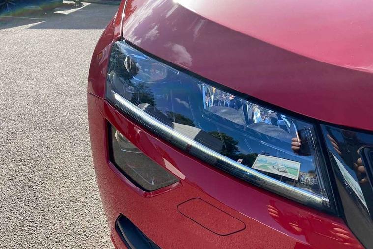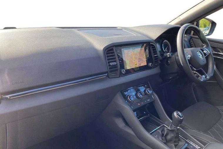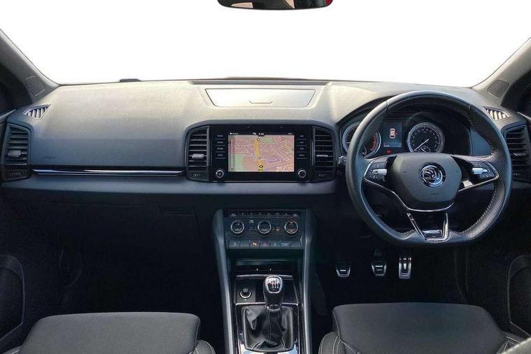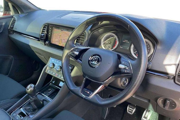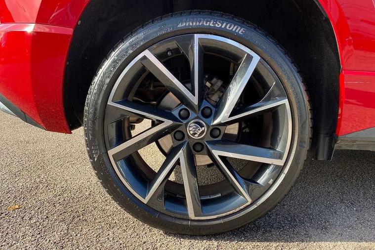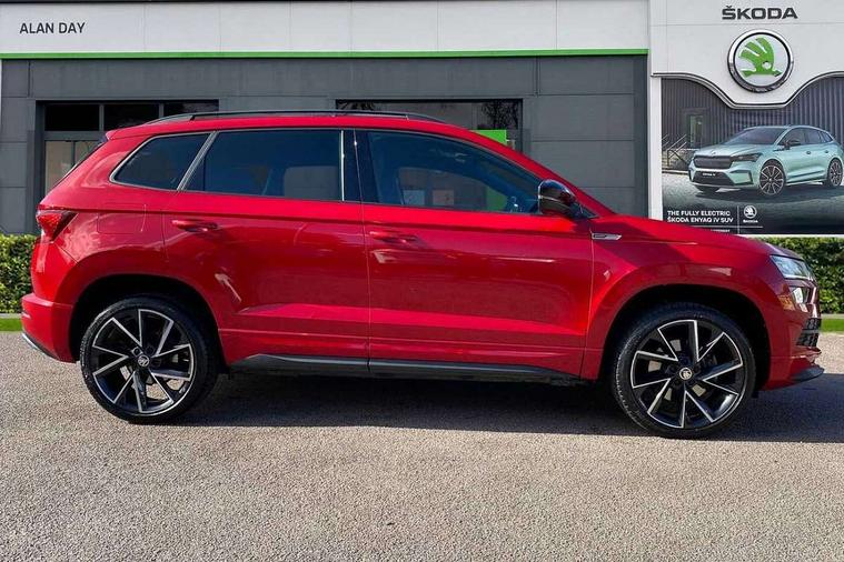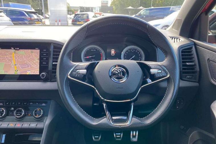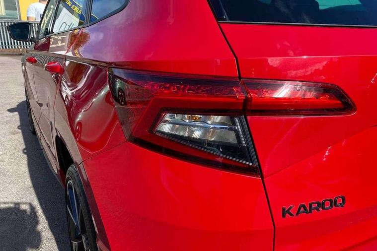 Care connect, Drive mode selector, Driver fatigue sensor, Multifunction colour trip computer, Outside temperature gauge, Service interval indicator, SmartLink wireless for Apple and wired for Android, Start/stop system with regenerative braking, USB C Port x 2 in front centre console, DAB radio with Bluetooth, USB connection, Wireless charging without wireless aerial connection, Acoustic glass, Aero front windscreen wipers with intermittent function, Automatic headlight control system, Black door mirrors, Black electric window control buttons, Black radiator grille, Black roof rails, Body colour door handles, Body coloured bumpers, Electric front and rear windows with child proof lock, Front door steps with SportLine logo, Full LED headlights + adaptive front light system + LED daytime running lights and front cornering fog lights, Headlight washers, Heated rear windscreen, LED rear lights with high functionality, Light assistant (coming/leaving home/tunnel light), Panoramic sliding sunroof, Privacy glass, Protective door side sills in body colour, Rear diffuser, Safety reflectors on front doors, Skoda lettering on tailgate in black, Sportline badge on front fender, Sportline decorative inserts with badging, Sports front and rear bumpers, Third brake light, 1.5 litre bottle holders in driver and front passenger door panels, 12V socket in boot, 12v socket in front centre armrest with storage compartment and rear air vents, 2 Folding hooks and nets in boot, 2 Front readings lights for driver and passenger, 3 rear height adjustable headrests, 4 foldable roof handles with rear coat hooks, Aluminium pedals, Black roof headlining, Cargo elements in boot, Chrome inner door handles, Door sill scuff plates, Driver and passenger seats height adjust, Front head restraints, Height adjustable front three point seats belts with tensioners, Height/reach adjust steering wheel, Ice scraper, Illuminated and cooled glovebox, Illuminated luggage compartment, Isofix child seat preparation outer rear, Manual lumbar support for front seats, Net programme in boot, Pen holder, Pollen filter, Rear reading lights, Rear seats fixed folding and divided 60:40, Retractable parcel shelf attachable to tailgate, Safety vest holder, Solid rear boot cover, Storage box in upper central dashboard closed, Storage compartment below the passenger seat, Sunvisors with illuminated vanity mirrors, Textile floor mats, Umbrella under passenger seat, Welcome animation with sportline logo, LED Interior lighting pack with Skoda welcome logo - Karoq, Airbags - Front side, head, knee and curtain, Automatic door unlocking in case of crash, Automatic fuel cut off in case of crash, Driver airbag, Electronic parking brake with auto hold function, Emergency rear braking signal, ESC including ABS, MSR, ASR, EDS, HBA, DSR, RBS, MKB and traction control, Front assist radar scanning of the space in front of the car with automatic braking, Hill hold control, Passenger airbag with switch-off function, Pedestrian monitor, Seatbelt reminder signalisation and pretensioner for all seats, Three point seatbelts rear, Two tone horn, Tyre pressure display, Tyre pressure monitor, Alarm with interior monitoring, back up horn and tilt sensor with safe function, Electronic engine immobiliser, Keyless entry and keyless start with safe system, Remote central locking with 2 remote folding keys, Black air vent surround, 19" Vega anthracite alloy wheels, Anti-theft wheel bolts protection, Storage on wheel cover,