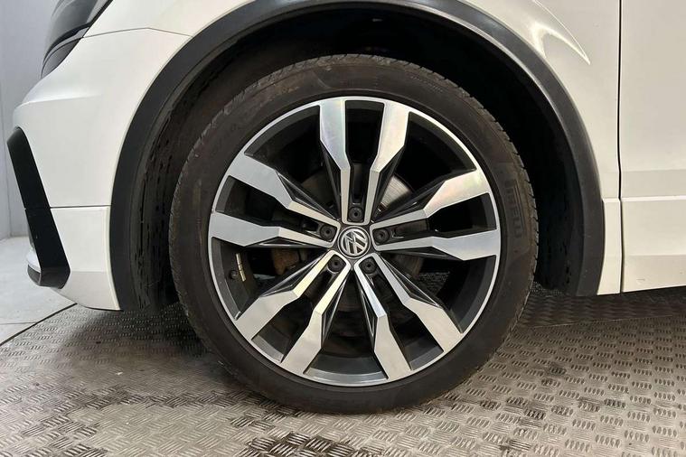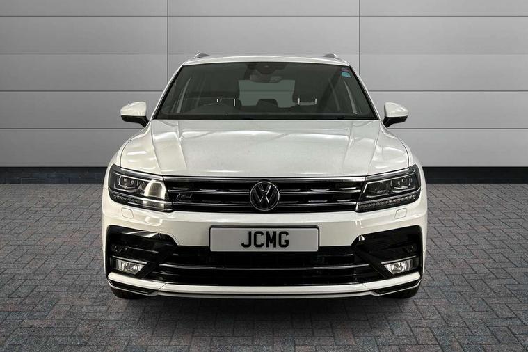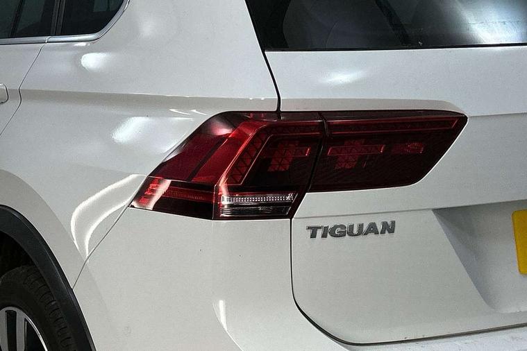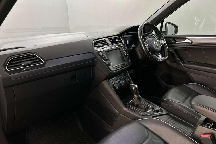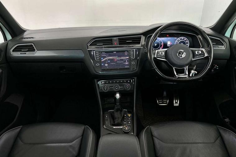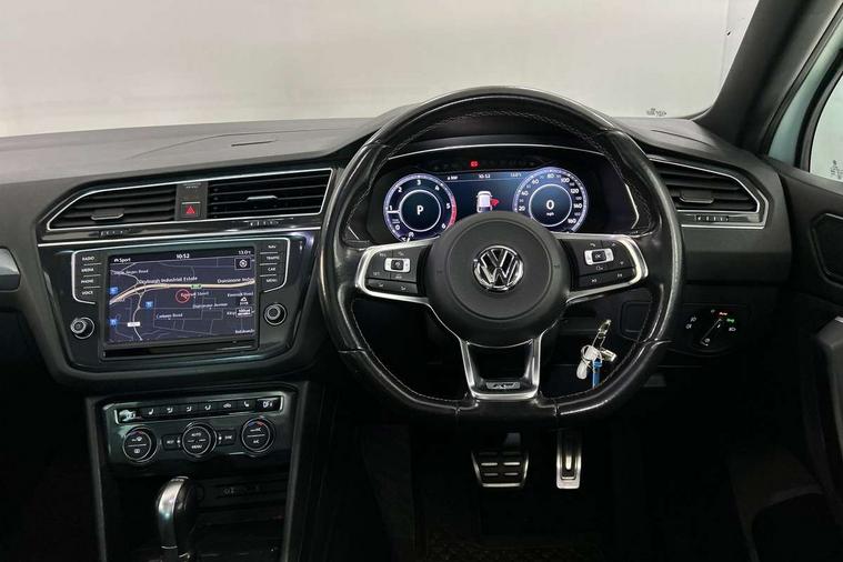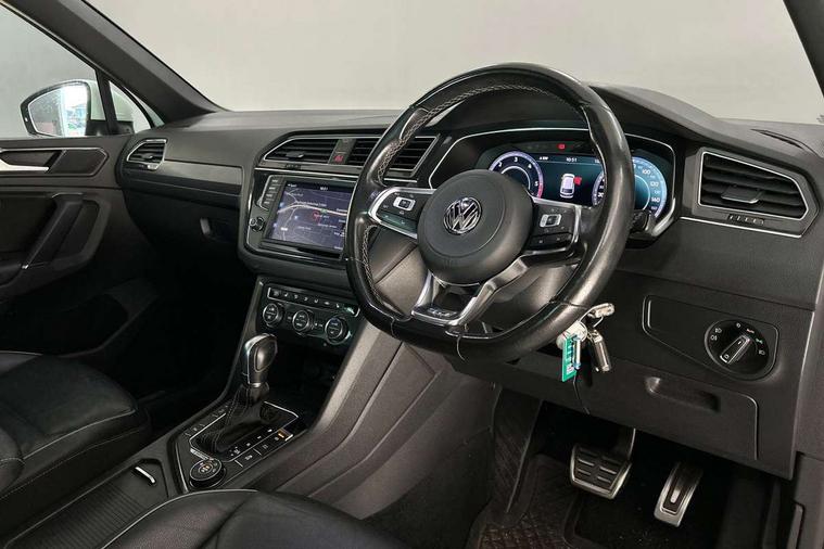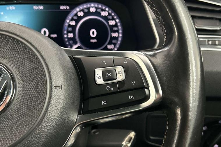 App-Connect, Active information display, Adaptive cruise control, Bluetooth phone integration system, Instrument cluster, Lane assist, Low washer fluid warning light, Outside temperature display, Service interval indicator, Warning lights, Diesel particulate filter, Sports suspension, Aux-in socket, DAB Digital radio, SD card slot, USB connection, Auto dimming interior mirror, Body colour door handles, Body colour door mirrors, Body colour rear spoiler, Body coloured bumpers, Chrome side window surrounds, Chrome trimmed radiator grille, Coming/leaving home lighting function, Dual chrome exhaust, Dusk sensor + auto driving lights, Electric folding door mirrors, Electric heated + adjustable door mirrors, Electric panoramic sunroof with sunblind, Front and rear electric windows, LED headlights with dynamic light assist daytime running lights and cornering front fog lights, Piano black rear diffuser, R Line body kit, Rain sensor windscreen wipers, Silver roof rails, Silver under body guard, Tinted windows (B pillar backwards), Twin trapezoid chrome exhaust pipes, 14 way electric adjustable front seats with drivers memory and massage function, 3 rear headrests, 3 zone climate control, 4 load lashing points, 40:20:40 split folding rear seats, Bag hook in luggage compartment, Black headlining, Driver + front passenger lumbar support, Front + rear carpet mats, Front centre armrest with 12v socket, Front centre armrest with storage + rear 2 air vents + cupholders, Front seatback folding tables, Height adjustable front seats, Height/reach adjust steering wheel, Illuminated driver/passenger vanity mirrors, Illuminated scuff plates, Interior light with delay, Isofix Preparation 2 Rear child seats, Leather gear knob, Leather multifunction steering wheel with paddle shift, Lockable cooled glovebox, Luggage compartment lighting, Map pockets on front seats, Rear cupholders, Removable luggage cover, Sliding/reclining rear seats, Stainless steel pedals, Storage compartment in driver's door, Storage compartment in passenger's door, Storage drawers under front seats, Storage tray on dashboard, Sunglasses storage, Variable boot floor, Ambient lighting pack - Tiguan, 3 rear 3 point seatbelts, ABS+EBD+Brake assist, Active bonnet, Active pedestrian safety system, Curtain airbags, Driver/Front Passenger airbags, Driver/Passenger whiplash optimised head restraints, Drivers knee airbag, Electronic parking brake with auto hold, ESP with EDL + ASR, First aid kit, Front assist including city emergency braking, Front side airbags, Head airbag system, Height adjustable front 3 point seatbelts + pretensioners, Hill hold control, Passenger airbag deactivate switch, Passenger knee airbag, Pre crash system, Rear side airbags, Seatbelt warning lamp and buzzer, Warning triangle, Alarm with interior protection, Electronic engine immobiliser, Chrome door trim inserts, Piano black interior trim, 20" Suzuka alloy wheels + anti theft wheel bolts, Steel space saver spare wheel,