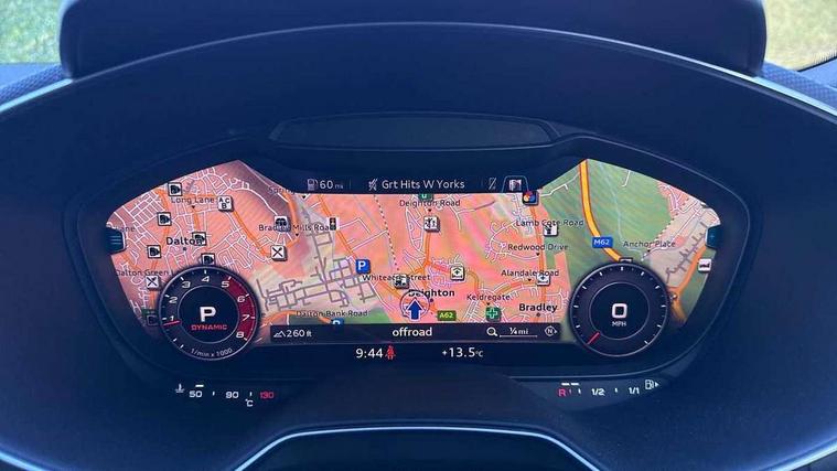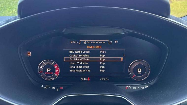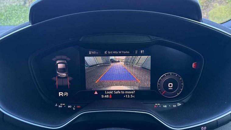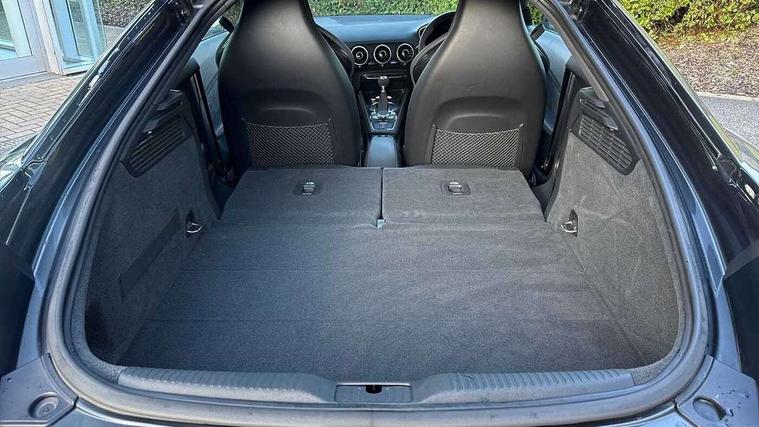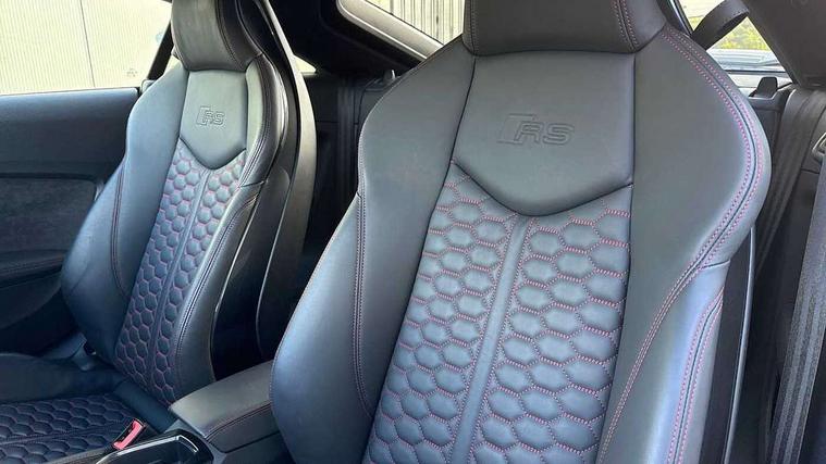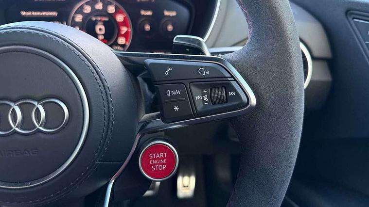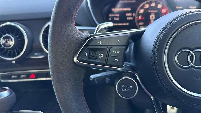 Audi active lane assist, Audi connect, Audi drive select, Audi parking system plus with front and rear sensors, Audi phone box, Audi smartphone interface, Audi Virtual Cockpit with sport gauge, Cruise control + speed limiter, MMI Navigation plus, MMI touch panel, Mobile phone preparation with bluetooth interface, Progressive power assisted steering, Service interval indicator, Start/stop system, Audi magnetic ride, TT RS specification sports suspension, Audi sound system, Auxiliary input socket, Bluetooth audio streaming, DAB Digital radio, MMI Radio with CD player and SD/XC card slot, All weather LED headlights, Auto dimming rear view mirror, Auto headlight range control, Black door mirrors, Electric front windows, Electrically adjustable, foldable and heated auto dimming on driver side and automatic kerb view dipping function on the passenger side, Front spoiler, Green tinted heat insulating glass, High beam assist, LED daytime running lights, LED rear lights, Light and rain sensors, Privacy glass, RS design body styling, RS sport exhaust system, Sunband for windscreen, TTRS fixed rear wing, Twin oval tailpipes, 3 spoke flat bottomed alcantara sports leather multifunction steering wheel including paddle shift, Alcantara gear knob gaiter, Aluminium door sill trims, Black headlining, Deluxe auto air conditioning with integrated digital display, Electric lumbar support, Extended aluminium look with stainless steel pedals, Front centre armrest, Front head restraints, Front passenger seat isofix location point, Heated front seats, Height adjustable driver's seat, Height/reach adjust steering wheel, Interior elements in slate grey, ISOFIX on outer rear seats, Rear head restraints, Split folding rear seat, Top tether anchor plate for isofix child seat, TTRS badge on the steering wheel, TTRS exhaust sound button in centre console, Black styling pack - TT RS Sport, Extended leather package - TT RS, LED interior light pack - TT/TT RS, Non smoking pack - TT/TT RS, 3 point front seat belts, ABS, ASR traction control, Curtain airbags, Driver and front passenger airbag with front passenger airbag deactivation, EDL traction control, Electromechanical parking brake, ESP, First aid kit, Front side airbags, Head airbags, Hill hold assist, RS brake system, Seatbelt warning, Warning triangle, Anti theft alarm, Anti theft wheel bolts, Immobiliser, Keyless Go, Remote central locking, Carbon inlays, 20" 7-spoke rotor design alloy wheels in gloss anthracite black, diamond cut finish, Tool kit, Tyre repair kit,