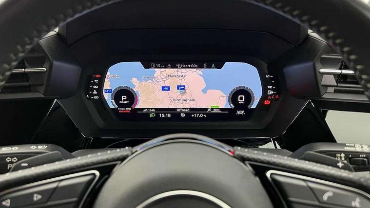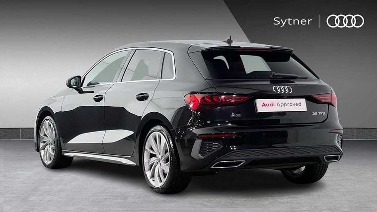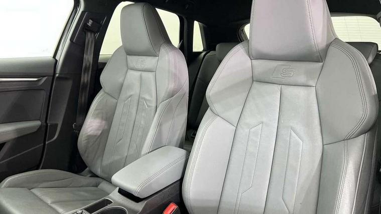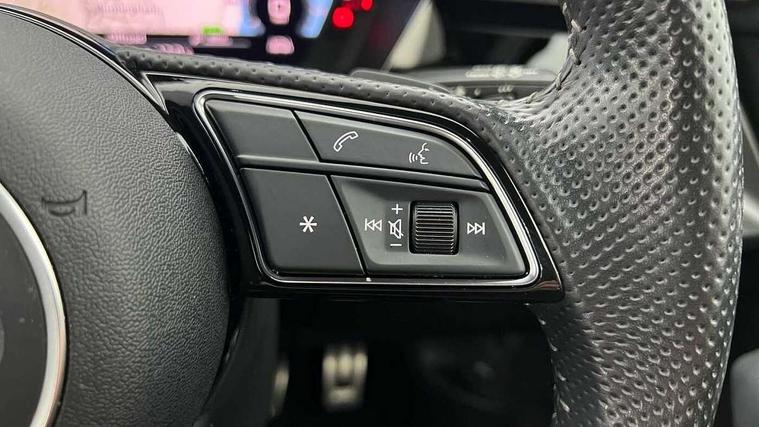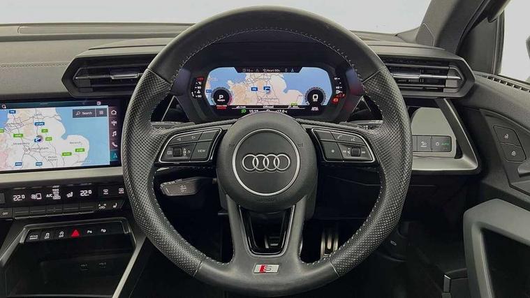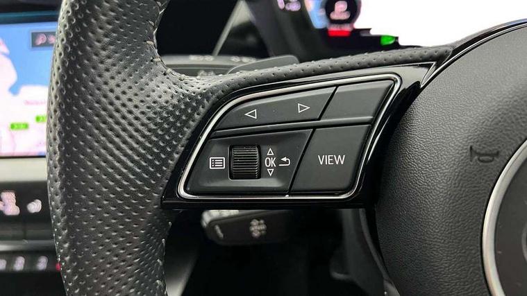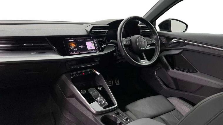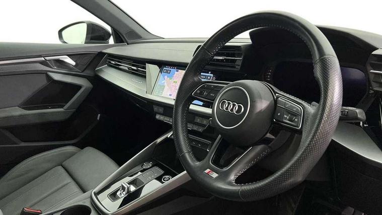 Audi connect emergency call and service, Audi drive select (Auto, Comfort, Dynamic, Efficiency and Individual), Audi smartphone interface, Audi Virtual Cockpit - 10.25" digital and colour instrument cluster, Automatic start/stop system with recuperation, Bluetooth interface, Collision avoidance assistant, Electromechanical power speed sensitive steering, Lane departure warning system, MMI Navigation Plus with high resolution 10.1" colour touch screen display, Service indicator, Trip computer, Voice control system with natural language interaction, 1xUSB-A and 1xUSB-C connection, 6 passive loudspeakers, DAB Digital radio, Acoustic glass windscreen, Aluminium window trim, Auto dimming frameless rear view mirror, Body colour exterior mirrors, Electrically adjustable/heated/folding/dimming door mirrors with kerb view includes integrated LED indications + kerb view function for passenger side, Front electric windows, Illuminated aluminium inserts front door sills with S logo, LED daytime running lights, Light and rain sensors, Privacy glass - dark tinted rear window, rear door and side windows, Rear electric windows, Rear side air outlets in grained matt black, Rear wiper, S line bumpers, S roof spoiler, 12V socket and storage compartment in front centre console, 40/20/40 split folding rear seat bench with cupholder, Black cloth headlining, Dual zone electronic climate control, Front and rear centre armrest in leather, Front and rear headrests, Front/rear floor mats, Height and reach adjustable steering wheel, Interior lighting - glove compartment light and right hand side, Luggage compartment floor covering, Manual boot compartment lid, Manually adjustable front seats, Seat side bolsters, Stainless steel pedals and front footrest, Twin leather upholstery with front sports seats S embossed logo, Aluminium interior elements pack - A3 Sportback, S line styling pack - A3 Sportback, 3x3 point rear seat belts, Driver and front passenger airbag with passenger airbag deactivation, Electronic Stabilisation Control (ESC) including ABS, ASR and EDL, First aid kit with warning triangle and 2 safety vests, Hill hold assist, Pre-sense front with pedestrian and cyclist detection, Seatbelt monitoring, Tyre pressure loss indicator, Anti theft alarm, Anti-theft wheel bolts, Electronically operated child lock, Immobiliser, Remote control central locking, Accent surfaces in the dashboard and centre console in platinum grey silk effect paint finish, Dark spectrum aluminium inlays,