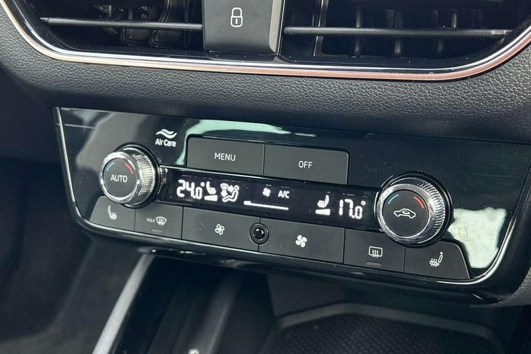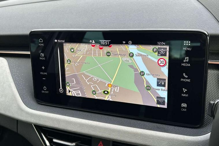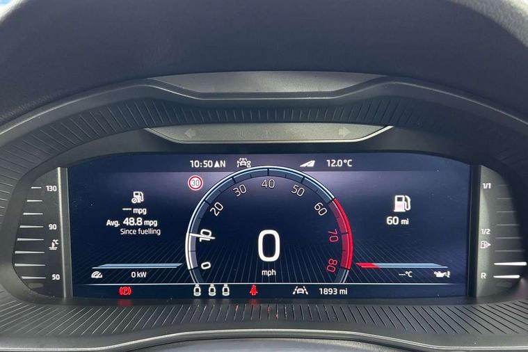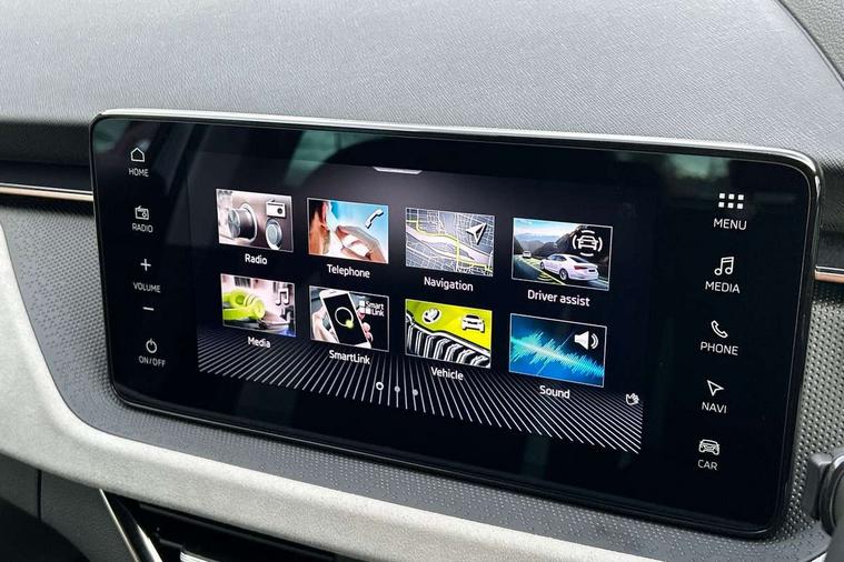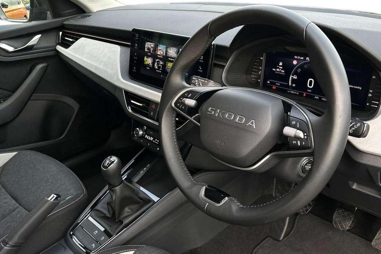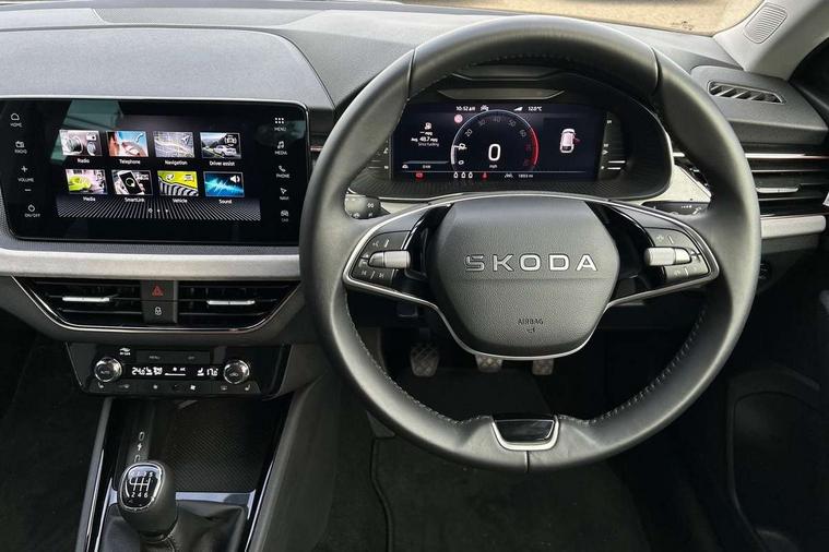 Advanced driver attention and drowsiness monitor, Bluetooth, e-Call (emergency call), Front assist system, PAS, Rear parking sensors, Rear view camera, Speed limiter, Tailgate, Traffic sign recognition, Virtual Cockpit - 10.25" digital display, Voice control system, Wireless smartlink, 4 USB C ports, 8 Speakers, 9.2" Skoda navigation display, DAB radio, Auto dimming rear view mirror, Automatic headlamp activation with Coming home and Leaving home feature, Automatic high/low beam, Automatic intermittent wipers, Body colour bumpers, Body colour door mirrors and handles, Chrome moulding around grille, Chrome window frames, Front and rear electric windows, Heated rear window, LED 3rd brake light, LED brake lights, LED daytime running lights, LED front turning lights, LED high beam, LED low beam, Light sensors, Privacy glass, Rear LED fog light, Rear side wing doors, Rear wiper, Tinted windows, Unique dark chrome design logo on alloy wheels, 12V socket in luggage compartment, 3 seat bench in 2nd row, Ambient lighting in white/red, Black / Copper armrest stitching, Cargo elements, Chrome inner door handles, Copper hotstamping, Door inserts in accent black, Driver and passenger sun visors with vanity mirror, Dual zone climate control, Front and rear roof lights, Front centre armrest, Front head restraints, Glasses storage in roof liner, Height adjustable driver seat, Height adjustable passenger seat, Ice scraper, Illuminated glove compartment, Inner circulation control with pollen filter, ISOFIX for front passenger seat, Isofix preparation for back seats, Leather gearknob and handbrake lever, Lodge cloth upholstery, Luggage net under rear parcel shelf, Manual lumbar support for front seats, Net package and top tether hooks in boot space, Pearl grey ceiling, Pocket on the back of both front seats, incl. mobile phone pockets, Rear centre armrest, Single front passenger seat, Skoda lettering on steering wheel, Textile floor mats, Third rear headrest, Ticket holder, Top tether for front passenger seat, Umbrella in driver's door, Convenience pack without rear camera - Scala, 3x3 point rear seatbelts, ABS, Child locks, Curtain airbags and front side airbags, Disc brakes, Driver and front passenger airbags, ESP, Hill hold control, Manual leather parking brake, One tone horn, Passenger airbag switch off function, Seatbelt reminder for driver and front passenger, Tyre pressure monitoring system, Anti theft alarm system with interior monitoring, backup horn and towing protection, Anti-theft wheel bolts, Remote central locking with 2 remote folding keys, SAFE function for remote central locking, Decorative inserts,
