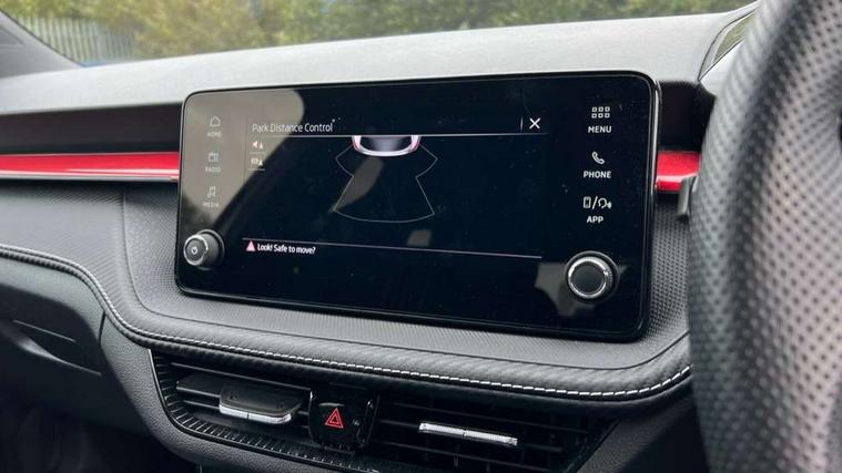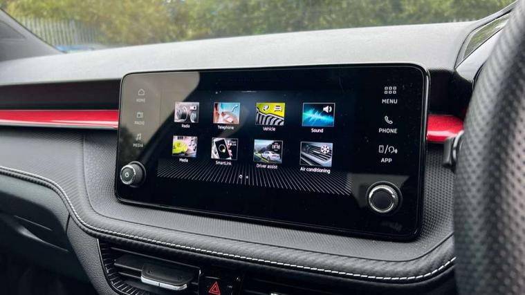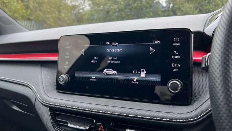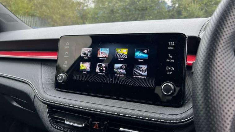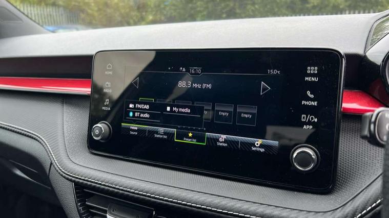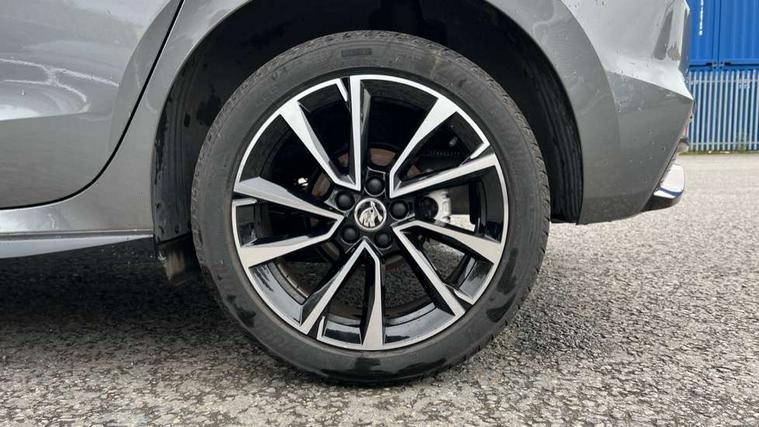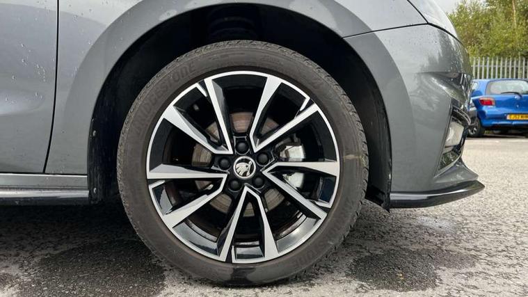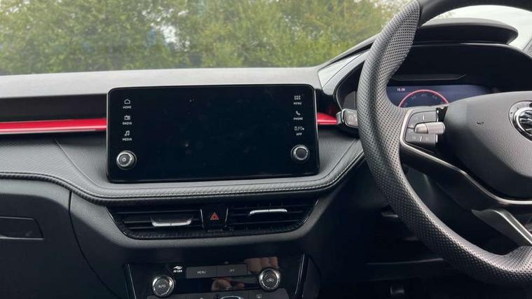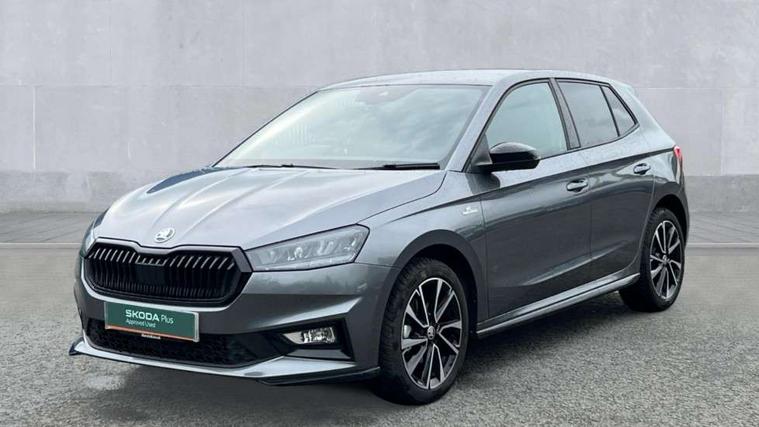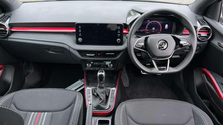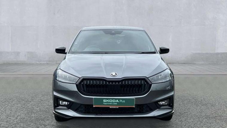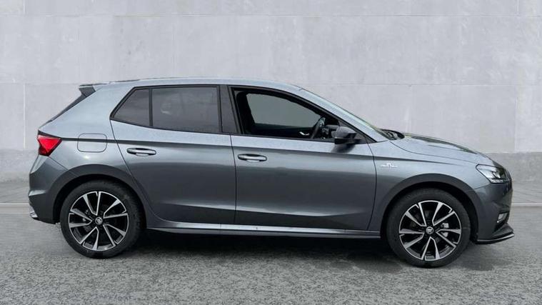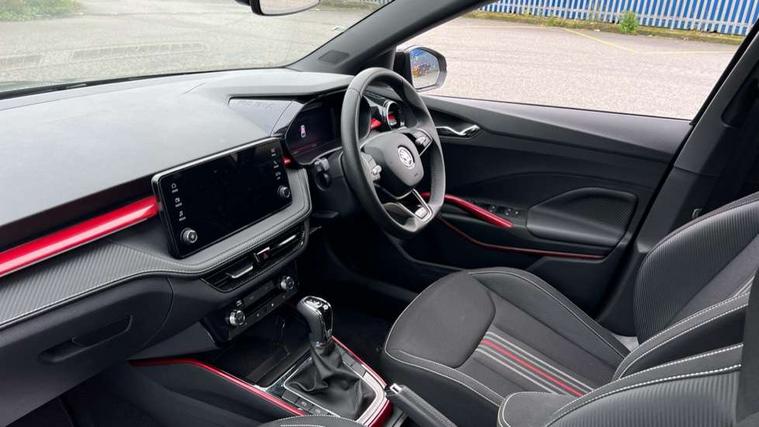 Advanced driver attention and drowsiness monitor, Bluetooth connection, Electromechanical power steering, Exterior temperature gauge, Service interval indicator, Traffic sign recognition, Virtual cockpit with 10.25" colour display, Wireless SmartLink for Apple CarPlay and Android Auto, 6 Speakers (4 in front and 2 in rear), Auxiliary socket for external MP3 player, DAB digital radio reception, Auto dimming rear view mirror, Black radiator grille, Body coloured bumpers, Door mirror integrated indicators, Front and rear electric windows, Front window wiper intermittent control, Headlight range control - Automatic, Ice scraper in fuel cap, LED daytime running lights with coming and leaving home feature, LED rear lights, Monte Carlo badging, Privacy glass, Rear LED fog light, Rear side wing doors, Rear window wiper with washing nozzles, Roof mounted spoiler, SKODA tailgate lettering in black, Sports bumpers, Third brake light, 2 reading lights in front and 2 reading lights in rear, 3 rear headrests, Aluminium pedals, Backrest split and folding, Black headlining, Central console with removable cup holder and storage box, Chrome handbrake release button, Door sills with fabia badging, Dual zone air conditioning with climatronic electronic control, Fabric/artificial leather upholstery, Front centre armrest, Front sports seats, Gearshift knob/handle in leather, Hand brake lever handle in leather, Height adjustable front headrests, Height adjustable front seats, Height adjustable steering wheel, ISOFIX and TopTether anchorage points to the outer rear seats, ISOFIX and TopTether on the front passenger seat, Luggage compartment lighting, Manually adjustable lumbar support in front seats, Metallic painted red central console cover, Metallic red interior door handles, Pollen filter, Rear seat bench unsplit, Single front passenger seat, Sun visors with mirror and airbag label on passenger side, Textile floor mats, Ticket holder, Umbrella in drivers door, 3-point height adjustable front seats belts with pretensioner and force limiter, Automatic warning lights in case of crash, Driver and passengers airbag with switch off function, e-Call+, ESC including ABS, MSR, ASR, EDS, HBA and XDS, Front and rear seat belt warning, FRONT ASSIST (AEB City and AEB Inter Urban), Front side airbags, Head airbags, Hill hold control, One tone horn, Pedestrian protection, Three rear 3-points safety seat belts with pretensioner and force limiter including stop function for outer rear seat belts, Tyre pressure monitoring system, Anti-theft alarm system including immobiliser, interior monitoring, backup horn, and towing protection, Central locking with radio remote control, interior controls, SAFE function and 2 foldable keys, Carbon effect door and side trim panels, Carbon effect lower decorative trim with white stitching, Monte carlo air vents, Red metallic upper decorative trim, Anti-theft wheel bolts protection, Super-low rolling resistance tyres,