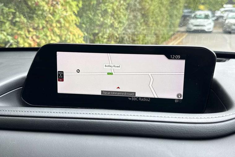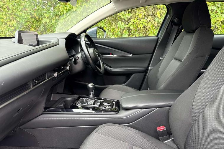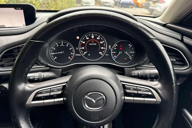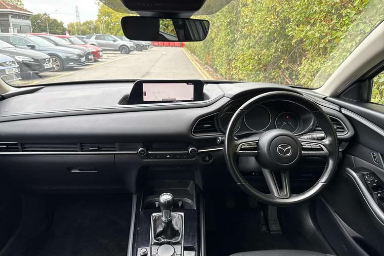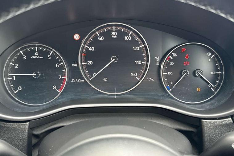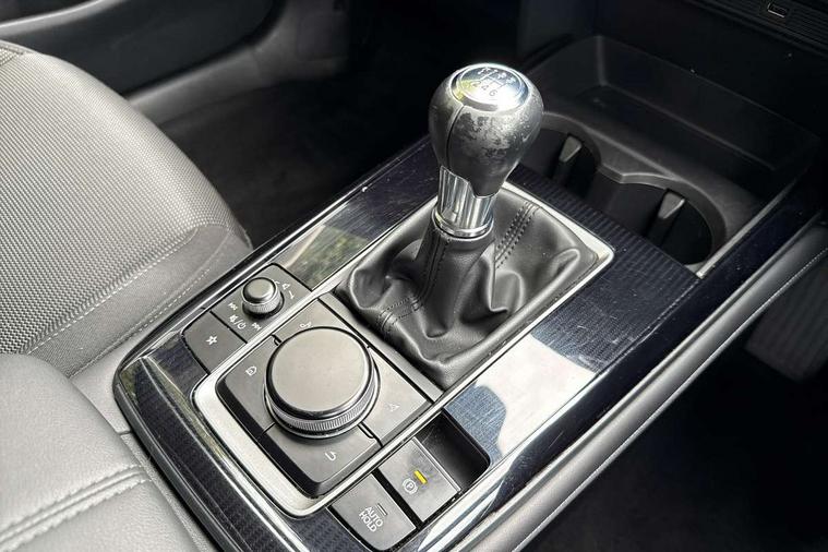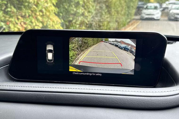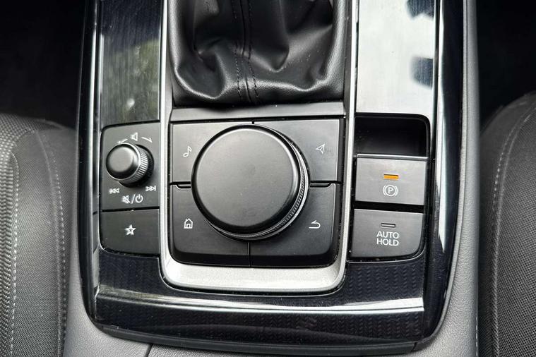 7" TFT Colour driver instrument panel display, 8.8" Colour centre touch screen display with Mazda Connect infotainment, Adaptive cruise control (Mazda radar cruise control), Apple car play/Android Auto, Blind spot monitoring with rear cross traffic alert, Driver attention alert system, E-call with GPS, Emergency stop signalling system, Engine start/stop button, Front and rear parking sensors, Integrated bluetooth, Integrated Mazda navigation system, Intelligent speed assist, Lane keep assist system (LAS) with Lane departure warning system (LDWS), Mazda connected services, PAS, Reversing camera, Service indicator, Traffic sign recognition, Trip computer, i-stop, 2 USB charging ports in front inner central armrest, AM / FM / DAB radio with 8 speakers, Multimedia Commander including separate volume dial, Steering wheel mounted audio/bluetooth controls, B-pillar and C-pillar garnishes in satin black finish, Auto dimming driver's door mirror, Auto dimming rear view mirror, Auto headlight levelling, Body coloured, electrically adjustable, heated auto power folding door mirrors with integrated indicators, Chrome finish signature wing in front grille, Coming/leaving home lighting function, Dual chrome exhaust, Dusk sensing headlights, Electric front/rear windows with one touch auto up/down, Front kodo turn signal, Gloss black rear roof spoiler, LED headlights with halogen daytime running lights and high beam control, LED rear combination lights, Rain sensing front wipers with adjustable speed and intermittent wipe, Rear fog lights, Rear wiper, Satin black front grille, 12V power outlet in centre console, 60/40 split fold down rear seats, Cloth upholstery with interior accents, Dark cloth door panel inserts, Dashboard, door cards and front centre armrest in black cloth, Driver and front passenger visors with covered vanity mirror and driver ticket holder, Driver seat manual slide, recline, height and seat tilt adjust, Driver, front passenger and two rear door storage, Driver, Front passenger and two rear grab handles with coathooks, Dual zone climate control air conditioning with rear air vents, Folding rear centre armrest with two cup holders, Front and rear (x3) head restraints, Front and rear LED lighting, Front armrest, Front centre storage with two cupholders, Front passenger seatback pockets, Front passengers seat manual slide, recline and height adjustment, Gear shift indicator, Glovebox illumination, Heated front seats with 3 stage setting, ISOFIX child seat anchorage points attached on outer rear seats, Leather wrapped gear shift knob, Leather wrapped steering wheel with telescopic and tilt adjustment, LED luggage compartment lighting, Light roof headlining and pillars, Roof mounted sunglasses holder, 3 point ELR front seat belts x2 with pretensioners, 3 point ELR rear seat belts, Anti-lock braking system (ABS), Drivers knee airbag, DSC - Dynamic Stability Control, Electronic parking brake with auto disengage function and auto hold function, Front and rear curtain airbags, Front dual stage driver and single stage front passenger airbags, Front passenger airbag cut-off switch, Front side airbags, Front smart city brake support, G-Vectoring control plus, Hill launch assist, Mild Hybrid system with regenerative braking, Seatbelt reminder for driver/front passenger and rear seats, Traction control system (TCS), Tyre pressure monitoring system (TPMS), Remote central locking with deadlocking and automatic door lock when driving, Smart keyless entry, Thatcham accredited alarm and immobiliser, 16" Grey alloy wheels, Emergency tyre repair kit,