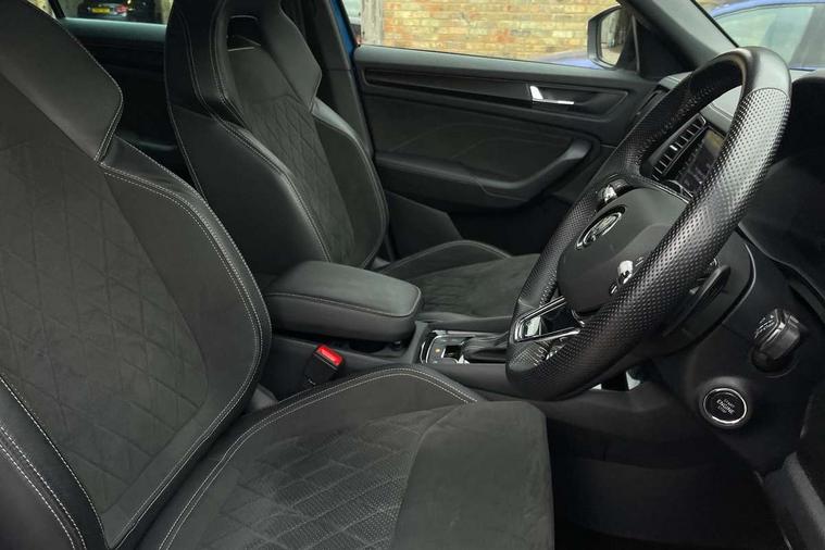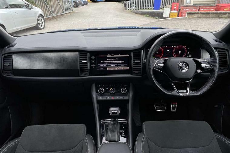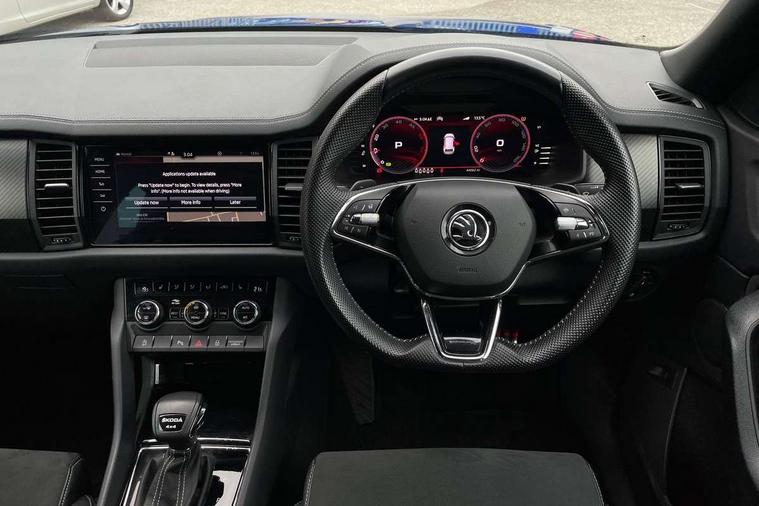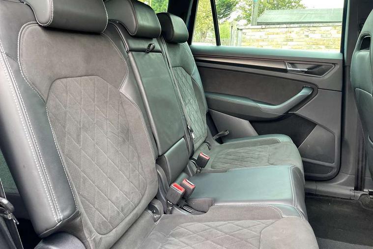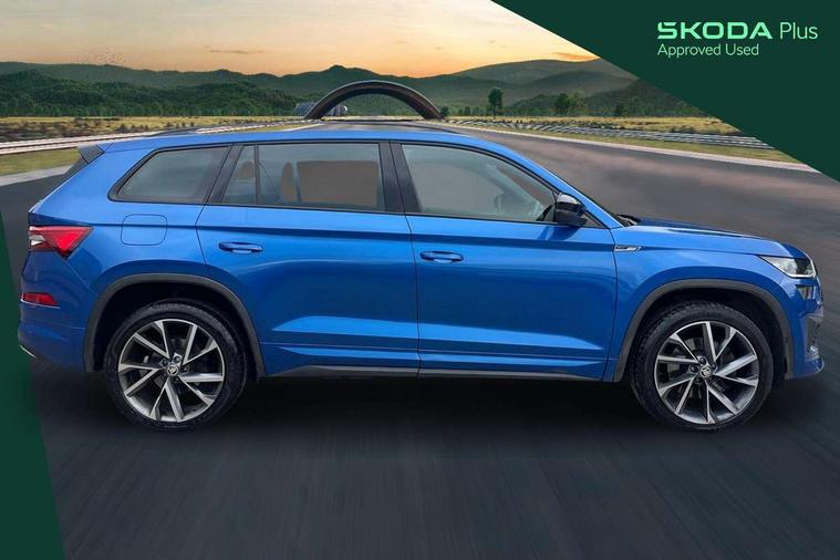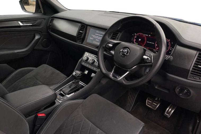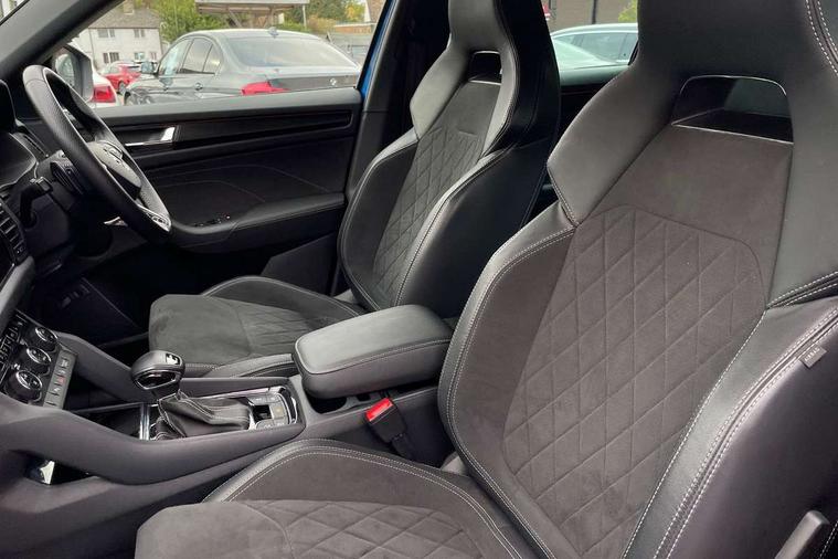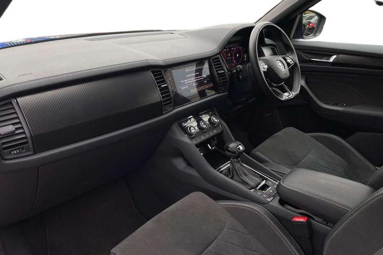 Bluetooth system, Columbus satellite navigation with 9.2" touchscreen, integrated Wi-Fi, web radio, Digital voice enhancement, E-call, ECO Stop/start function, Exterior temperature indicator, Progressive steering, Rear view camera, Smartlink wireless for apple carplay and wired for android auto, Speed limiter, Tailgate unlocking from outside, USB C Port x 2 in front centre console, Wireless charging, 8 Speakers, DAB Digital radio, Aero front windscreen wipers with intermittent function, Aero rear window wiper, Auto dimming rear view mirror, Black roof rails, Black sports styling including front grille and window surrounds, Black wheel arch surrounds, Body colour bumpers, Body colour door handles, Electric adjustable/heated/folding door mirrors, driver side auto dimming with boarding sports and memory function, Electric front and rear windows, Extended rear spoiler with finlets in gloss black, Front fog lights, Full LED matrix headlights with AFS (adaptive front light system), cornering function and AWL (all weather lighting system), Gloss black door mirrors, Headlight washers, Heated rear window, Invisible tailpipe, LED daytime running lights, LED rear fog light, LED third brake light in rear spoiler, Light assistant (coming/leaving home/tunnel light), Off-road style lower front bumper element, Privacy glass, Rain and light sensors, Rear diffuser, Rear LED lights (high functionality) with welcome effect and dynamic indicators, Rear side wing doors, Safety reflectors on front and rear doors, Sportline badge on front fender, Sports front and rear bumpers including lower rear chrome strip, Tailgate lettering in Black, Window control switches with black trim, Without engine designation, 12V socket in boot, 2 rails with 2 hooks, 2 seat bench in 3rd row, 3 seat bench in 2nd row, 4 foldable roof handles with rear coat hooks, 60:40 foldable rear seat with sliding adjustment and backrest angle adjustment, Aluminium pedals, Black roof headlining, Bottle holders in door panel in the 1.5 litre front and 1 litre rear, Cargo storage compartments, Chrome headlight control button, Chrome interior door handles, Coat hooks on B pillar, Covered storage compartment on driver side, Front centre armrest with storage compartment, cup holder and 12V socket, Front courtesy lights, Gear shift lever with chrome frame and black gloss insert, Grey stitching in front and rear armrests and door armrests + door inserts, Height adjustable front headrests, Illuminated and cooled glovebox, Illuminated luggage compartment, Isofix child seat fittings in outer rear seats with top tether, Manually adjustable steering column, Microsuede door panels, Net programme in boot (1x horizontal Net, 2x vertical Nets), Overhead glasses storage compartment, Pollen filter, Rear centre armrest with cupholders, Single front passenger seat, Sliding trunk cover, Small Bags on the inner sides of the front backrests, Sports seats, Sunvisors with illuminated vanity mirrors, Three rear height adjustable headrests, Ticket holder on A Pillar, Umbrella in door panel, Variable boot floor, LED Interior light pack - Kodiaq, Auto door release and activation of warning lights in the event of an accident, Child locks on rear doors, Driver and front passenger airbag with knee airbag and front passenger airbag deactivation, Electronic parking brake with hill start assist, Emergency rear braking signal, ESC (incl. ABS+MSR+ASR+EDS+HBA+DSR+RBS+MKB), Front assist with autonomous emergency braking, Front side airbags with curtain airbags, Fuel cut off safety device, Height adjustable front 3 point seatbelts + pretensioners, Hill hold control, Rear disc brakes, Safety vest holder in door, Seat belt reminder for all seats, Three point rear seat belts, Two tone horn, Tyre pressure monitor, Alarm with interior monitoring and tilt sensor with safe function, Anti-theft wheel bolts, Immobiliser, Keyless entry and start system (KESSY), Remote central locking with 2 keys, Black air vent surround, Carbon finish dashboard and door inserts, Grey stitching in dashboard, 20" Vega Anthracite alloy wheels, Temporary spare wheel (space saver),