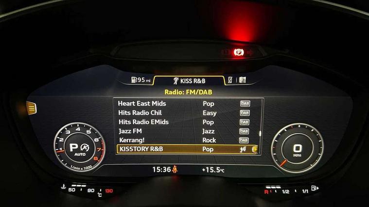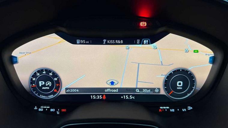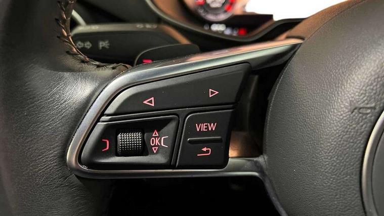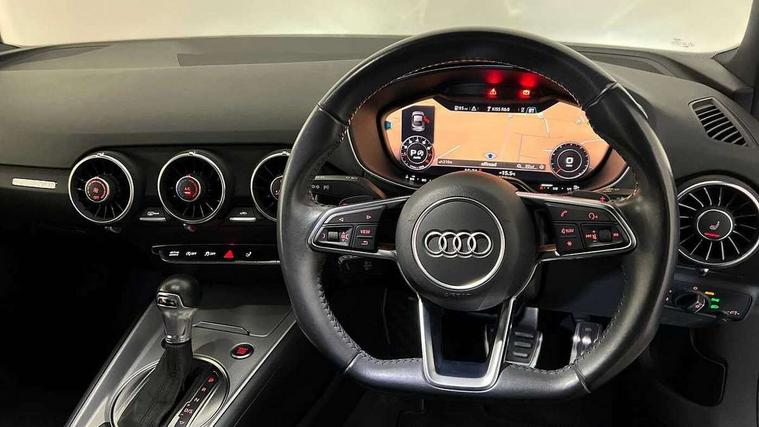 Audi drive select with 4 Pre configured modes, Audi virtual cockpit - 12.3" high-resolution LCD display with fully customisable instrument cluster, Cruise control + speed limiter, MMI touch panel, Mobile phone preparation with bluetooth interface, Progressive power assisted steering, Rear parking sensors, Service interval indicator, Start/Stop system with energy recuperation, TP memo, Sports suspension, 8 speakers, AM/FM radio, Audi music interface, Bluetooth audio streaming, DAB Digital radio, MMI Radio with CD player and SD/XC card slot, Auto dimming rear view mirror, Body colour bumpers, Body colour electrically adjustable and heated door mirrors with built in LED side indicators, Electric folding door mirrors, Electric front windows, Front fog lights, Green tinted heat insulating glass, Light and rain sensors, Retractable rear spoiler, Sunband for windscreen, 12V socket, 3 spoke flat bottomed high multi-function leather sport steering wheel with gearshift paddles, Alcantara/Leather upholstery includes seat centre panels, door trim inserts in black Alcantara with side bolsters, head restraints in black leather, Aluminium door sill trims, Front centre armrest, Heated front seats, Height adjustable driver's seat, Height adjustable front head restraints, Height/reach adjust steering wheel, ISOFIX child seat mounting for front passenger seat with airbag deactivation, Reading lights, Rear top tether child seat ISOFIX attachment, Split folding rear seat, Tool kit, Top tether anchor plate for isofix child seat, Non smoking pack - TT/TT RS, 3 point front seat belts, ABS, ASR traction control, Brake energy regeneration, Curtain airbags, Driver and front passenger airbag with front passenger airbag deactivation, EDL traction control, Electromechanical parking brake, ESP, First aid kit, Front side airbags, Head airbags, Hill hold assist, Seatbelt warning, Tyre pressure warning, Warning triangle, Anti theft alarm, Anti theft wheel bolts, Immobiliser, Keyless Go, Remote central locking, Aluminium design inlays, Tyre repair kit,