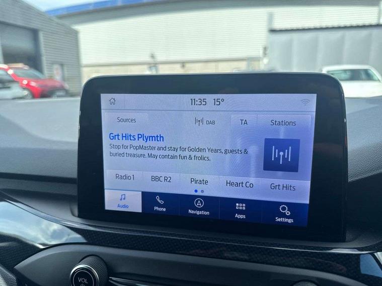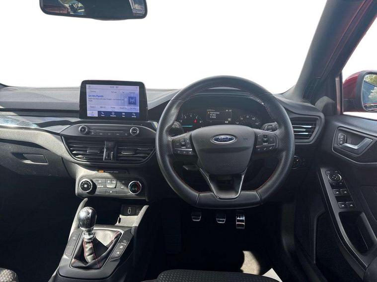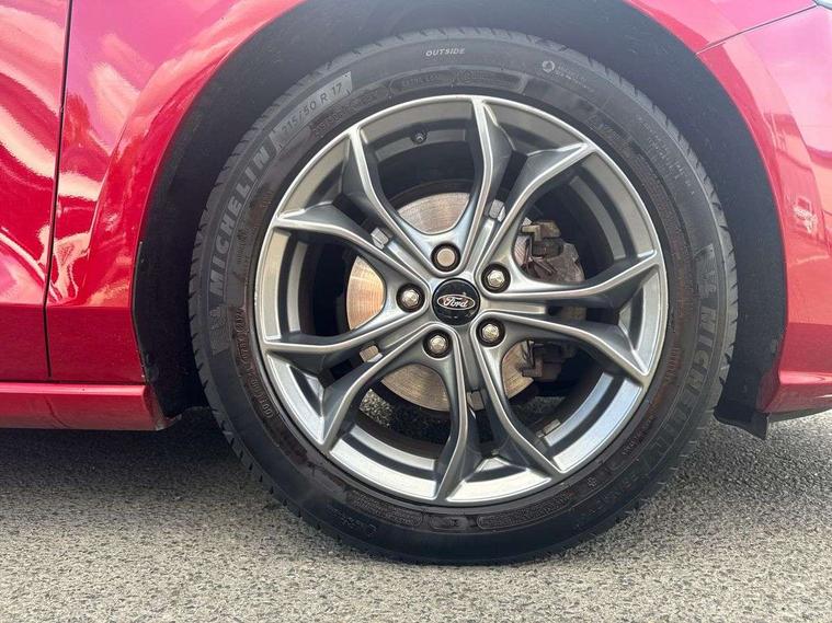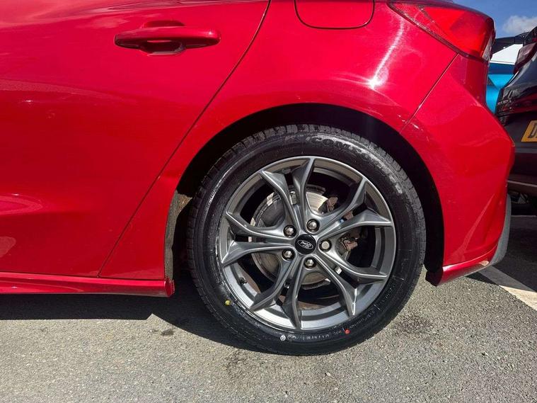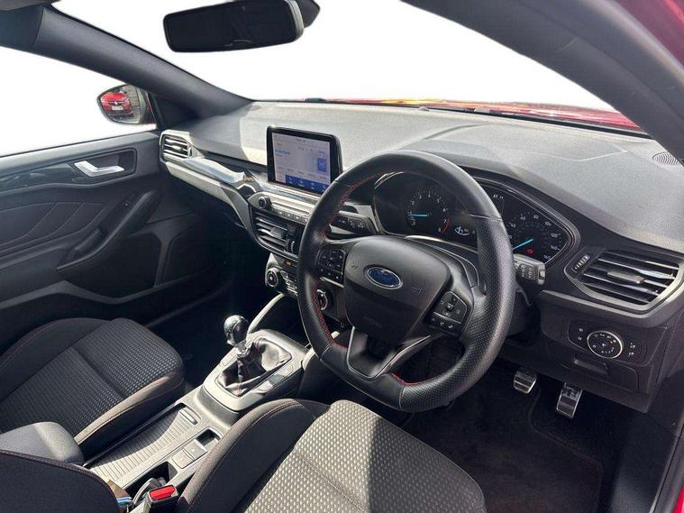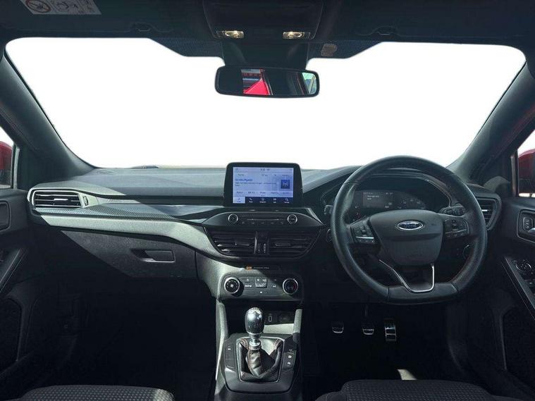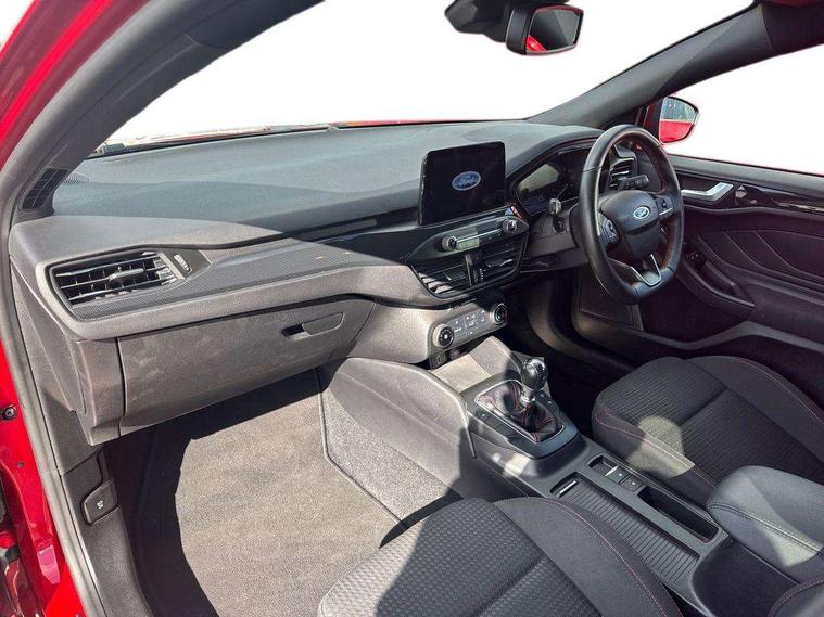 4.2" TFT coloured cluster, Bluetooth system, Digital clock, Easy fuel capless refuelling system, Eco mode, Ford SYNC 3 navigation with 8" TFT touchscreen, DAB radio and app link Android auto/Apple carplay, Intelligent speed assist, Lane keeping system - lane keeping alert and lane keeping aid, PAS, Selectable drive mode, Trip computer, Wireless charging pad, Sports tuned suspension, 2 USB ports, Aux input, Auto dimming rear view mirror, Auto headlamps (on/off), Automatic rain sensing wipers, Body colour large rear spoiler, Body coloured bumpers, Body coloured door handles, Body coloured electrically operated and heated door mirrors with side indicators, Electrically operated front and rear windows with one touch opening and closing, Front variable intermittent wipers with electric wash, Heated rear window, LED daytime running lamp, LED front fog lamps with cornering function, LED reflector headlamps, Polished twin tailpipe, Power folding door mirrors with puddle lights, Quickclear heated windscreen, Rear privacy glass, ST-Line upper and lower grille with full body styling kit and wing badges, Tailgate wash/wipe, 3 spoke flat bottomed leather steering wheel with red stitching, Alloy finish pedals, Aluminium gear knob, Cloth upholstery, Dark headliner, Driver's lumbar support, Front floor mats, Height adjustable front headrests, Isofix child seat preparation, Manual air conditioning, Reach + rake adjustable steering column, Rear centre headrest, 3x3 point rear seatbelts, ABS+Electronic Brake force Distribution, Auto hold function, Driver airbag, Electronic parking brake, Electronic stability control, Front and rear seatbelt reminder, Front inertia reel height adjustable seatbelts with pre-tensioners, Front passenger airbag, Front side airbags, Hill start assist, Passenger airbag deactivate switch, Post collision braking, Pre collision assist with autonomous emergency braking and pedestrian/cyclist detection, Side curtain airbags, Three rear inertia reel lap/diagonal seatbelts, Tyre pressure monitoring system, Ford keyfree system with Keyless entry and keyless start/sleep mode key fob, MyKey system, Remote central locking & engine immobiliser, Thatcham category 1 alarm, 17" 5x2 spoke alloy wheels with rock metallic finish, Mini steel spare wheel,