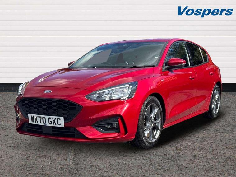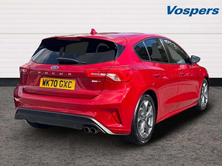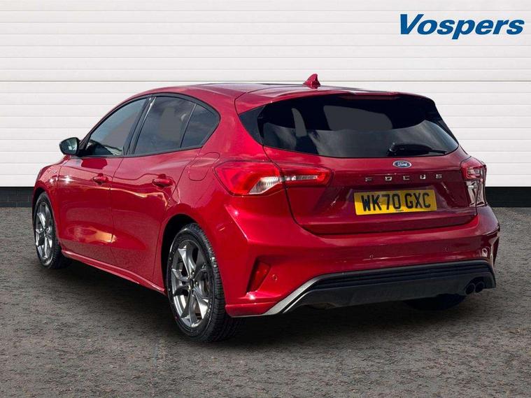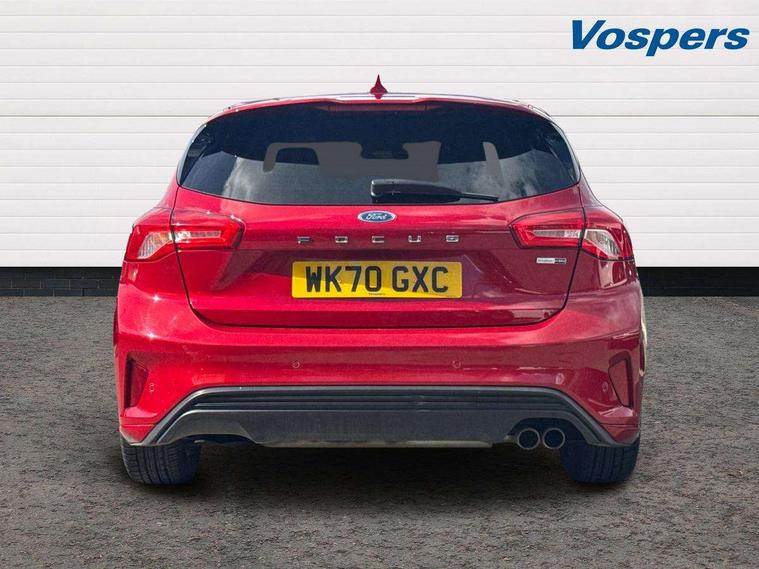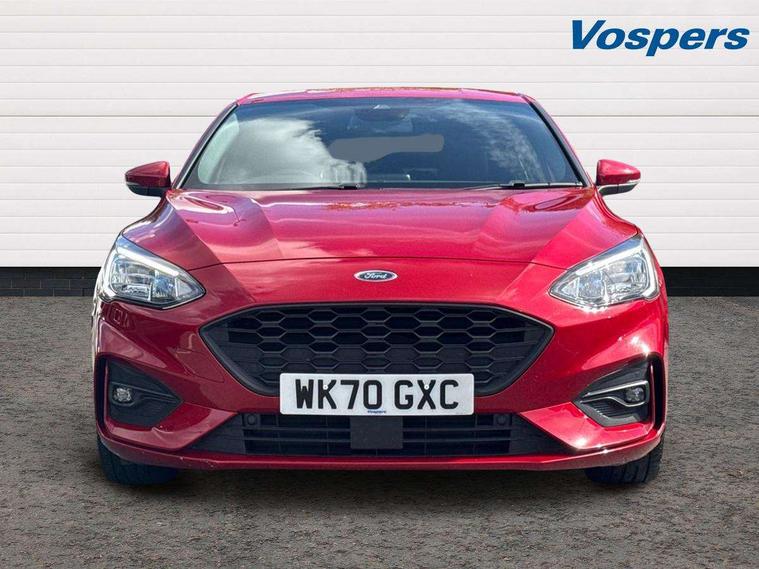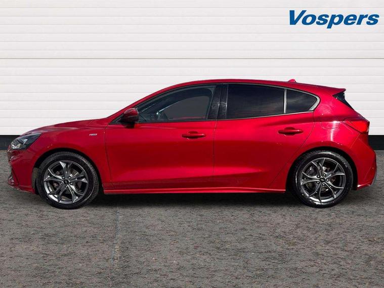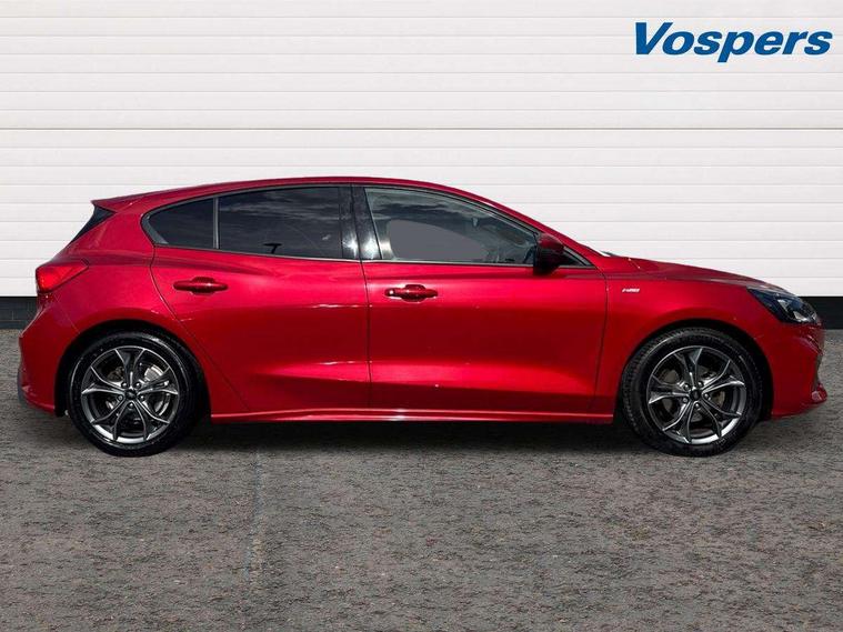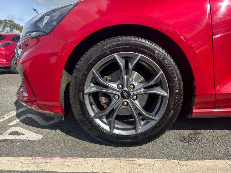 4.2" TFT coloured cluster, Bluetooth system, Digital clock, Easy fuel capless refuelling system, Eco mode, Ford SYNC 3 navigation with 8" TFT touchscreen, DAB radio and app link Android auto/Apple carplay, Intelligent speed assist, Lane keeping system - lane keeping alert and lane keeping aid, PAS, Selectable drive mode, Trip computer, Wireless charging pad, Sports tuned suspension, 2 USB ports, Aux input, Auto dimming rear view mirror, Auto headlamps (on/off), Automatic rain sensing wipers, Body colour large rear spoiler, Body coloured bumpers, Body coloured door handles, Body coloured electrically operated and heated door mirrors with side indicators, Electrically operated front and rear windows with one touch opening and closing, Front variable intermittent wipers with electric wash, Heated rear window, LED daytime running lamp, LED front fog lamps with cornering function, LED reflector headlamps, Polished twin tailpipe, Power folding door mirrors with puddle lights, Quickclear heated windscreen, Rear privacy glass, ST-Line upper and lower grille with full body styling kit and wing badges, Tailgate wash/wipe, 3 spoke flat bottomed leather steering wheel with red stitching, Alloy finish pedals, Aluminium gear knob, Cloth upholstery, Dark headliner, Driver's lumbar support, Front floor mats, Height adjustable front headrests, Isofix child seat preparation, Manual air conditioning, Reach + rake adjustable steering column, Rear centre headrest, 3x3 point rear seatbelts, ABS+Electronic Brake force Distribution, Auto hold function, Driver airbag, Electronic parking brake, Electronic stability control, Front and rear seatbelt reminder, Front inertia reel height adjustable seatbelts with pre-tensioners, Front passenger airbag, Front side airbags, Hill start assist, Passenger airbag deactivate switch, Post collision braking, Pre collision assist with autonomous emergency braking and pedestrian/cyclist detection, Side curtain airbags, Three rear inertia reel lap/diagonal seatbelts, Tyre pressure monitoring system, Ford keyfree system with Keyless entry and keyless start/sleep mode key fob, MyKey system, Remote central locking & engine immobiliser, Thatcham category 1 alarm, 17" 5x2 spoke alloy wheels with rock metallic finish, Mini steel spare wheel,