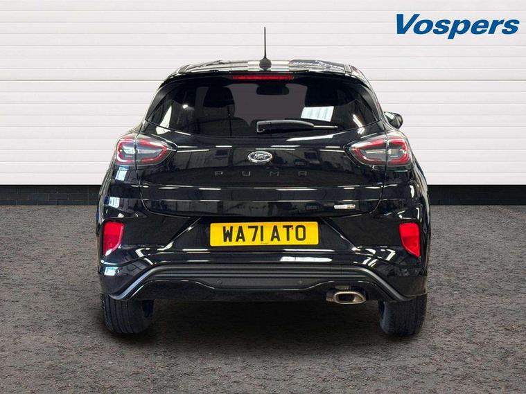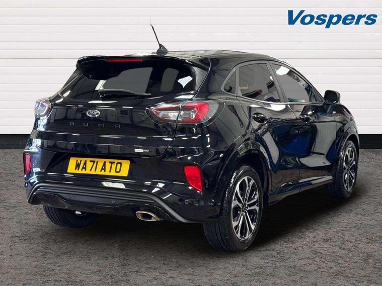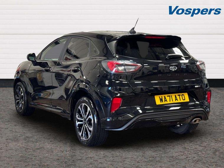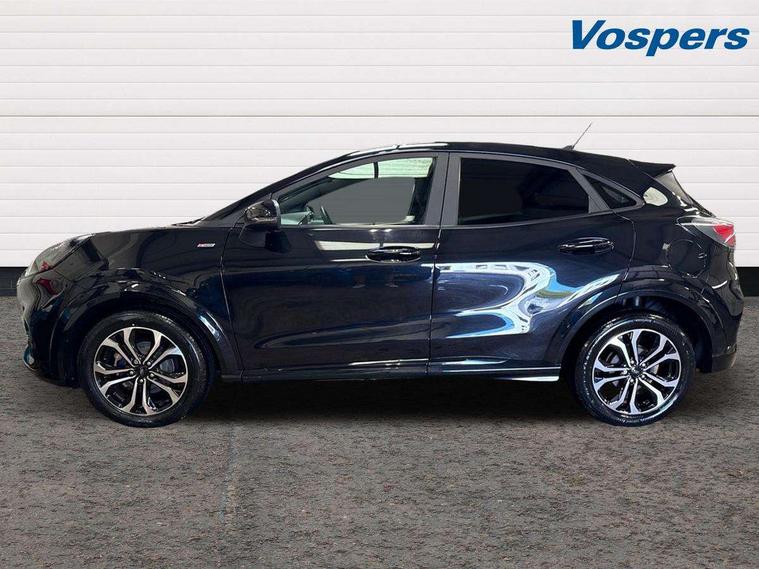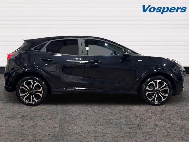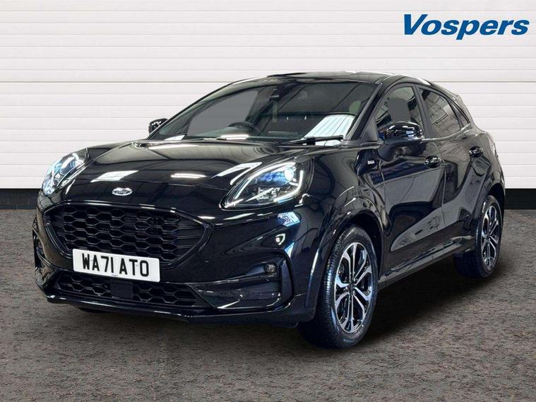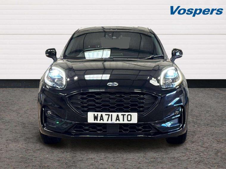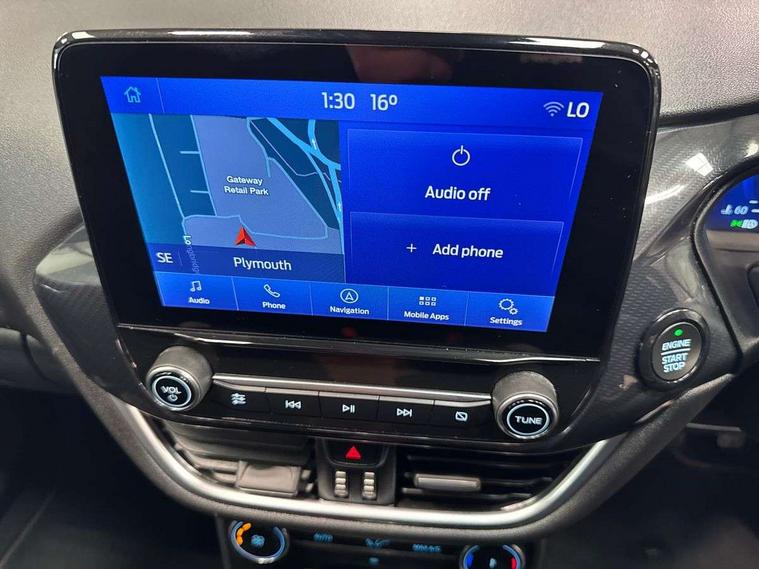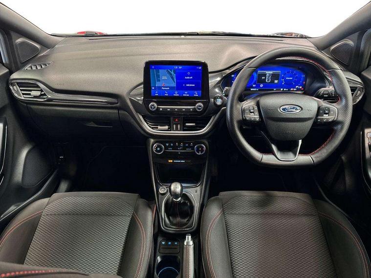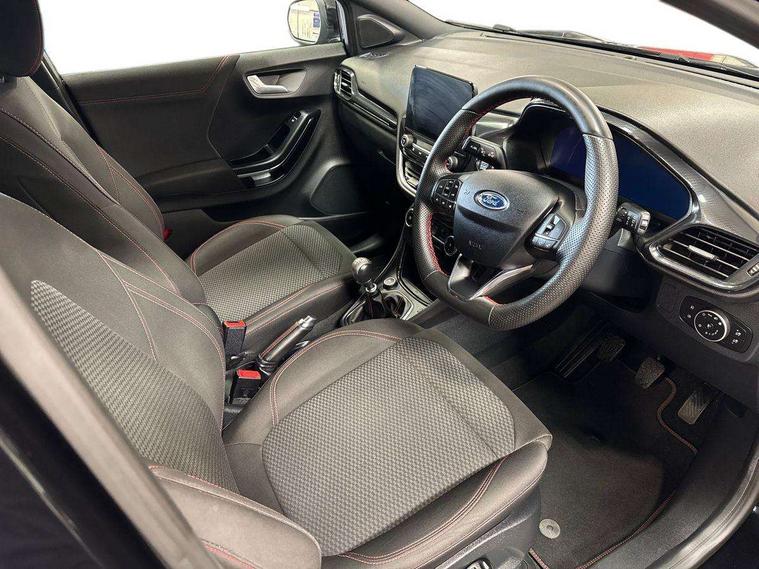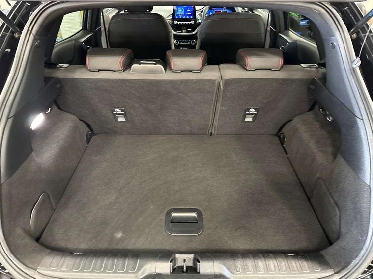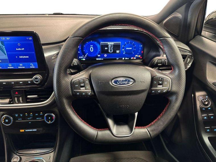 Ford easy fuel, Full digital 12.3" instrument cluster, Power assist steering, Power start button, Rear parking sensor, Selectable drive modes(Normal, sport, Eco, trail, slippery), Automatic rain sensing wipers, Body coloured door mirrors, Front fog lights with cornering lights and LED rear lamps, Power foldable heated door mirrors with puddle lamps, Projector headlamps with LED day time running lights, Quickclear heated windscreen, Rear wiper, ST-Line body kit with large rear spoiler wth sports suspension, Centre console with armrest and stowage, Cloth upholstery, Driver seat height/lumbar adjust, Ford megabox extended bootspace, Front and rear floor mats, Front and rear head restraints, Manual air conditioning, ST-Line flat bottomed sensico leather steering wheel with leather handbrake and aluminium gear knob, Driver assistance pack with Lane departure warning - Puma, Ford SYNC 3 navigation pack - Puma, 3 rear seatbelts, Electronic stability control (ESC) and hill start assist, Pedestrian/cyclist detection & post-collision braking, Tyre pressure monitoring system (TPMS), Thatcham alarm,