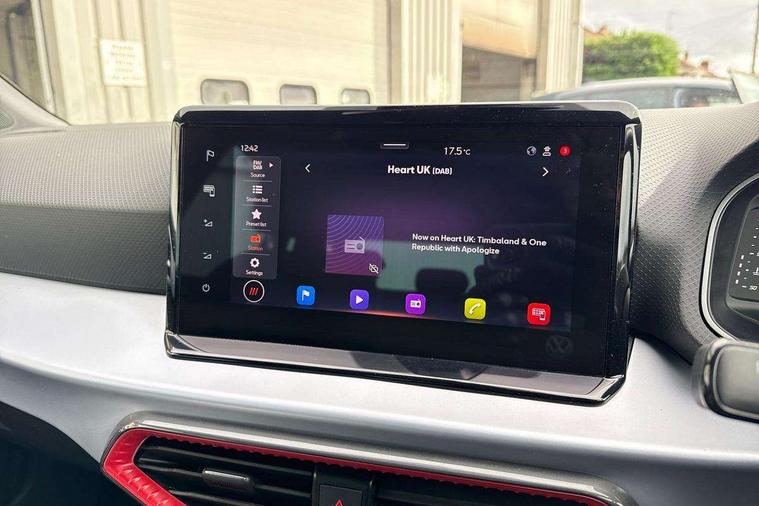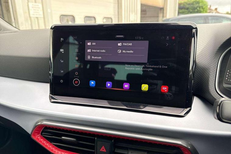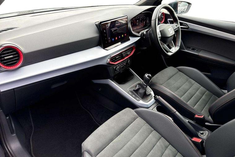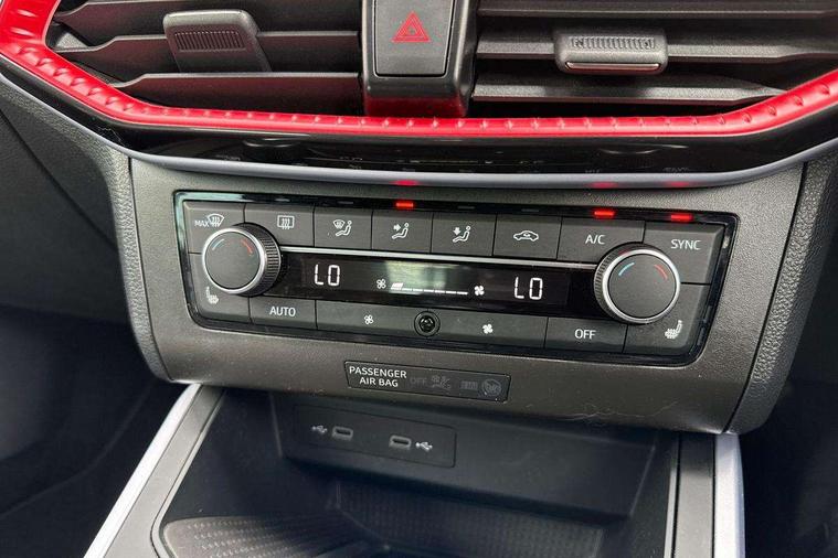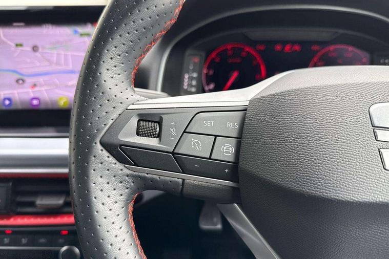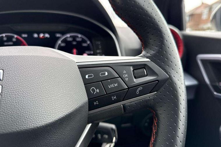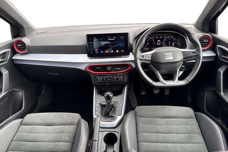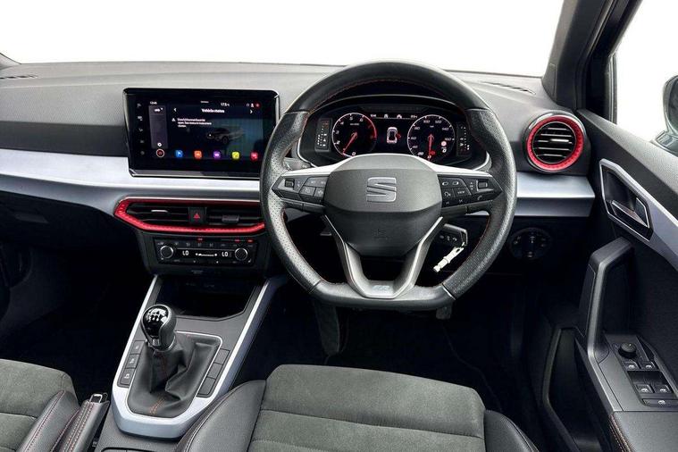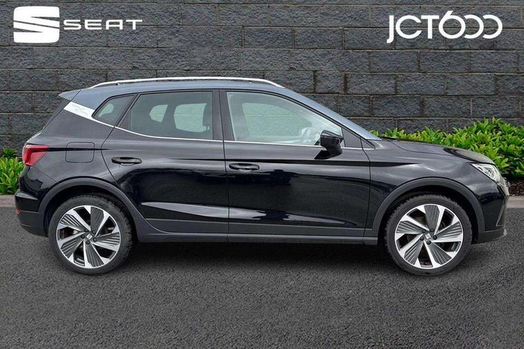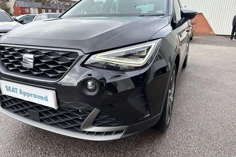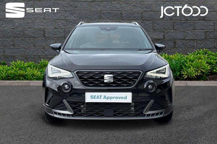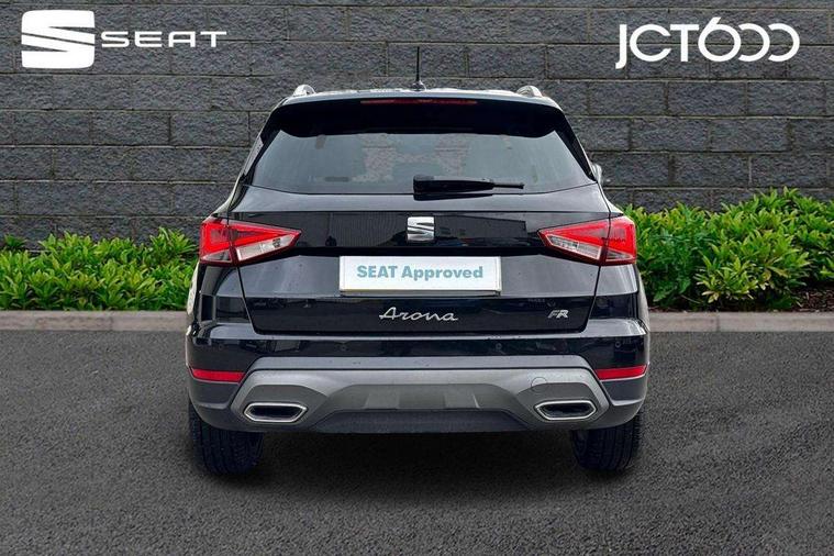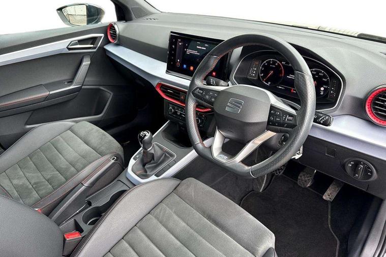 'Lights On' Reminder warning buzzer, 10" Digital cockpit, Digital clock, E-call, Electric speed sensitive power steering, Full Link Smartphone Integration with Mirror Link, Apple Car Play, Google Android Auto with USB Type C cable for Apple and Android compatibility, Lane keeping system, Low fuel warning light, Outside temperature display, RPM counter, SEAT Drive profile - Four different models normal-sport-eco-individual, steering response, throttle response, Trip computer, Wireless phone charger, 9.2" colour touchscreen with navigation system, voice control and USB port (type c), Bluetooth interface for hands free and audio streaming, DAB digital radio and AM/FM radio, Steering wheel mounted audio controls, Anti theft roof antenna, Auto dimming interior rear view mirror, Automatic activation of hazard warning lights, Body coloured bumpers, Body coloured door handle inserts, Chrome roof rails and window surrounds, Dark tinted rear windows, Electric front/rear windows, Electrically adjustable, heated and folding door mirrors, Front fog lights with cornering function and rear fog light, FULL LED automatic headlights with dynamic headlight range control, coming and leaving home, LED daytime running lights, LED rear tail lights and licence plate lights, Protective side mouldings, Rain sensing wipers, Rear side wing doors, Rear spoiler, Rear window wash/wipe, Roof colour door mirrors, Third brake light, Twin exhaust pipe styling hidden exhaust pipe, Visible VIN plate, 2 cupholders, 3 seat bench in 2nd row, 60/40 split folding rear seat, Aircare filter, Black interior roof, Double boot floor, Driver sunvisor with covered mirror + card holder, Dual zone climate control, Front comfort seats, Front courtesy light with front reading lights, Front seat back storage pockets, Gear shift indicator, Heated front seats, Height adjustable front seats, Height/reach adjustable steering column, Illuminated boot, Instrument lighting with brightness control, Interior ambient lighting, Interior light in footwell, central console and door panel, ISOFIX points in outer rear seats with top tether anchorage points, Microsuede cloth upholstery, Passenger sunvisor with vanity mirror, Perforated flat bottomed leather steering wheel/gear knob/handbrake with red stitching and FR logo, Potentiometer, Single front passenger seat, Two front and three rear height adjustable headrests, Interior chrome pack - Arona, Safe and driving pack (S) - Arona, 3 point seatbelts on all rear seats, ABS, Active front headrests, Child locks on rear doors, Driver and front passenger airbags with front passenger airbag de activation, front side and curtain airbags, Emergency Brake Assist (EBA) and front assist, Front and rear seatbelt reminder, Hill hold control, Multi-Collision braking, Tiredness recognition system, Traction control, Tyre pressure monitoring system, Alarm with back-up horn, Electronic engine immobiliser, Locking wheel bolts, Remote central locking + deadlocks, Tow away protection, Titan black dashboard, 18" Performance Cosmo grey matt alloy wheels,