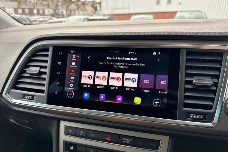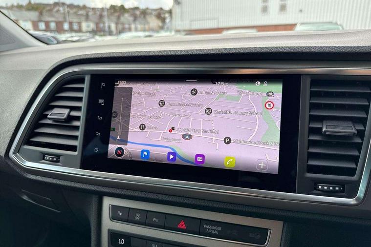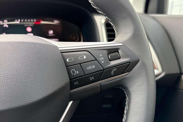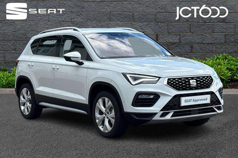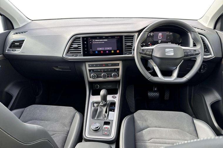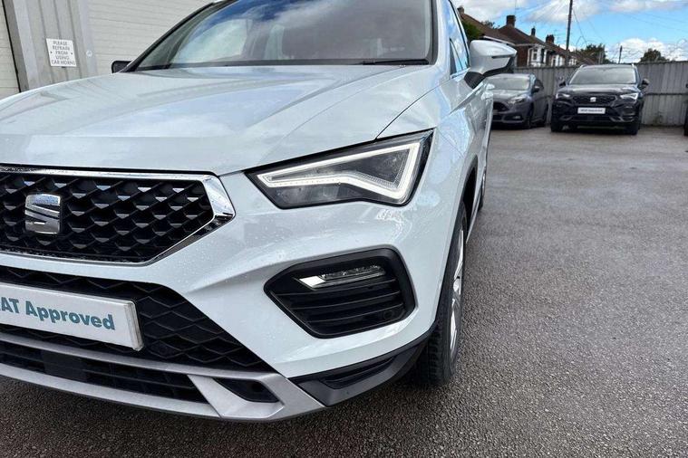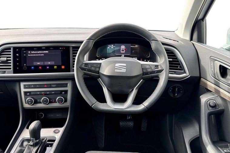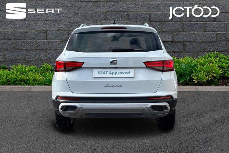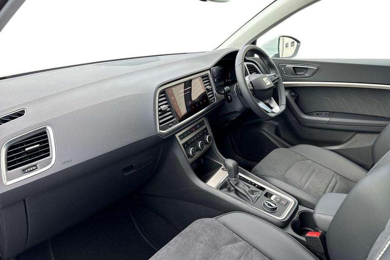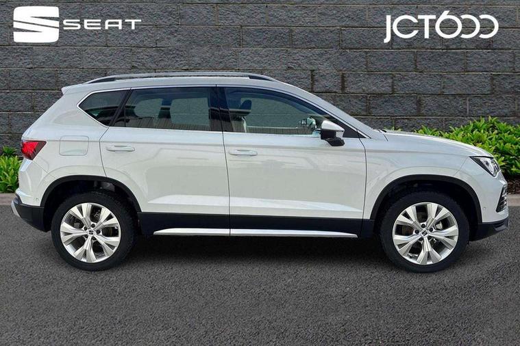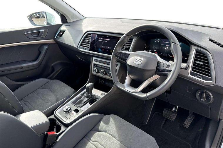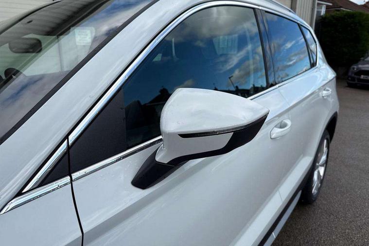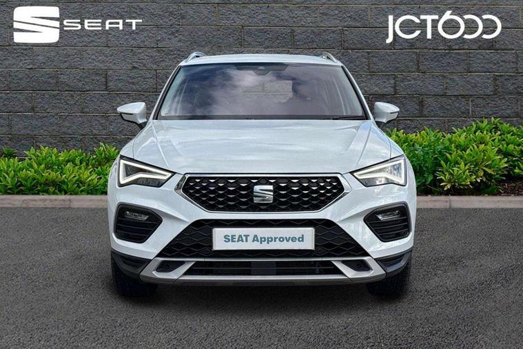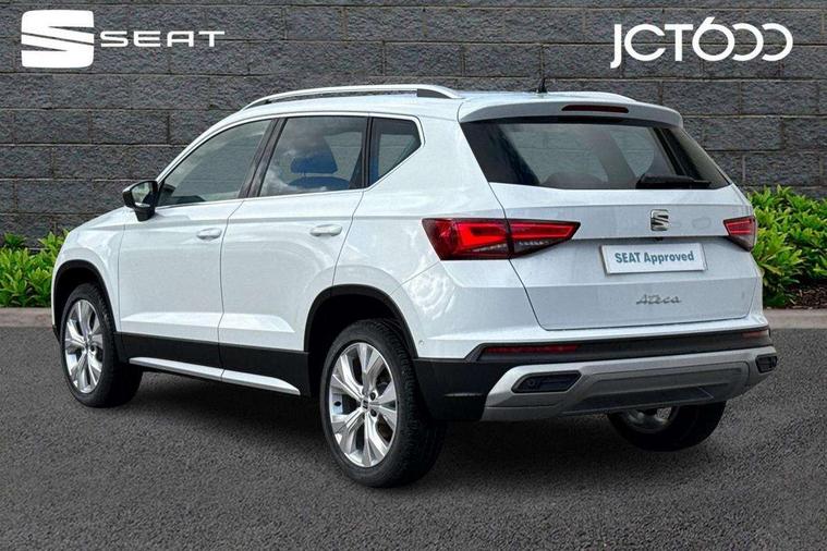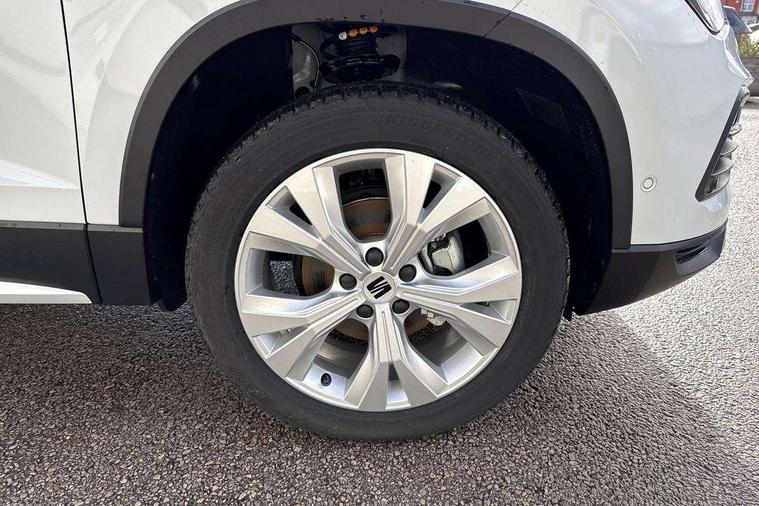 8" Digital cockpit, Colour multi-function on board computer display, E-call, Electric tailgate, Outside temperature gauge, Progressive power assisted steering, Rear view camera, SEAT drive profile with driving experience button - Normal, Sport, Eco and Individual mode, gearshift, steering and throttle response, Self parking functionality (includes front and rear parking sensors), Start/stop system, Trip computer, wired and wireless full link smartphone integration, Wireless phone charger, Steering wheel mounted audio/phone controls, Black wheel arch surrounds, Body colour bumpers, Chrome front grille frame, Chrome roof rails, Chrome side window trim, Dark tinted rear windows, Daytime running lights, Door mirrors with welcome light silhouette, Dynamic headlight range control with self adjusting whilst driving, Electric adjustable/heated/folding door mirrors, Front and rear electric windows, Front grille hot stamping, Full LED headlamps with lens and LED front fog lamps with cornering function, Heat reflecting windscreen, Illuminated aluminium front door sill, LED 3rd brake light, LED rear tail lights with dynamic indicators, Rear exhaust tailpipe, Rear fog lights, Rear side wing doors, Rear wash/wipe, Reflex silver side mouldings, Variable front intermittent wipers, 12v socket in front, 3 seat bench in 2nd row, 60/40 split folding rear seat, Dinamica upholstery with front comfort seats, Drawer under right front seat, Dual zone climate control, Front and rear head restraints, Front centre armrest, Front seat back storage pockets, Height adjustable driver and passenger seat with lumbar adjustment, ISOFIX points in outer rear seats with top tether anchorage points, Leather sports steering wheel and gear knob, Rear armrest and easy back seat release mechanism from boot, Single front passenger seat, Steering wheel mounted gearshift paddles, Convenience pack - Ateca, Interior lighting pack - Ateca, Navigation system pack with DAB - Ateca, Safety and driving pack (M) - Ateca, Safety and driving pack with attention and drowsiness assist - Ateca, 3x3 point rear seatbelts, ABS, Traction control system (TCS), Electronic stability control (ESC) and Electronic differential lock system (XDS), Airbags - Driver and front passenger airbag with deactivation, front side, two curtain and driver's knee airbags, Electric parking brake with auto hold function, Front and rear seatbelt reminder, Hill hold control, Manual rear child locks, Single tone horn, Tiredness recognition system, Tyre pressure monitoring system, Alarm, Keyless entry, Locking wheel bolts, Remote central locking, Chrome interior detailing, 18" Brillaint silver alloy wheels,