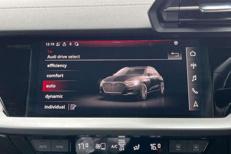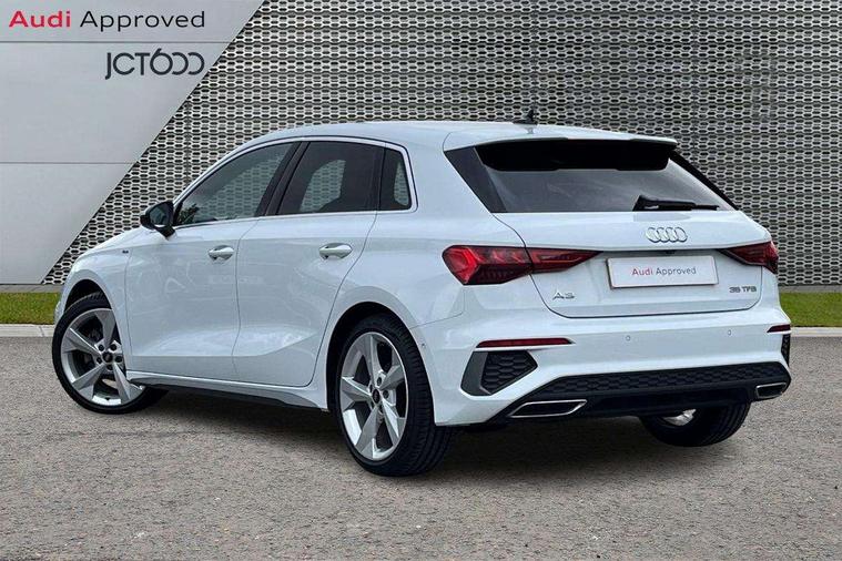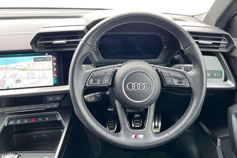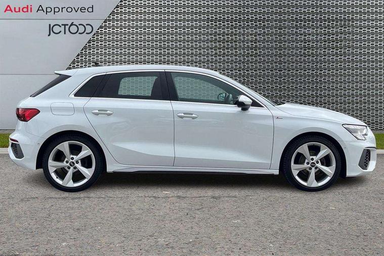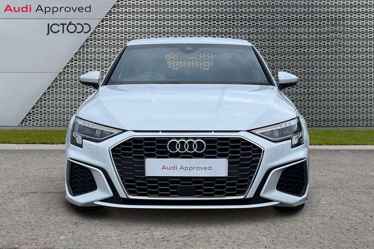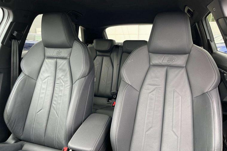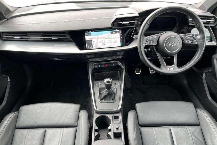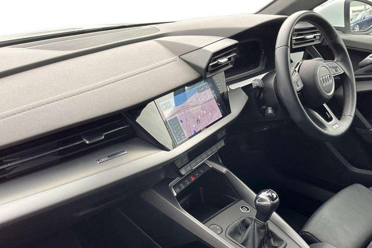 Audi connect emergency call and service, Audi drive select (Auto, Comfort, Dynamic, Efficiency and Individual), Audi smartphone interface, Audi Virtual Cockpit - 10.25" digital and colour instrument cluster, Automatic start/stop system with recuperation, Bluetooth interface, Collision avoidance assistant, Electromechanical power speed sensitive steering, Lane departure warning system, MMI Navigation Plus with high resolution 10.1" colour touch screen display, Service indicator, Trip computer, Voice control system with natural language interaction, 2xUSB-C connection with data and charging functions, 6 passive loudspeakers, DAB Digital radio, 3rd brake light, Acoustic glass windscreen, Aluminium window trim, Auto dimming frameless rear view mirror, Electrically adjustable/heated/folding/auto dimming door mirrors with integrated LED indications + kerb view function for passenger side, Front electric windows, Illuminated aluminium inserts front door sills with S logo, LED daytime running lights, LED headlights with LED rear lights and dynamic rear indicators, Light and rain sensors, Privacy glass - dark tinted rear window, rear door and side windows, Rear electric windows, Rear side air outlets in grained matt black, Rear side wing doors, Rear wiper, S line bumpers, S roof spoiler, 12V socket and storage compartment in front centre console, 3 seat bench in 2nd row, 40/20/40 split folding rear seat bench with cupholder, Black cloth headlining, Dual zone electronic climate control, Front and rear centre armrest in leather, Front and rear headrests, Front/rear floor mats, Height and reach adjustable steering wheel, Illuminated vanity mirror, Interior lighting - glove compartment light and right hand side, Luggage compartment floor covering, Manual boot compartment lid, Manually adjustable front seats, Seat side bolsters, Single front passenger seat, Stainless steel pedals and front footrest in black, Twin leather upholstery with front sports seats S embossed logo, Aluminium interior elements pack - A3 Sportback, S line styling pack - A3 Sportback, 3x3 point rear seat belts, Driver and front passenger airbag with passenger airbag deactivation, Electronic Stabilisation Control (ESC) including ABS, ASR and EDL, First aid kit with warning triangle and 2 safety vests, Front side airbags with head airbags and interaction airbag, Pre-sense front with pedestrian and cyclist detection, Seatbelt monitoring, Tyre pressure loss indicator, Anti theft alarm, Anti-theft wheel bolts, Immobiliser, Manual child locks, Remote control central locking, Accent surfaces in the dashboard and centre console in platinum grey silk effect paint finish, Dark spectrum aluminium inlays,