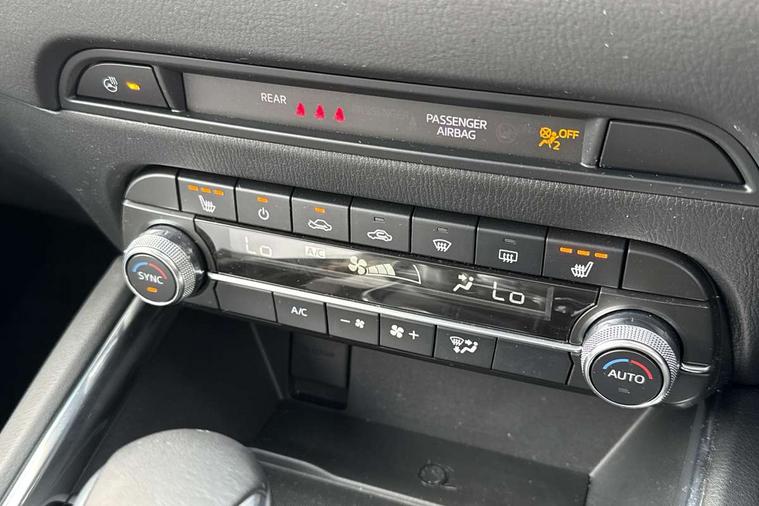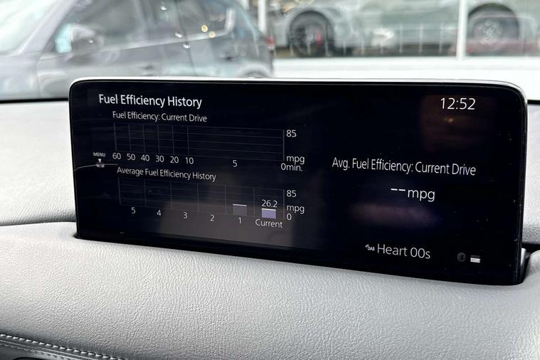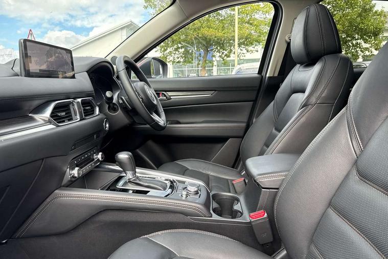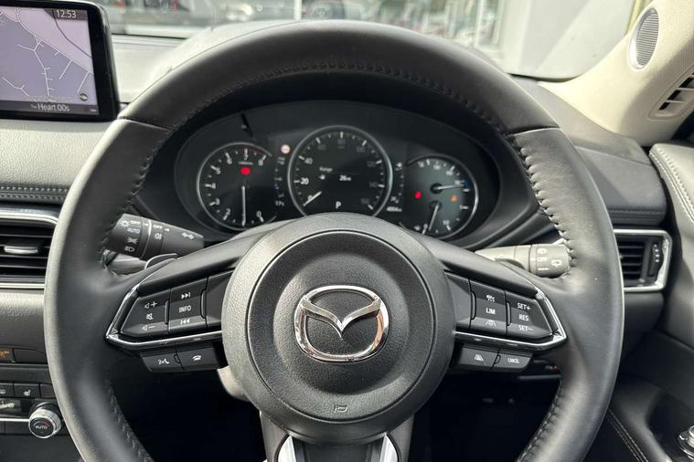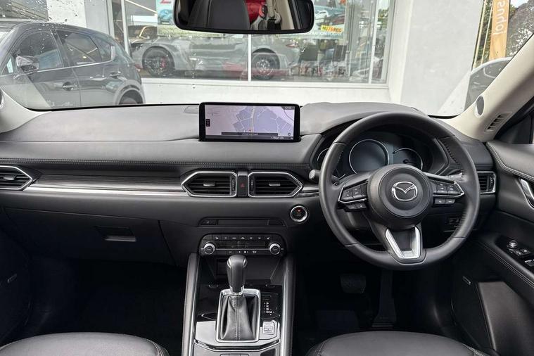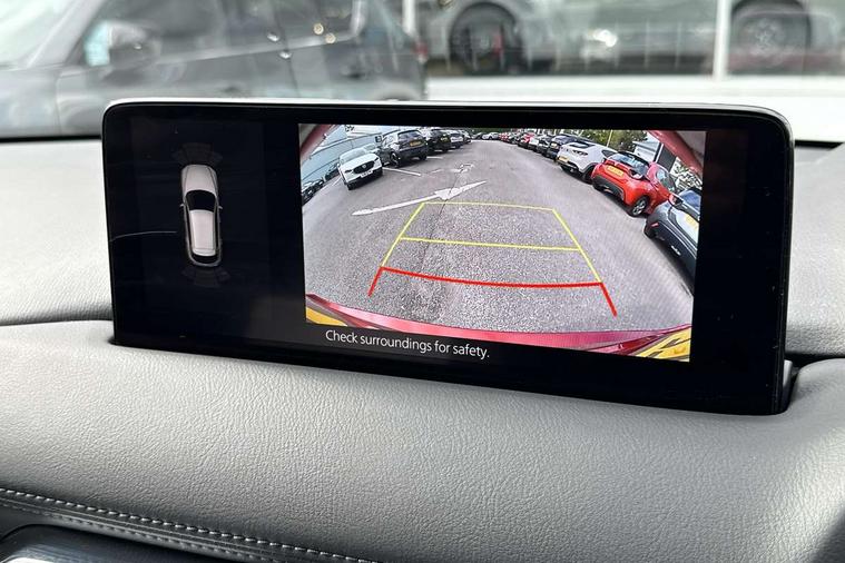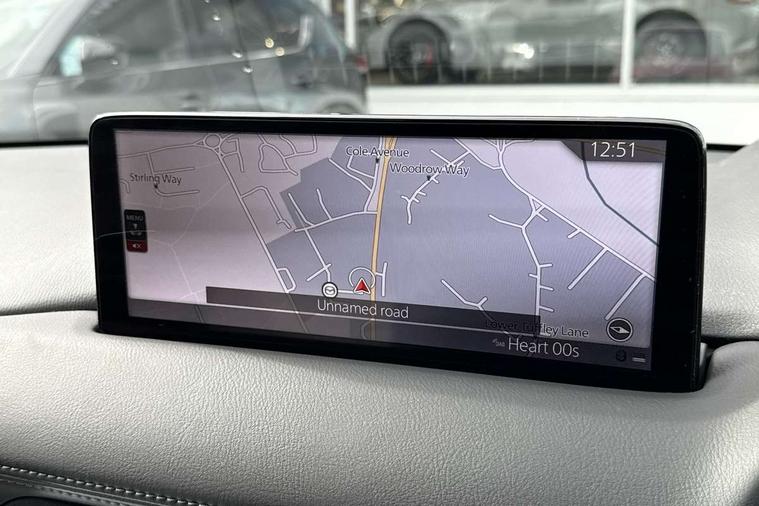 10.25" display with Mazda Connect infotainment, 7" colour TFT display, Advanced blind spot monitoring, Bluetooth connectivity with voice control, Collision prevention assist, Connected services, Cruising Traffic Support, Drive mode selector, Electric power steering, Emergency stop signalling system, Engine start/stop button, Forward collision warning, Front and rear parking sensors, Integrated navigation system, Intelligent speed assist, Lane departure warning system, Lane keep assist, Power liftgate, Qi wireless phone charging, Radar cruise control with Stop and Go, Rear cross traffic alert, Reversing camera, Service indicator, Traffic sign recognition (TSR), Trip computer, Windscreen projected colour active driving display (HUD) with memory, Wireless apple car play/android Auto, Cylinder Deactivation, i-stop, AM/FM radio, Bluetooth audio streaming, Bose premium sound system with 10 speakers, DAB Digital radio, Multimedia Commander including separate volume dial, Steering wheel mounted audio controls, Adaptive front lighting system, Auto dimming rear view mirror, Automatic headlights, Black inlay dashboard panel, Body colour door mirrors, Body colour roof spoiler, Body coloured front and rear black lower bumper mouldings, Coming/leaving home lighting function, Door mirror integrated indicators, Dual chrome tailpipes, Dusk sensitive headlamps, Electric front/rear windows with one touch auto up/down, Front grille in gloss black finish, Front grille in gloss black finish with chrome signature wing, Gloss black B and C pillars garnish, High beam assist, Intermittent rear wash/wipe, LED auto levelling, LED daytime running lights, LED front fog lights, LED Headlights, LED third brake light, Power folding and heated door mirrors, Power tilt/slide sunroof, Privacy glass (rear side windows only), Rain sensing front wipers, Rear side wing doors, Satin black side mouldings, Scuff plates, Shark fin antenna, Signature LED rear combination lights, Variable intermittent front wash/wipe, Vinyl with wood grain metal inlay door trim panel, Windscreen wiper de-icer, 12v electrical power outlet, 3 seat bench in 2nd row, 3 stage heated front seats, 40:20:40 Karakuri fold-flat seat system, 6 way electric adjustable passenger seat, 8 way electric driver seat with lumbar support + memory, Cargo room flat floor board with waterproof undertray, Driver seat power slide, recline and height adjustment, Driver, Front passenger and two rear grab handles with coat hooks, Driver/passenger front seatback pockets, Driver/passenger sunvisors + illuminated vanity mirrors (drivers with ticket holder), Dual zone climate control, Folding centre armrest with 2 cup holders, Front and rear door pockets, Front centre storage with two cupholders, Front passenger seat power slide, recline and height adjustment, Heated steering wheel, Humidity sensor, Illuminated glovebox, Interior dome light with integral spotlight, ISOFIX child seat anchorage points attached on outer rear seats, Karakuri tonneau cover, Leather upholstery, Leather wrapped steering wheel and gear knob, Light roof lining, Luggage compartment LED lighting, Luggage compartment power outlet, Paddle shifts, Rear air vents, Rear headrests, Rear seat recline, Roof mounted sunglasses holder, Single front passenger seat, Three height adjustable head restraints, Tilt/height adjustable steering wheel, USB Connectivity (2x front Type-C, 2x rear Type-B), White interior LED illumination lighting, 3 point front seatbelts with pre-tensioners, 3 rear 3 point seatbelts, ABS, Advanced Smart City Brake Support - SCBS, Child locks on rear doors, Driver and front passenger side airbags, DSTC-Dynamic Stability and Traction Control, Dual front airbags, Electronic brake force distribution, Electronic parking brake with auto hold, ESP, Front and rear curtain airbags, Front passenger airbag deactivation, G-Vectoring control, Hill hold assist, Seatbelt reminder front and rear, Single stage passenger airbags, Smart brake support with forward obstruction warning, Tyre pressure monitoring system, Automatic door locking when moving off, Deadlock, Immobiliser, Power door locks, Remote central locking, Smart keyless entry, Thatcham Cat.1 alarm, 19" diamond cut black alloy wheels, Tyre repair kit,