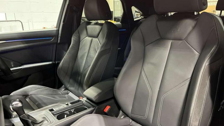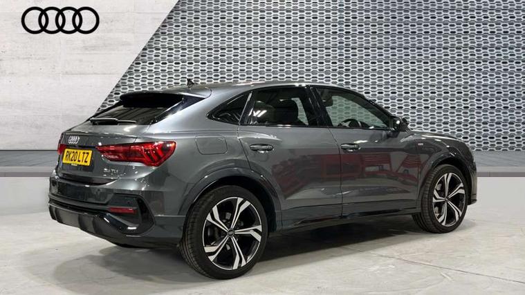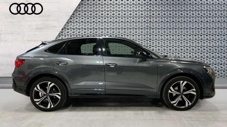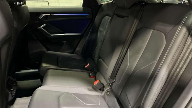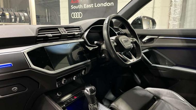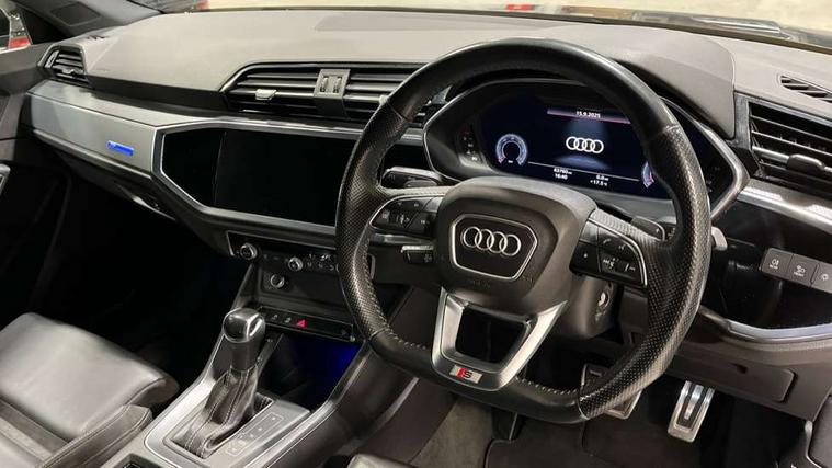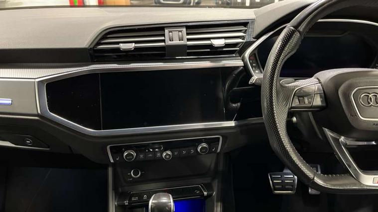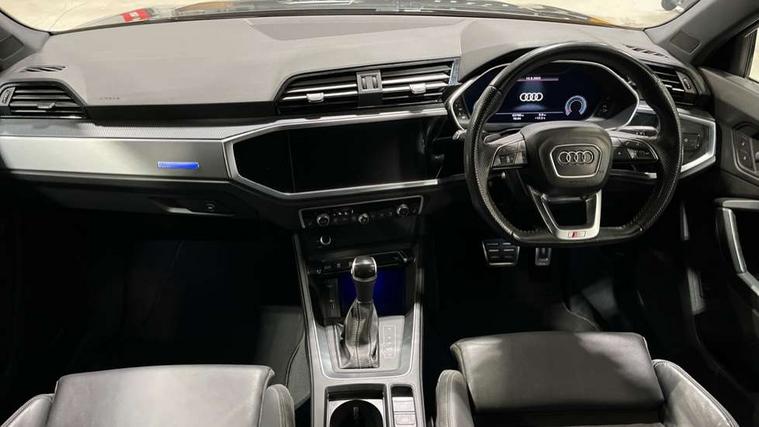 Audi connect safety and service (e-call), Audi drive select, Audi lane departure warning, Audi side assist, Audi smartphone interface, Audi virtual cockpit plus, Bluetooth interface, Camera based traffic sign recognition, MMI Navigation Plus with high resolution 10.1 inch touchscreen colour display, Power operated tailgate, Progressive steering, Service interval indicator, Start stop system with recuperation, Voice control system with natural language interaction, Diesel particulate filter, Sports suspension, 1 x USB type C and 1 USB type A charging points, 6 passive loudspeakers, DAB digital radio module, Acoustic windscreen, Audi Beam uses LEDs to project the Audi Sport logo, Auto dimming frameless rear view mirror, Diffuser grille in grained matt black, Diffuser trim in selenite silver, Electrically folding, adjustable and heated door mirrors with integrated LED side indicators and kerb view function for passenger side, Front and rear electric windows, Front fog lights, Front underbody protection in manhattan grey paint finish, Headlight washers, High gloss black finish B and C pillars, Matrix LED headlights with LED rear lights and dynamic front and rear indicator, Privacy glass dark tinted rear and rear-side windows (from B-pillar backwards), Rain and light sensors, Rear underbody protection in matt black, 12V socket in rear centre console, 3 spoke flat bottomed high multi-function leather sport steering wheel with gearshift paddles, 4 way electric lumbar support for driver and front passenger, 40:20:40 folding with manual adjustment for 60:40 forwards/backwards position and backrest angle, Adjustable rear seat bench/backrest with centre armrest and cupholder, Black cloth headlining, Dual zone climate control, Electrically adjustable front seats, Front and rear black floor mats with contrast stitching, Front and rear headrests, Front and rear roof module including reading lights, Front centre armrest, Glove compartment lighting, Heated front seats, Illuminated door sill trims with S logo, ISOFIX child seat mounting and Top Tether with front passenger airbag deactivation, Luggage compartment light, Perforated leather gearknob, Stainless steel luggage compartment sill finisher, Stainless steel pedals, Black styling pack - Q3, Multi coloured extended ambient interior lighting pack - Q3, Non smoking pack - Q3, 3x3 point rear seatbelts, 6 airbags - Driver, front passenger, curtain and side windows, Audi pre-sense front with pedestrain and cyclist recognition, Electrically operated child locks on rear doors, Electromechanical parking brake, Electronic stabilisation control including ABS, ASR and EDL, Hill descent control, Hill hold assist, Pre sense basic, Seatbelt monitoring, Tyre pressure warning, Warning triangle and first aid kit, Anti theft alarm, Anti theft wheel bolts, Remote central locking, Dark matt brushed aluminium inlay, Detail dashboard around MMI touch colour display in glass look, black with surround in aluminium look, Leatherette door armrest,