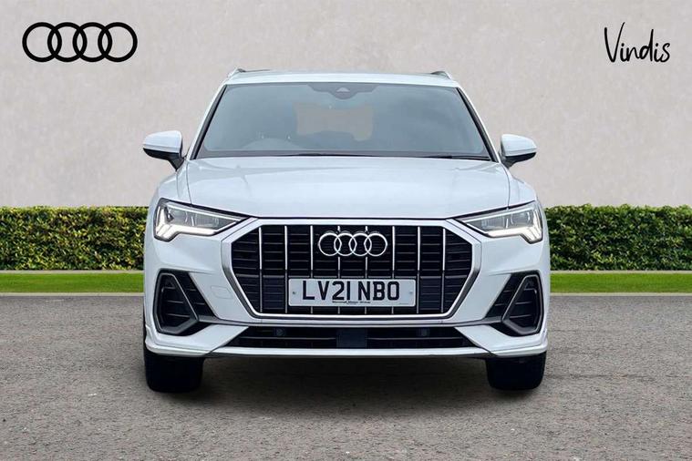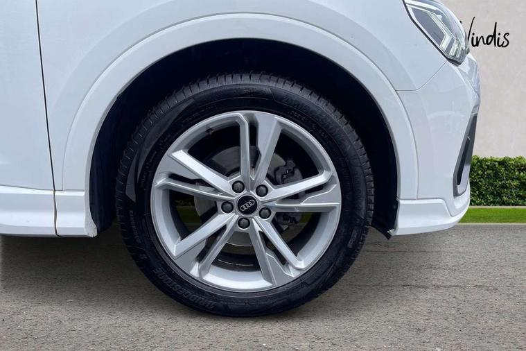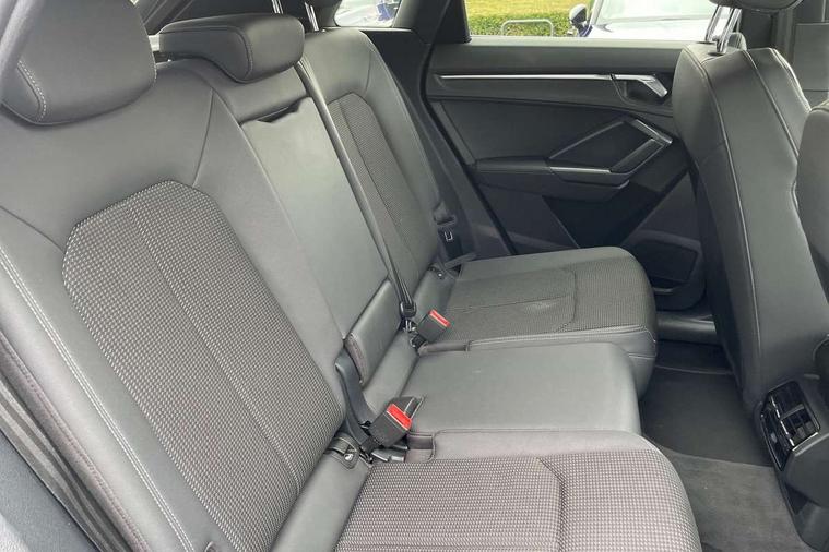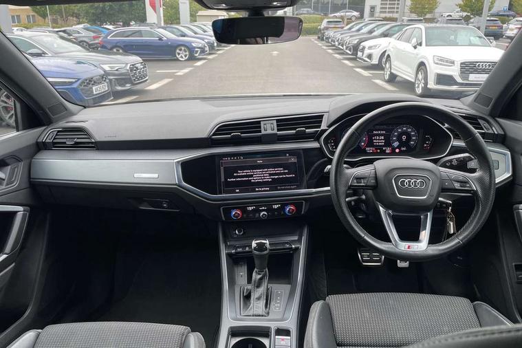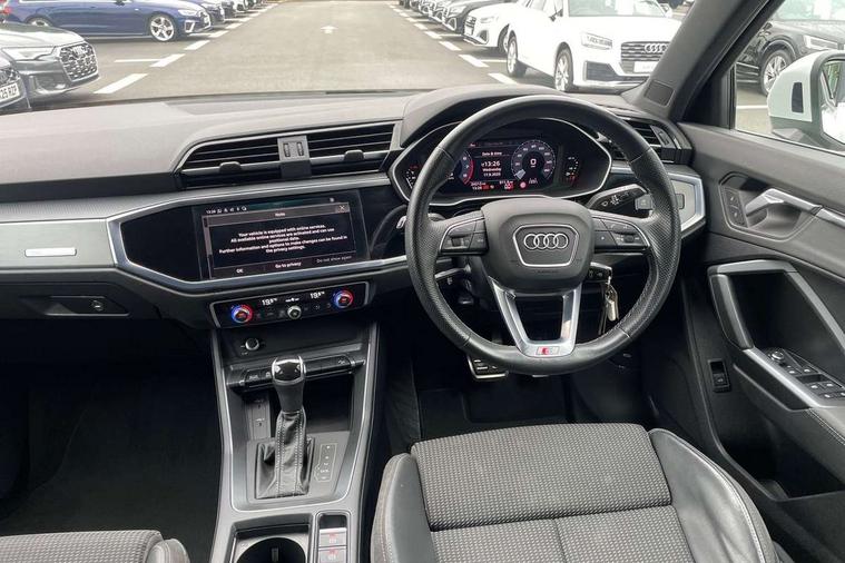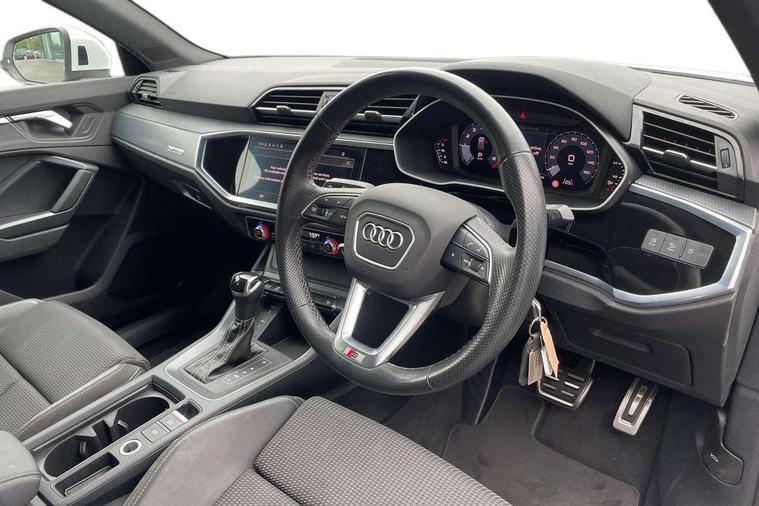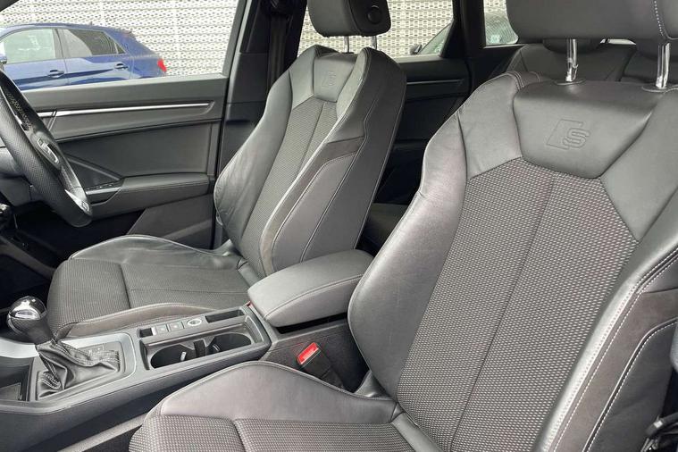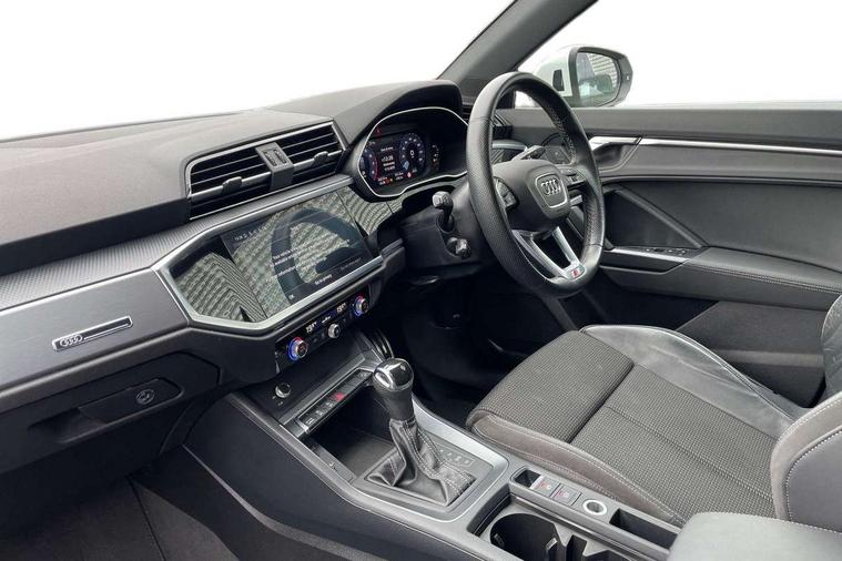 Audi connect safety and service (e-call), Audi drive select, Audi lane departure warning, Audi Virtual Cockpit - 10.25" display, Bluetooth interface, Camera based traffic sign recognition, MMI Navigation Plus with high resolution 10.1 inch touchscreen colour display, Power operated tailgate, Progressive steering, Service interval indicator, Smartphone interface includes wireless Apple carplay/Android Auto, Start stop system with recuperation, Voice control system with natural language interaction, 48V Mild hybrid technology, Sports suspension, 2 USB-C ports with charge and data functions, 6 passive loudspeakers, DAB digital radio module, Acoustic windscreen, Aluminium roof rails, Aluminium window trim, Auto dimming frameless rear view mirror, Body coloured bumpers, Electrically folding, adjustable and heated door mirrors with integrated LED side indicators and kerb view function for passenger side, Front and rear electric windows, Front fog lights, Front side air inlets in matt platinum grey, Front spoiler blade in matt platinum grey, Grille vertical bars in aluminium silver/Matt, High gloss black finish B and C pillars, LED headlights with LED daytime running lights and dynamic rear indicator, LED rear lights, Privacy glass dark tinted rear and rear-side windows (from B-pillar backwards), Rain and light sensors, Rear diffuser strip in matt titanium black, S line badges on front wings, S Line front and rear bumpers, Side skirt insert in matt Platinium grey, Silver chrome grille surround, Titanium black radiator grille, 12V socket in rear centre console, 40:20:40 folding with manual adjustment for 60:40 forwards/backwards position and backrest angle, Adjustable rear seat bench/backrest with centre armrest and cupholder, Black cloth headlining, Dual zone electronic climate control, Front and rear black floor mats with contrast stitching in rock grey, Front and rear headrests, Front and rear roof module including reading lights, Front centre armrest, Glove compartment lighting, Height and reach adjustable steering wheel, Illuminated door sill trims with S logo, ISOFIX child seat mounting for front passenger with airbag deactivation and outer rear seat including top tether attachment point for outer rear seats, Luggage compartment light, Manual front seats with height adjustment, Perforated leather gearknob, Stainless steel luggage compartment sill finisher, Stainless steel pedals, Non smoking pack - Q3, 3x3 point rear seatbelts, 6 airbags - Driver, front passenger, curtain and side windows, Audi pre-sense front with pedestrain and cyclist recognition, Electrically operated child locks on rear doors, Electromechanical parking brake, Electronic stabilisation control including ABS, ASR and EDL, Hill descent control, Hill hold assist, Pre sense basic, Seatbelt monitoring, Tyre pressure warning, Warning triangle and first aid kit, Anti theft alarm, Anti theft wheel bolts, Remote central locking, Dark matt brushed aluminium inlay, Detail dashboard around MMI touch colour display in glass look, black with surround in aluminium look, Leatherette door armrest, Tool kit, Tyre repair kit,