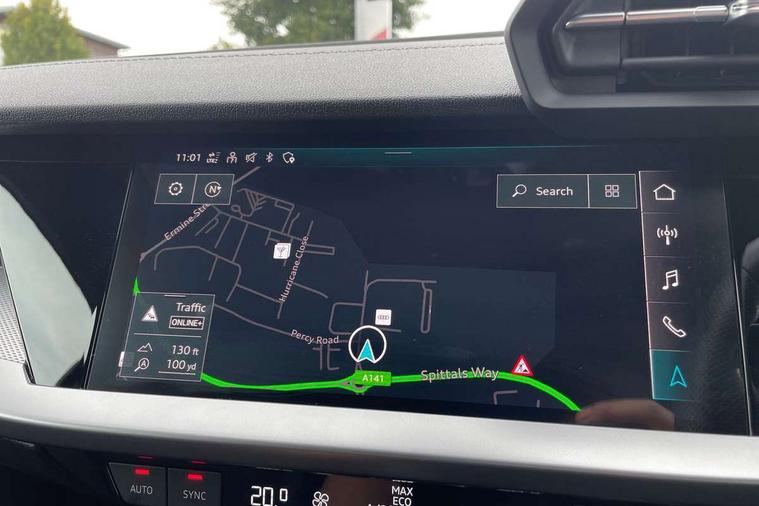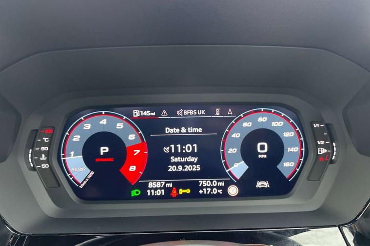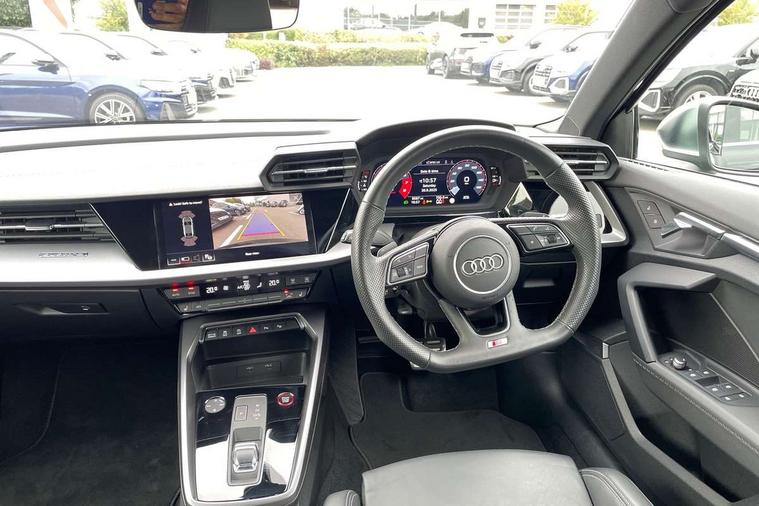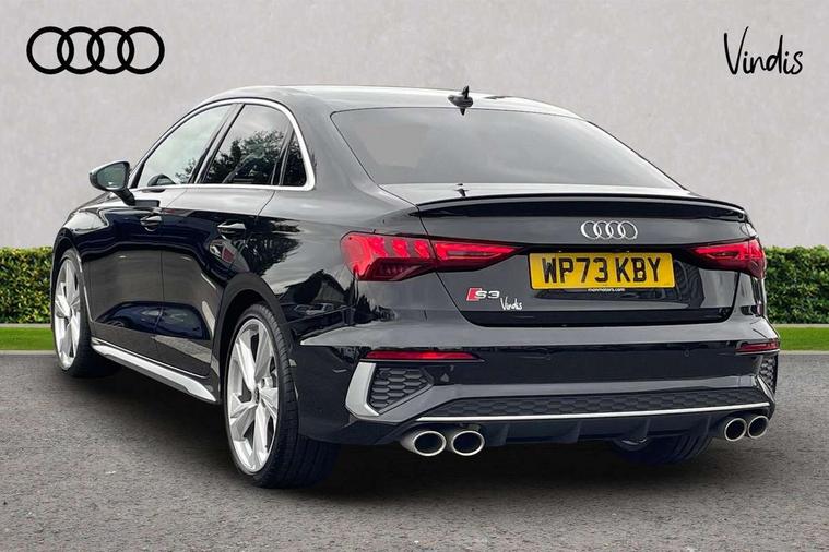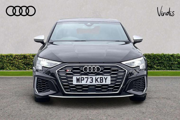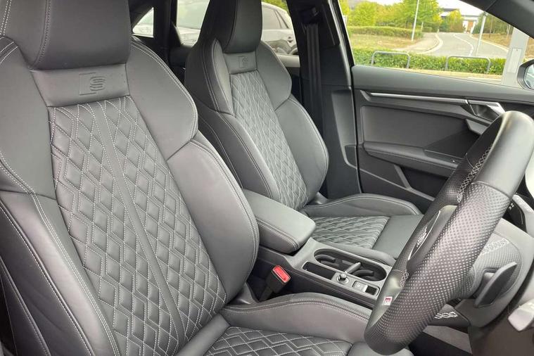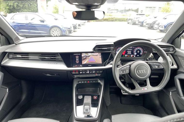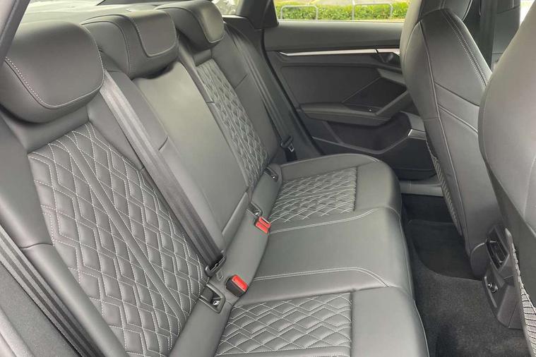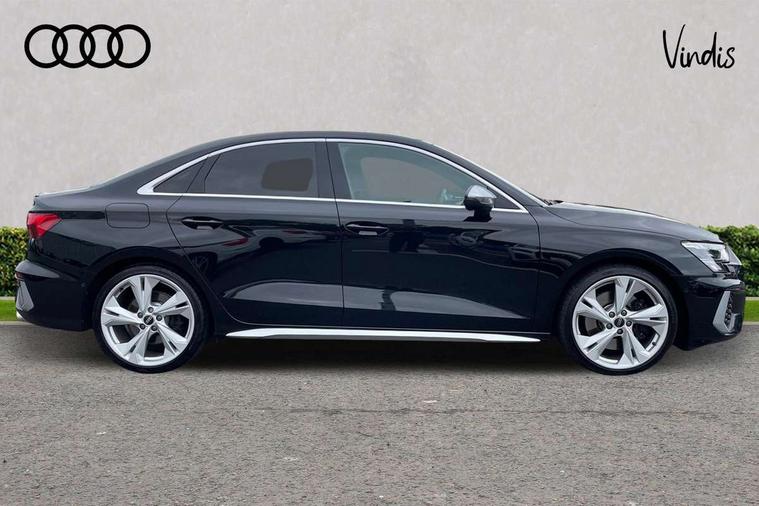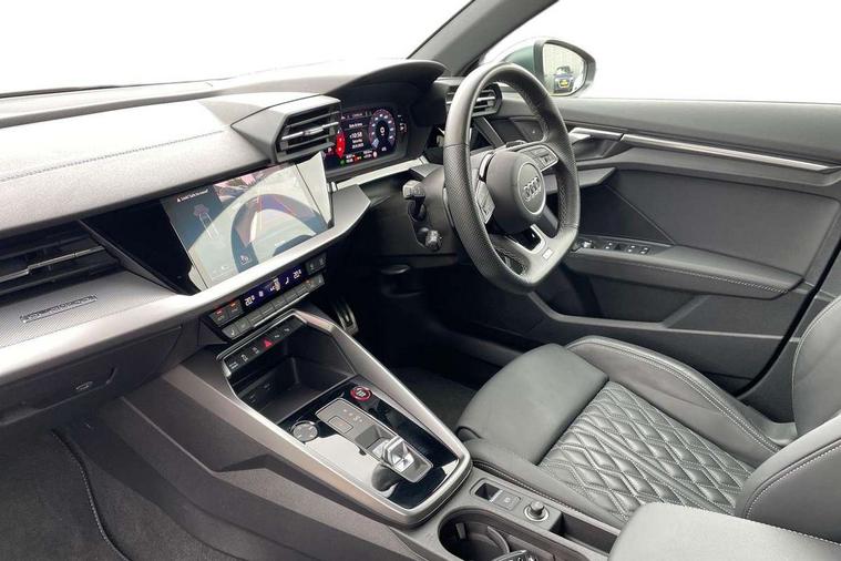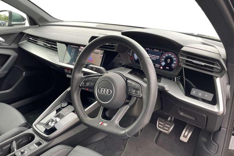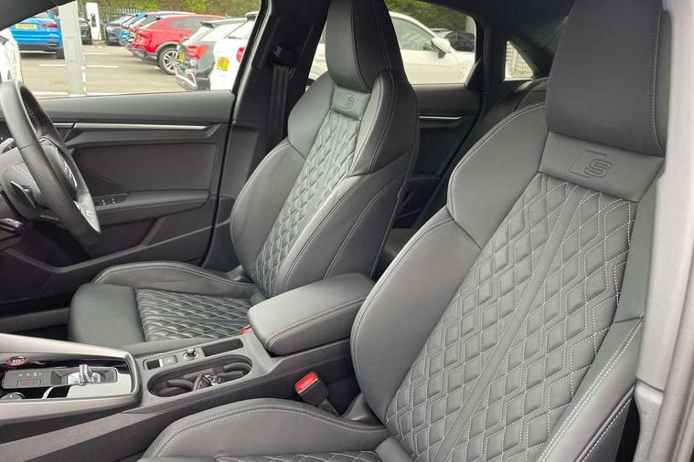 Audi connect emergency call and service, Audi drive select (Auto, Comfort, Dynamic, Efficiency and Individual), Audi smartphone interface, Audi Virtual Cockpit - 10.25" digital and colour instrument cluster, Automatic start/stop system with recuperation, Bluetooth interface, Collision avoidance assistant, Lane departure warning system, MMI Navigation Plus with high resolution 10.1" colour touch screen display, Progressive steering, Service indicator, Voice control system with natural language interaction, Quattro permanent all wheel drive, S sport suspension with spring damper adjustment and lowering by 15mm, 2x USB Type C ports (for charging and data transfer), 6 passive loudspeakers, CD player, DAB Digital radio, 3rd brake light, Acoustic glass windscreen, Audi Beam uses LEDs to project the Audi logo onto the ground as you exit your S3, Auto dimming frameless rear view mirror, Dual branch oval twin tailpipes in chrome plated finish, Electrically adjustable/heated/folding/dimming door mirrors with kerb view includes integrated LED indications + kerb view function for passenger side, Exterior mirror with aluminium look housing, Front electric windows, Headlight washers, Illuminated door sills with aluminium inserts at the front with S logo, LED daytime running lights, LED headlights with LED rear lights and dynamic rear indicators, Light and rain sensors, Model and engine designation badges at rear, Privacy glass - dark tinted rear window, rear door and side windows, Rear boot, Rear electric windows, Rear side wing doors, 12V socket and storage compartment in front centre console, 3 seat bench in 2nd row, 40/20/40 split folding rear seat bench with cupholder, Black cloth headlining, Dual zone electronic climate control, Fine Nappa leather upholstery with front sports seats S embossed logo, Front and rear centre armrest in leather, Front and rear headrests, Front/rear floor mats, Heated front seats, Height and reach adjustable steering wheel, Illuminated vanity mirror, Interior lighting - glove compartment light and right hand side, Luggage compartment floor covering, Manual boot compartment lid, Single front passenger seat, Stainless steel pedals and front footrest in black, Body styling design pack - S3, LED interior lighting pack - A3 Saloon, Storage pack - A3/S3 Saloon, 3x3 point rear seat belts, Driver and front passenger airbag with passenger airbag deactivation, Electronic Stabilisation Control (ESC) including ABS, ASR and EDL, First aid kit with warning triangle and 2 safety vests, Front side airbags with head airbags and interaction airbag, Hill hold assist, Pre-sense front with pedestrian and cyclist detection, Seatbelt monitoring, Tyre pressure loss indicator, Anti theft alarm, Anti-theft wheel bolts, Electronically operated child locks, Immobiliser, Remote control central locking, Aluminium air vent surrounds, Aluminium trim elements, Dark spectrum aluminium inlays, accent surfaces in the dashboard and centre console in platinum grey silk effect paint finish,