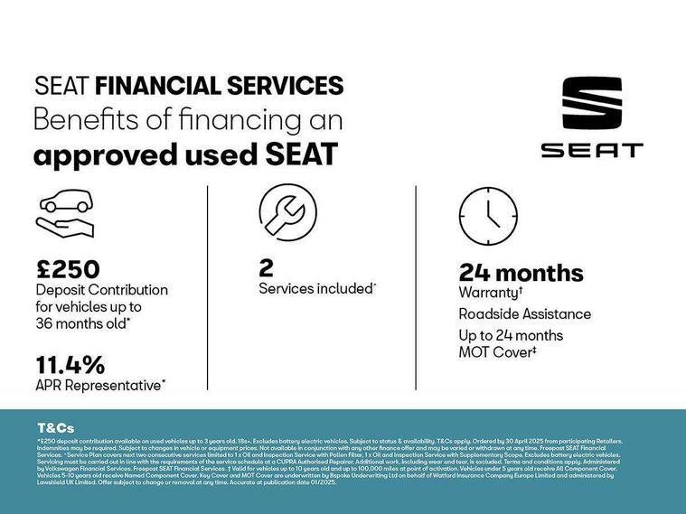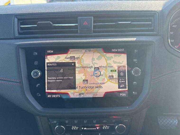 'Lights On' Reminder warning buzzer, Cruise control, Digital clock, Electric speed sensitive power steering, Front assistant collision mitigation, Full Link Smartphone Integration with Mirror Link, Apple Car Play, Google Android Auto, Low fuel warning light, Outside temperature display, Rear parking sensor, RPM counter, SEAT Drive profile, Trip computer, Sports suspension, 6 speakers, Bluetooth interface for hands free and audio streaming, DAB Digital radio, Steering wheel mounted audio controls, Anti theft roof antenna, Auto dimming interior rear view mirror, Automatic activation of hazard warning lights, Automatic headlights, Body coloured bumpers, Body coloured door handle inserts, Chrome grille surround, Chrome roof rails, Chrome window surround, Coming/leaving home lighting function, Dark tinted rear windows, Electric front/rear windows with one touch/auto up/down, Electrically adjustable and heated door mirrors, Electrically folding wing mirrors, Front fog lights, Full LED headlights, LED daytime running lights, LED licence plate lighting, LED tail lights, Rain sensor windscreen wipers, Rear fog lights, Rear window wash/wipe, Roof colour door mirrors, Twin exhaust pipes, Visible VIN plate, Windshield wiper with intermittent control and potentiometer, 2 cupholders, 3 rear height adjustable headrests, 60/40 split folding rear seat, Active head restraints, Ambient interior lighting, Card holder, Double boot floor, Driver and passenger sunvisors, Driver/front passenger seat height adjustment, Dual zone climate control, Dust/pollen filter, Flat bottomed steering wheel, Footwell ambient lighting, Front courtesy lights, Front reading light, Gear shift indicator, Gearshift paddles on steering wheel, Height/reach adjustable steering column, Illuminated boot, Instrument lighting with brightness control, Isofix attachments on rear seats, Leather handbrake, Leather steering wheel and gear knob, Multi-colour ambient interior lighting, Nora cloth upholstery, Sports seats, Connectivity pack plus - Arona, 3 point seatbelts on all rear seats, ABS+EBA, Child locks on rear doors, Driver/Front Passenger airbags, Electronic stability control, Front and rear seatbelt reminder, Front side/curtain airbags, Height adjustable active front headrests, Hill hold control + Tyre Pressure monitor, Multi-Collision braking, Passenger airbag deactivate switch, Tiredness recognition system, Traction control, 2 folding remote keys with window open/close function, Alarm with back-up horn, Immobiliser, Locking wheel bolts, Remote central locking + deadlocks, Tow away protection, Interior chrome line trim, 17" Dynamic alloy wheels,