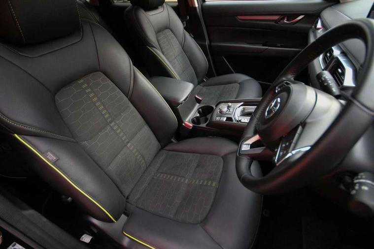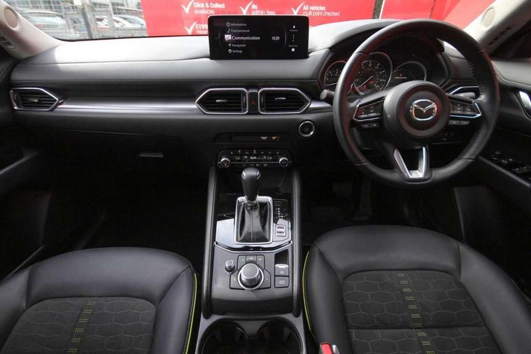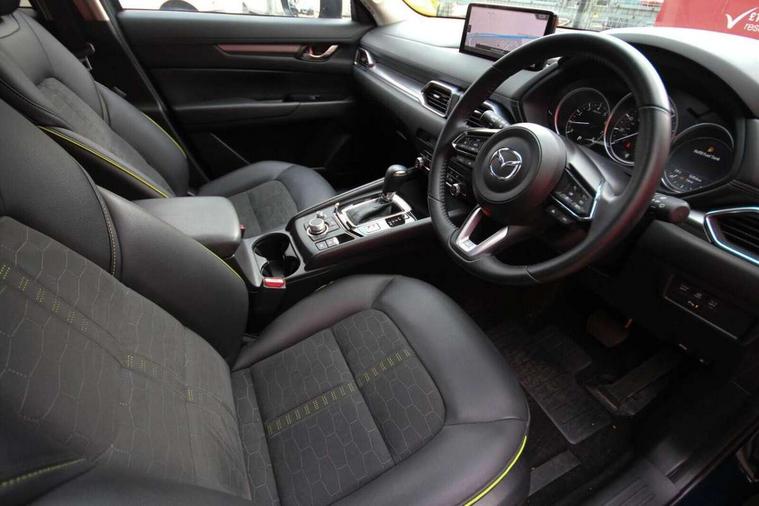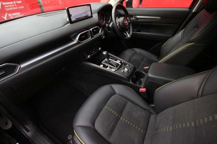 10.25" display with Mazda Connect infotainment, Advanced blind spot monitoring, Bluetooth connectivity with voice control, Collision prevention assist, Connected services, Cruising Traffic Support, Drive mode selector, Electric power steering, Emergency stop signalling system, Engine start/stop button, Forward collision warning, Front and rear parking sensors, High meter TFT display, Integrated navigation system, Intelligent speed assist, Lane departure warning system, Lane keep assist, Radar cruise control with Stop and Go, Rear cross traffic alert, Service indicator, Trip computer, Wireless apple car play/android Auto, Cylinder Deactivation, i-stop, 6 speakers, AM/FM radio, Bluetooth audio streaming, DAB Digital radio, Multimedia Commander including separate volume dial, Steering wheel mounted audio controls, Adaptive front lighting system, Auto dimming rear view mirror, Automatic headlights, Black mirror caps, Body colour roof spoiler, Body coloured front and rear black lower bumper mouldings, Coming/leaving home lighting function, Door mirror integrated indicators, Dual chrome tailpipes, Dusk sensitive headlamps, Electric front/rear windows with one touch auto up/down, Front and rear silver under garnish and side skirt, Front and rear silver under guard and side garnish, Front grille in material black finish, Front grille in satin finish with lime green accent + chrome signature wing, Gunmetal inlay dashboard panel, High beam assist, Intermittent rear wash/wipe, LED auto levelling, LED daytime running lights, LED front fog lights, LED Headlights, LED third brake light, Lime green front grille accent color, Louver bezel inner lime green accent, Power folding and heated door mirrors, Privacy glass (rear side windows only), Rain sensing front wipers, Rear side wing doors, Satin black B and C pillars, Satin black side mouldings, Scuff plates, Shark fin antenna, Signature LED rear combination lights, Variable intermittent front wash/wipe, Vinyl with lime green door trim panel, 12v electrical power outlet, 3 seat bench in 2nd row, 3 stage heated front seats, 40:20:40 Karakuri fold-flat seat system, 6 way power adjustable driver seat, Driver seat lumbar adjustment, Driver seat power slide, recline and height adjustment, Driver, Front passenger and two rear grab handles with coat hooks, Driver/passenger front seatback pockets, Driver/passenger sunvisors + illuminated vanity mirrors (drivers with ticket holder), Dual zone climate control, Folding centre armrest with 2 cup holders, Front and rear door pockets, Front centre storage with two cupholders, Front passenger seat manual slide, recline and height adjust, Height adjustable passenger seat, Humidity sensor, Illuminated glovebox, Interior dome light with integral spotlight, ISOFIX child seat anchorage points attached on outer rear seats, Karakuri tonneau cover, Leather wrapped steering wheel and gear knob, Leatherette door trim, Leatherette/suede upholstery, Light roof lining, Luggage compartment LED lighting, Luggage compartment power outlet, Rear air vents, Rear headrests, Rear seat recline, Reversible waterproof cargo board, Roof mounted sunglasses holder, Single front passenger seat, Standard air vents in silver, Three height adjustable head restraints, Tilt/height adjustable steering wheel, USB Connectivity (2x front Type-C, 2x rear Type-B), White interior LED illumination lighting, 3 point front seatbelts with pre-tensioners, 3 rear 3 point seatbelts, ABS, Advanced Smart City Brake Support - SCBS, Child locks on rear doors, Driver and front passenger side airbags, DSTC-Dynamic Stability and Traction Control, Dual front airbags, Electronic brake force distribution, Electronic parking brake with auto hold, ESP, Front and rear curtain airbags, Front passenger airbag deactivation, G-Vectoring control, Hill hold assist, Seatbelt reminder front and rear, Single stage passenger airbags, Smart brake support with forward obstruction warning, Tyre pressure monitoring system, Automatic door locking when moving off, Deadlock, Immobiliser, Power door locks, Remote central locking, Thatcham Cat.1 alarm, 19" diamond cut black alloy wheels, Tyre repair kit,