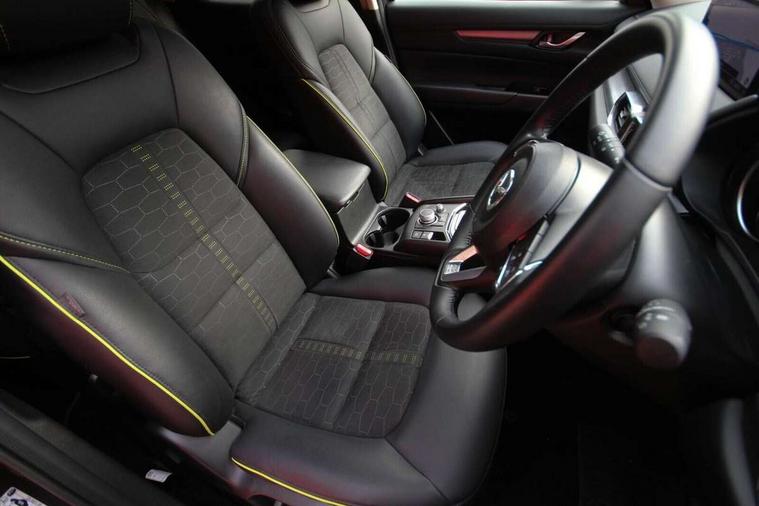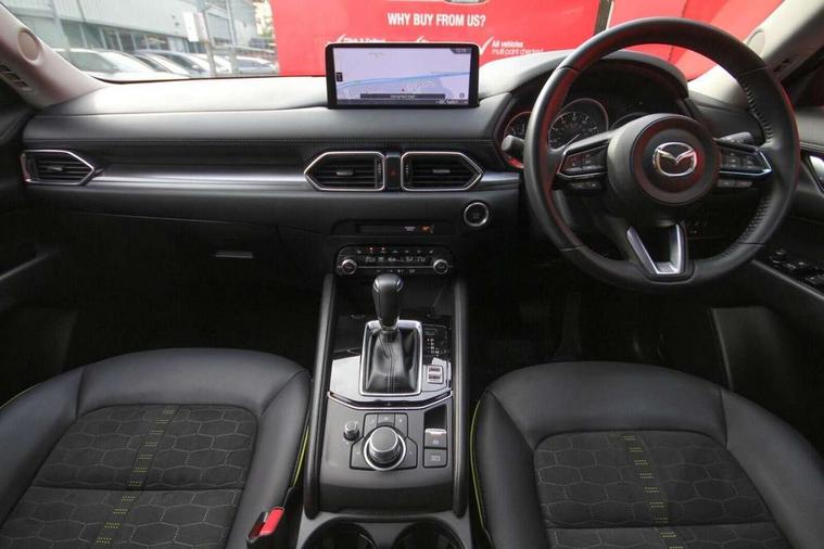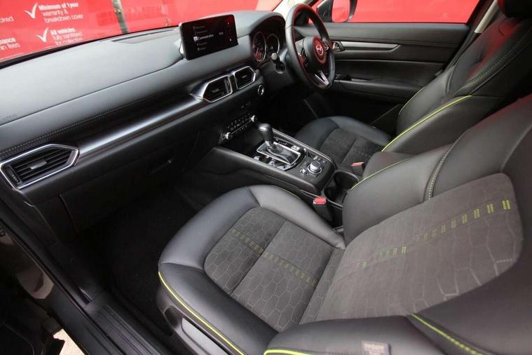 10.25" display with Mazda Connect infotainment, Advanced blind spot monitoring, Bluetooth connectivity with voice control, Collision prevention assist, Connected services, Cruising Traffic Support, Drive mode selector, Electric power steering, Emergency stop signalling system, Engine start/stop button, Forward collision warning, Front and rear parking sensors, High meter TFT display, Integrated navigation system, Intelligent speed assist, Lane departure warning system, Lane keep assist, Radar cruise control with Stop and Go, Rear cross traffic alert, Service indicator, Trip computer, Wireless apple car play/android Auto, Cylinder Deactivation, i-stop, 6 speakers, AM/FM radio, Bluetooth audio streaming, DAB Digital radio, Multimedia Commander including separate volume dial, Steering wheel mounted audio controls, Adaptive front lighting system, Auto dimming rear view mirror, Automatic headlights, Black mirror caps, Body colour roof spoiler, Body coloured front and rear black lower bumper mouldings, Coming/leaving home lighting function, Door mirror integrated indicators, Dual chrome tailpipes, Dusk sensitive headlamps, Electric front/rear windows with one touch auto up/down, Front and rear silver under garnish and side skirt, Front and rear silver under guard and side garnish, Front grille in material black finish, Front grille in satin finish with lime green accent + chrome signature wing, Gunmetal inlay dashboard panel, High beam assist, Intermittent rear wash/wipe, LED auto levelling, LED daytime running lights, LED front fog lights, LED Headlights, LED third brake light, Lime green front grille accent color, Louver bezel inner lime green accent, Power folding and heated door mirrors, Privacy glass (rear side windows only), Rain sensing front wipers, Rear side wing doors, Satin black B and C pillars, Satin black side mouldings, Scuff plates, Shark fin antenna, Signature LED rear combination lights, Variable intermittent front wash/wipe, Vinyl with lime green door trim panel, 12v electrical power outlet, 3 seat bench in 2nd row, 3 stage heated front seats, 40:20:40 Karakuri fold-flat seat system, 6 way power adjustable driver seat, Driver seat lumbar adjustment, Driver seat power slide, recline and height adjustment, Driver, Front passenger and two rear grab handles with coat hooks, Driver/passenger front seatback pockets, Driver/passenger sunvisors + illuminated vanity mirrors (drivers with ticket holder), Dual zone climate control, Folding centre armrest with 2 cup holders, Front and rear door pockets, Front centre storage with two cupholders, Front passenger seat manual slide, recline and height adjust, Height adjustable passenger seat, Humidity sensor, Illuminated glovebox, Interior dome light with integral spotlight, ISOFIX child seat anchorage points attached on outer rear seats, Karakuri tonneau cover, Leather wrapped steering wheel and gear knob, Leatherette door trim, Leatherette/suede upholstery, Light roof lining, Luggage compartment LED lighting, Luggage compartment power outlet, Rear air vents, Rear headrests, Rear seat recline, Reversible waterproof cargo board, Roof mounted sunglasses holder, Single front passenger seat, Standard air vents in silver, Three height adjustable head restraints, Tilt/height adjustable steering wheel, USB Connectivity (2x front Type-C, 2x rear Type-B), White interior LED illumination lighting, 3 point front seatbelts with pre-tensioners, 3 rear 3 point seatbelts, ABS, Advanced Smart City Brake Support - SCBS, Child locks on rear doors, Driver and front passenger side airbags, DSTC-Dynamic Stability and Traction Control, Dual front airbags, Electronic brake force distribution, Electronic parking brake with auto hold, ESP, Front and rear curtain airbags, Front passenger airbag deactivation, G-Vectoring control, Hill hold assist, Seatbelt reminder front and rear, Single stage passenger airbags, Smart brake support with forward obstruction warning, Tyre pressure monitoring system, Automatic door locking when moving off, Deadlock, Immobiliser, Power door locks, Remote central locking, Thatcham Cat.1 alarm, 19" diamond cut black alloy wheels, Tyre repair kit,