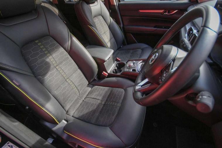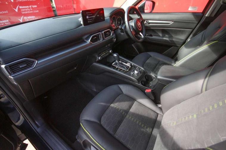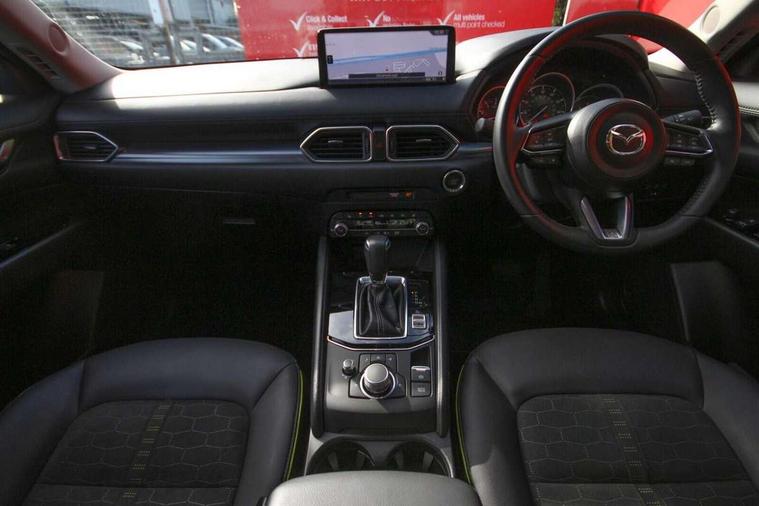 10.25" display with Mazda Connect infotainment, Advanced blind spot monitoring, Bluetooth connectivity with voice control, Collision prevention assist, Connected services, Cruising Traffic Support, Drive mode selector, Electric power steering, Emergency stop signalling system, Engine start/stop button, Forward collision warning, Front and rear parking sensors, High meter TFT display, Integrated navigation system, Intelligent speed assist, Lane departure warning system, Lane keep assist, Radar cruise control with Stop and Go, Rear cross traffic alert, Service indicator, Trip computer, Wireless apple car play/android Auto, Cylinder Deactivation, i-stop, 6 speakers, AM/FM radio, Bluetooth audio streaming, DAB Digital radio, Multimedia Commander including separate volume dial, Steering wheel mounted audio controls, Adaptive front lighting system, Auto dimming rear view mirror, Automatic headlights, Black mirror caps, Body colour roof spoiler, Body coloured front and rear black lower bumper mouldings, Coming/leaving home lighting function, Door mirror integrated indicators, Dual chrome tailpipes, Dusk sensitive headlamps, Electric front/rear windows with one touch auto up/down, Front and rear silver under garnish and side skirt, Front and rear silver under guard and side garnish, Front grille in material black finish, Front grille in satin finish with lime green accent + chrome signature wing, Gunmetal inlay dashboard panel, High beam assist, Intermittent rear wash/wipe, LED auto levelling, LED daytime running lights, LED front fog lights, LED Headlights, LED third brake light, Lime green front grille accent color, Louver bezel inner lime green accent, Power folding and heated door mirrors, Privacy glass (rear side windows only), Rain sensing front wipers, Rear side wing doors, Satin black B and C pillars, Satin black side mouldings, Scuff plates, Shark fin antenna, Signature LED rear combination lights, Variable intermittent front wash/wipe, Vinyl with lime green door trim panel, 12v electrical power outlet, 3 seat bench in 2nd row, 3 stage heated front seats, 40:20:40 Karakuri fold-flat seat system, 6 way power adjustable driver seat, Driver seat lumbar adjustment, Driver seat power slide, recline and height adjustment, Driver, Front passenger and two rear grab handles with coat hooks, Driver/passenger front seatback pockets, Driver/passenger sunvisors + illuminated vanity mirrors (drivers with ticket holder), Dual zone climate control, Folding centre armrest with 2 cup holders, Front and rear door pockets, Front centre storage with two cupholders, Front passenger seat manual slide, recline and height adjust, Height adjustable passenger seat, Humidity sensor, Illuminated glovebox, Interior dome light with integral spotlight, ISOFIX child seat anchorage points attached on outer rear seats, Karakuri tonneau cover, Leather wrapped steering wheel and gear knob, Leatherette door trim, Leatherette/suede upholstery, Light roof lining, Luggage compartment LED lighting, Luggage compartment power outlet, Rear air vents, Rear headrests, Rear seat recline, Reversible waterproof cargo board, Roof mounted sunglasses holder, Single front passenger seat, Standard air vents in silver, Three height adjustable head restraints, Tilt/height adjustable steering wheel, USB Connectivity (2x front Type-C, 2x rear Type-B), White interior LED illumination lighting, 3 point front seatbelts with pre-tensioners, 3 rear 3 point seatbelts, ABS, Advanced Smart City Brake Support - SCBS, Child locks on rear doors, Driver and front passenger side airbags, DSTC-Dynamic Stability and Traction Control, Dual front airbags, Electronic brake force distribution, Electronic parking brake with auto hold, ESP, Front and rear curtain airbags, Front passenger airbag deactivation, G-Vectoring control, Hill hold assist, Seatbelt reminder front and rear, Single stage passenger airbags, Smart brake support with forward obstruction warning, Tyre pressure monitoring system, Automatic door locking when moving off, Deadlock, Immobiliser, Power door locks, Remote central locking, Thatcham Cat.1 alarm, 19" diamond cut black alloy wheels, Tyre repair kit,