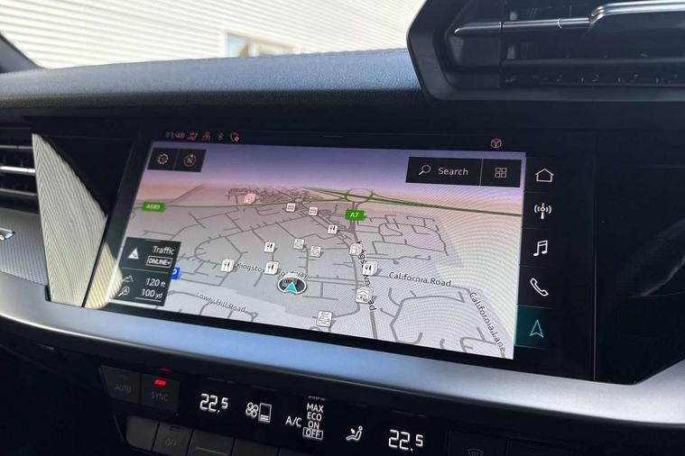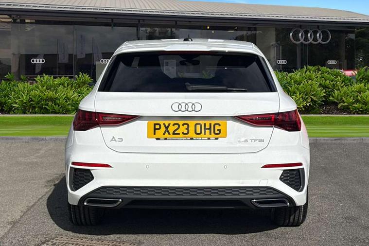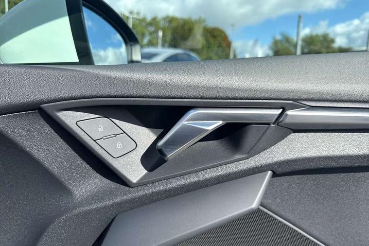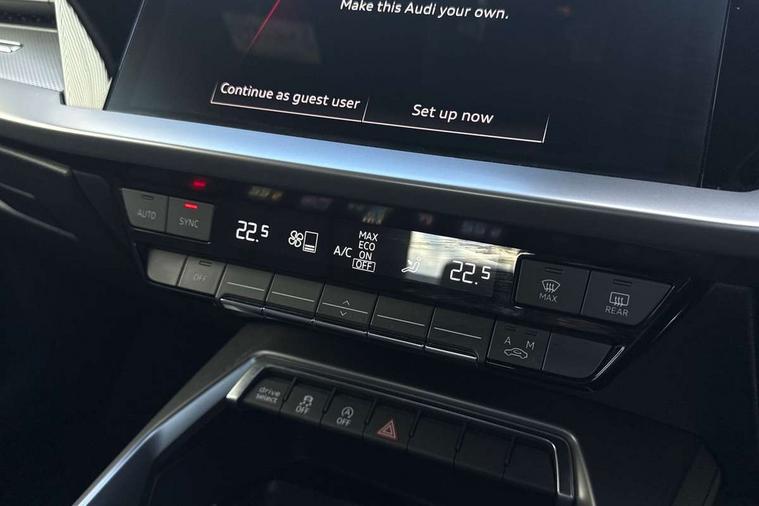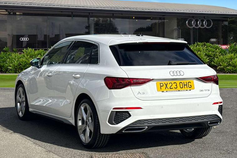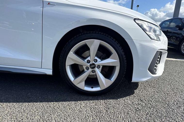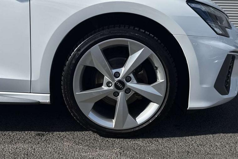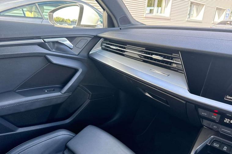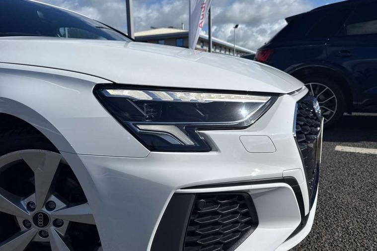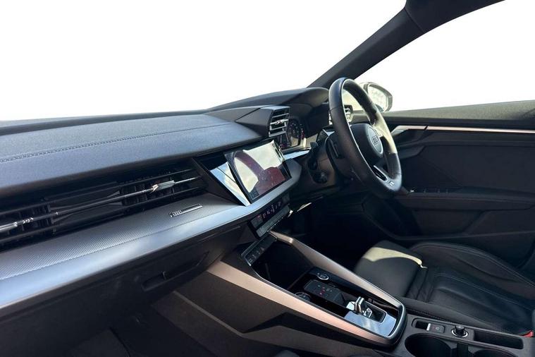Audi drive select (Auto, Comfort, Dynamic, Efficiency and Individual), Audi smartphone interface, Audi Virtual Cockpit - 10.25" digital and colour instrument cluster, Automatic start/stop system with recuperation, Bluetooth interface, Camera based traffic sign recognition, Collision avoidance assistant, e-Call (emergency call), Electromechanical power speed sensitive steering, Lane departure warning system, MMI Navigation Plus with high resolution 10.1" colour touch screen display, Service indicator, Trip computer, Voice control system with natural language interaction, Sports suspension, 2xUSB-C connection with data and charging functions, 6 passive loudspeakers, DAB Digital radio, 3rd brake light, Acoustic glass windscreen, Aluminium window trim, Auto dimming frameless rear view mirror, Body colour exterior mirrors, Electrically adjustable/heated/folding/auto dimming door mirrors with integrated LED indications + kerb view function for passenger side, Front electric windows, Illuminated aluminium inserts front door sills with S logo, LED daytime running lights, LED headlights with LED rear lights and dynamic rear indicators, Light and rain sensors, Privacy glass - dark tinted rear window, rear door and side windows, Rear electric windows, Rear side air outlets in grained matt black, Rear side wing doors, Rear wiper, S line bumpers, S roof spoiler, 12V socket and storage compartment in front centre console, 3 seat bench in 2nd row, 3 spoke leather multifunction steering wheel with paddle shift, 4 way electrically adjustable lumbar support for driver and front passenger, 60/40 split folding rear seat bench, Black cloth headlining, Dual zone electronic climate control, Front and rear centre armrest in leather, Front and rear headrests, Front/rear floor mats, Height and reach adjustable steering wheel, Interior lighting - glove compartment light and right hand side, Luggage compartment floor covering, Manual boot compartment lid, Manually adjustable front seats, Seat side bolsters, Single front passenger seat, Stainless steel pedals and front footrest in black, Twin leather upholstery with front sports seats S embossed logo, Aluminium interior elements pack - A3 Sportback, LED interior lighting pack - A3 Sportback, S line styling pack - A3 Sportback, 3x3 point rear seat belts, Driver and front passenger airbag with passenger airbag deactivation, Electronic Stabilisation Control (ESC) including ABS, ASR and EDL, First aid kit with warning triangle and 2 safety vests, Front side airbags with head airbags and interaction airbag, Pre-sense front with pedestrian and cyclist detection, Seatbelt monitoring, Tyre pressure loss indicator, Anti theft alarm, Anti-theft wheel bolts, Electronically operated child lock, Immobiliser, Remote control central locking, Dark spectrum aluminium inlays, accent surfaces in the dashboard and centre console in platinum grey silk effect paint finish,
