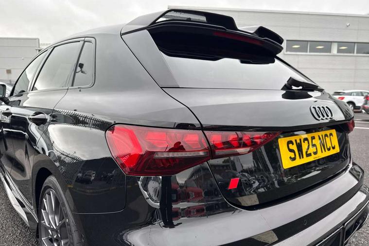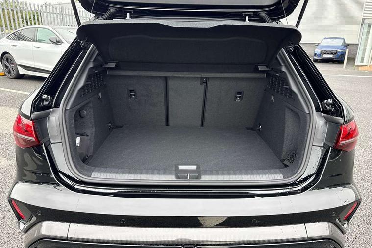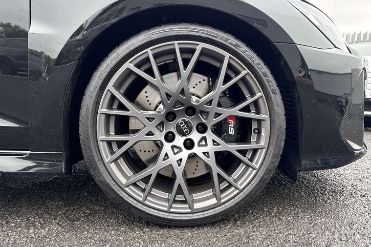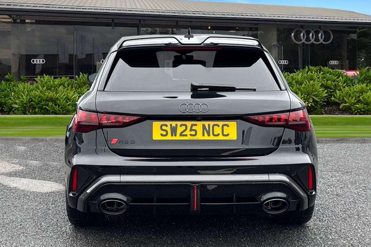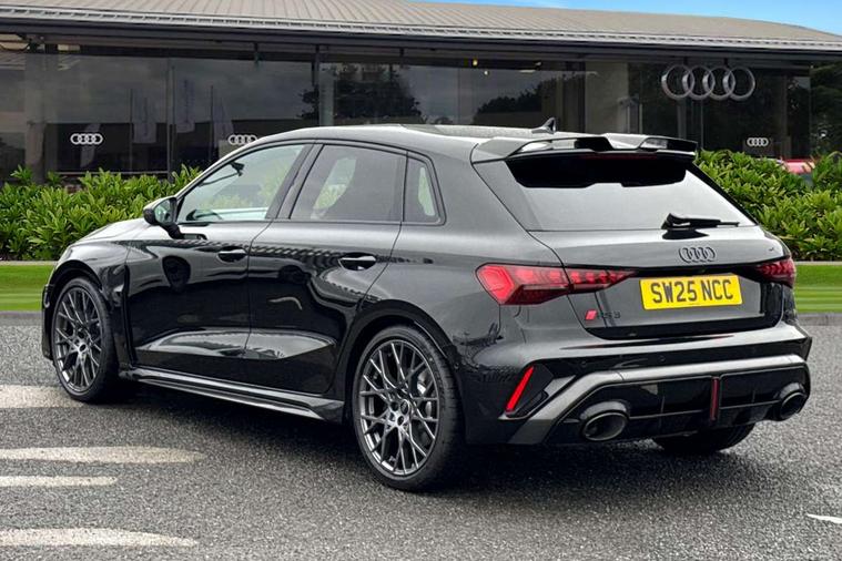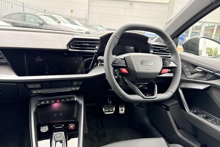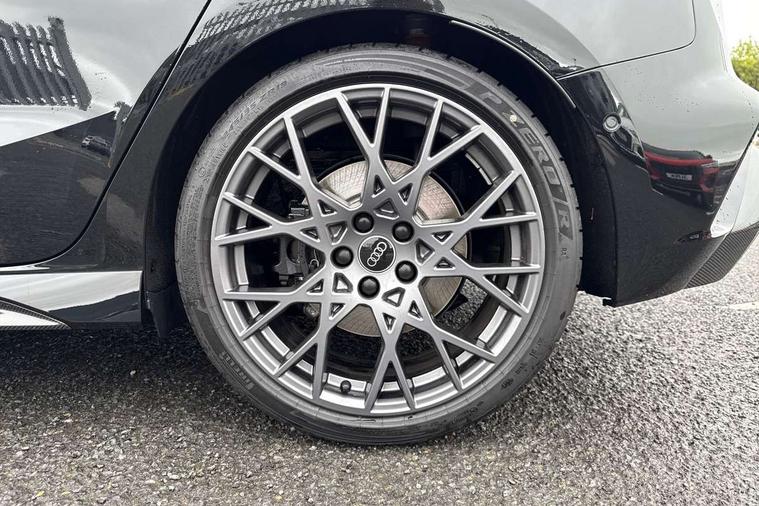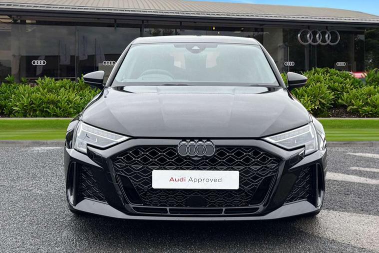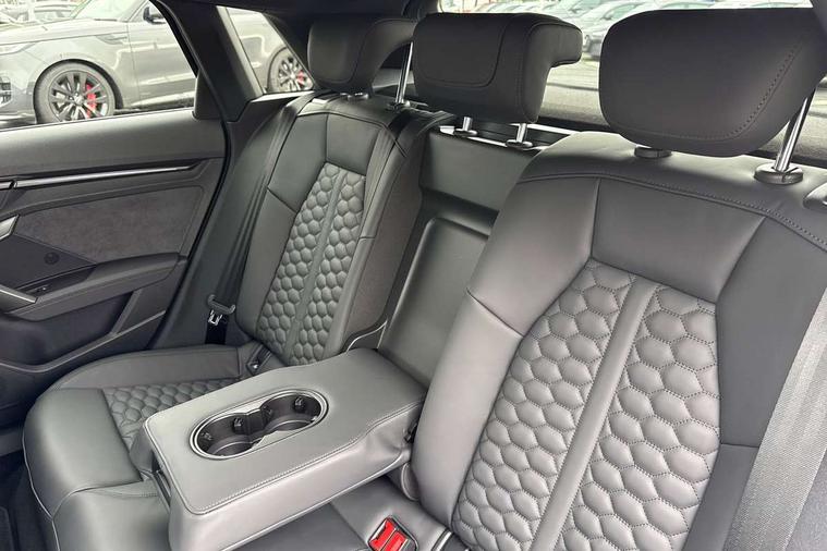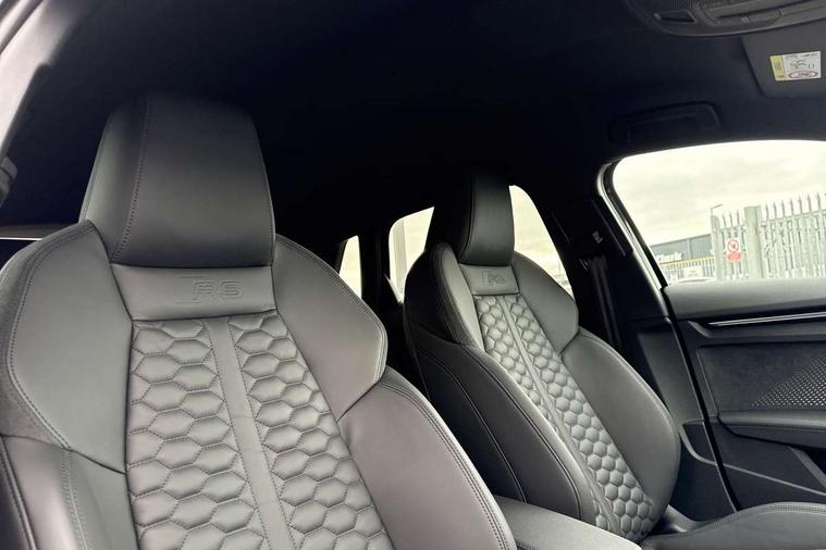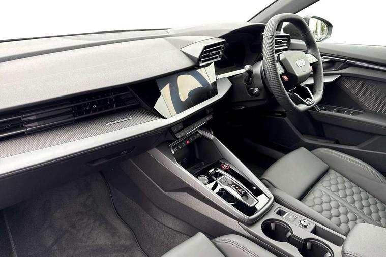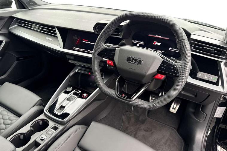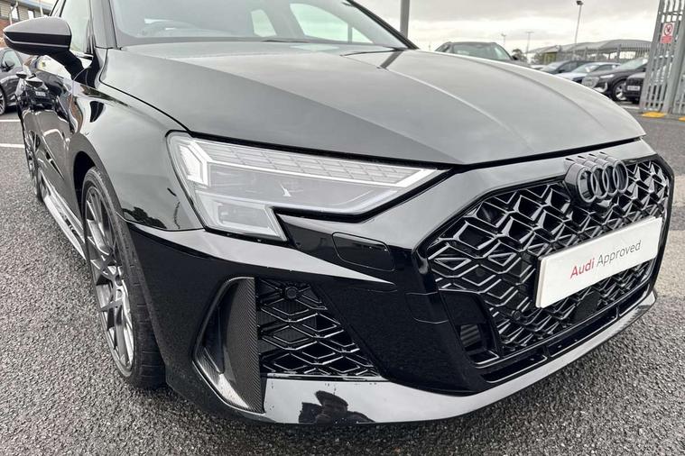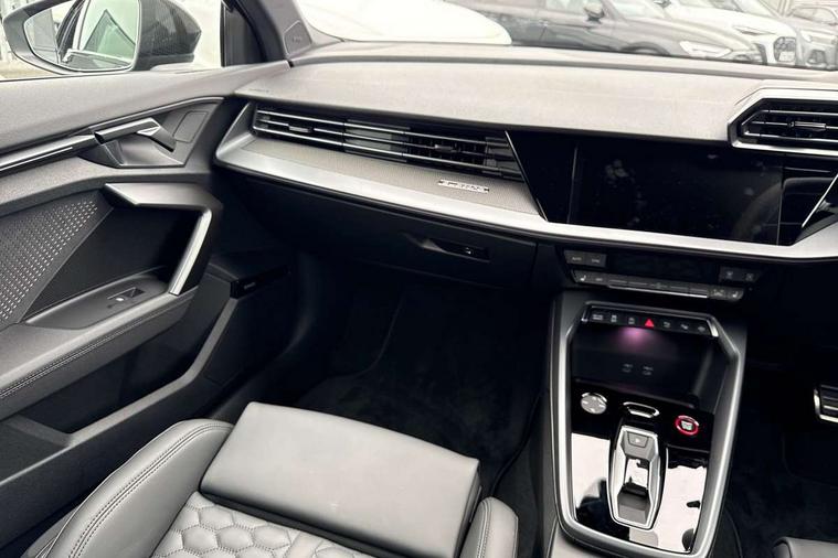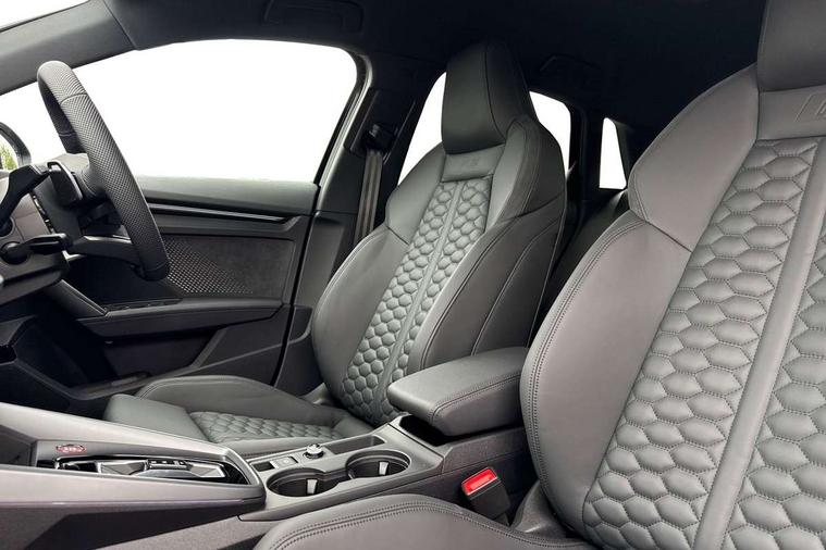 Adjustable speed limiter, Audi drive select comfort, auto, dynamic and efficiency, Audi smartphone interface with app store includes wireless Apple carplay, Android auto and Amazon alexa integration, Audi virtual cockpit plus with RS specific design and 12.3" display with additional graphic display options, Automatic start/stop system with recuperation, Bluetooth interface, Camera based traffic sign recognition, Collision avoidance assistant, Distraction and Fatigue warning, e-Call (emergency call), Lane departure warning system, MMI Navigation Plus with high resolution 10.1" colour touch screen display, Park Assist with parking system Plus, Progressive steering, RS specific driving modes - RS Individual, RS Performance and RS Torque rear, Voice control system with natural language interaction, Quattro permanent four wheel drive, Audi Phonebox light with wireless charging, DAB Digital radio, USB ports with charging function in the rear, All weather light, Audi beam LED projection of RS logo on ground as you exit, Audi darkened matrix LED headlights with dynamic light sequencing and dynamic indicator, Auto dimming frameless rear view mirror, Automatic dynamic range control, Carbon door mirror housings, Carbon fibre engine cover, Dipped beam, main beam, position light and turning light, Dynamic RS specific light sequencing of the coming home and leaving home function, Electrically adjustable/heated/folding/auto dimming door mirrors with integrated LED indications + kerb view function for passenger side, Exterior model badging, Front electric windows, Headlight cleaning system, Heat insulating glass windscreen, Intersection light, LED 3rd brake light, LED brake lights, LED rear lights with dynamic light sequencing and dynamic indicator, LED rear number plate lights, LED reverse light, LED tail lights, Light and rain sensors, Manoeuvring light, Motorway light, Privacy glass - dark tinted rear window, rear door and side windows, Rear electric windows, Rear side wing doors, Rear wiper, Roof edge spoiler in carbon, RS dual branch exhaust system with two chrome plated oval tailpipe trims, Static Cornering lights, Visually upgraded RS specific daytime running light choice of 4 digital signature in chequered flag design within the headlight, 12V socket and storage compartment in front centre console, 3 seat bench in 2nd row, 3 Spoke flat top and bottomed black leather multi function steering and gear shift paddles, 3-zone deluxe automatic air conditioning, 40/20/40 split folding rear seat bench, Black cloth headlining, Black front and rear floor mats, Front and rear headrests, Front centre armrest, Front door sill trims with RS 3 logo, Front sports seats RS embossed logo, Heated front seats, Height and reach adjustable steering wheel, Manual boot compartment lid, Manually adjustable front seats, Rear centre armrest with cupholder, Seat side bolsters, Single front passenger seat, Stainless steel pedals and front footrest in black, Vanadium look - Interior door handles, Door trim, power latching, Air vents, window controls, mirror adjust, rear door lock, Selector lever in centre console, Black Styling plus package - RS3, Extended ambient lighting package Pro with Multi-coloured contour lighting of instrument panel - RS3, RS exterior features pack in carbon and gloss black - RS3, RS sport suspension pack - RS3, Storage package - RS3 Sportback, Technology package without speed limiter - RS3, 3x3 point rear seat belts, Driver and front passenger airbag with passenger airbag deactivation, Electronic Stabilisation Control (ESC) including ABS, ASR and EDL, First aid kit with warning triangle and 2 safety vests, Hill hold assist, Pre-sense front with pedestrian and cyclist detection, RS steel brakes, Seatbelt monitoring, Tyre pressure loss indicator, Anti theft alarm, Anti-theft wheel bolts, Electronically operated child locks, Immobiliser, Remote central locking with safelock, Black dashboard, Inlays in carbon atlas structure, 19" 10 cross spoke silk matt grey alloy wheels, Tyre repair kit,