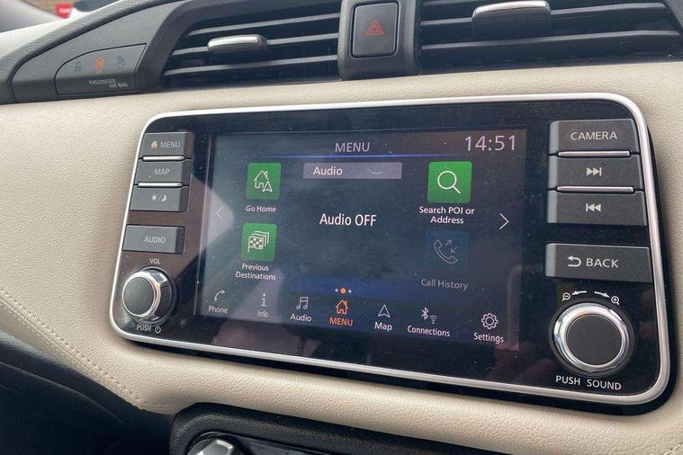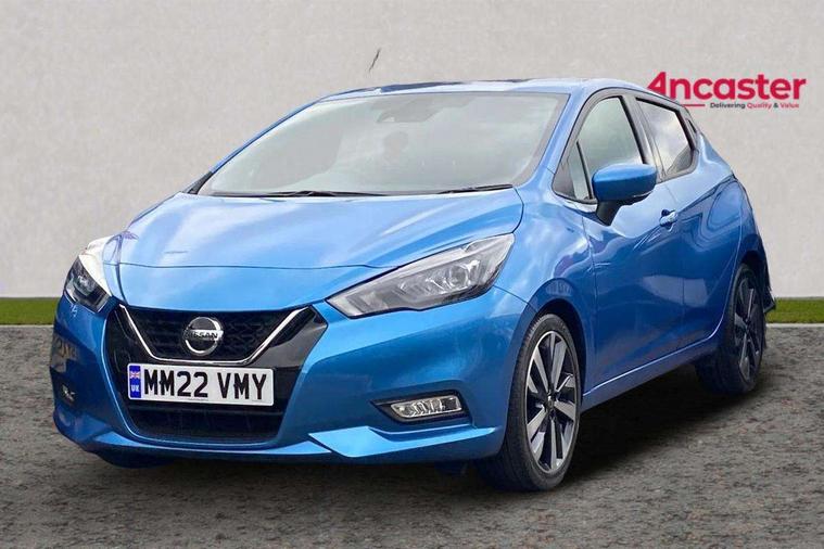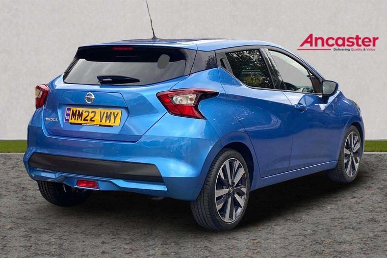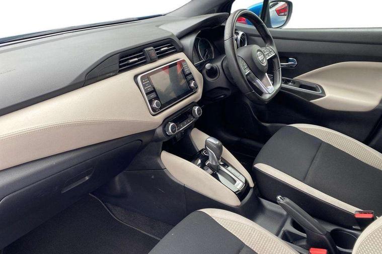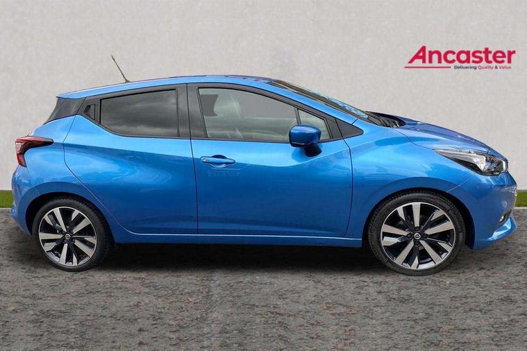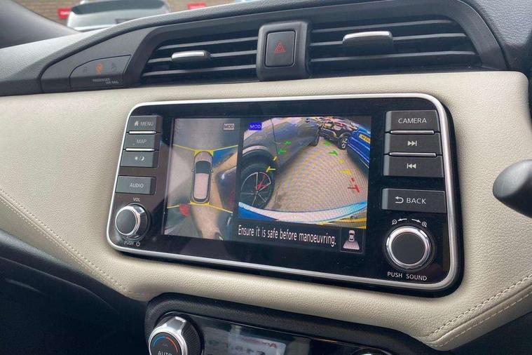 360 degree around view monitor, Adjustable speed limiter, Advanced drive assist display 5'' TFT coloured screen, Bluetooth system, Cruise control, eCall emergency call system, Engine start button, Lane departure prevention, Lane departure warning system, Nissan Connect touchscreen navigation and Entertainment system, Outside temperature gauge, Power assist steering, Rear parking sensors, Rear view camera, Smartphone integration with Apple CarPlay and Android auto, Stop/start system, TomTom services, Traffic sign recognition, Trip computer, Audio system with MP3, DAB Digital radio, Steering wheel mounted audio controls, USB/iPod connection, Antenna, Auto dimming rear view mirror, Automatic activation of hazard warning lights, Automatic headlights, Body colour front door handles, Body coloured bumpers, Body coloured door mirrors, Concealed rear door handles, Electric folding door mirrors, Front and rear electric windows, Front fog lights, Heated door mirrors, High beam assist, High mounted stop lamp, Jacknife key type x1, LED Headlights, LED signature daytime running lights, LED turn indicators on door mirrors, Rain sensor windscreen wipers, Rear privacy glass, Rear roof spoiler, Rear side wing doors, Rear wiper with reverse link, Variable front intermittent wipers, 12V power point front, 2 height adjustable rear headrests, 2 x front and 1 x rear cup holders, 3 seat bench in 2nd row, 60/40 split folding rear seat, Automatic air conditioning, Boot compartment cover, Boot light, Chrome interior door handles, Driver's seat manual height adjust, Driver/passenger sunvisors and vanity mirrors, Front and rear door pockets with bottle holders, Front console storage box, Gear shift indicator, Height adjustable front headrests with satin sliver decoration, Illuminated electric window switch, Isofix front passenger and rear seat preparation, Leather wrapped gear shift knob, Leather wrapped parking break, Leather wrapped steering wheel, LED ambient lighting in front console storage, Map reading lamp, Parcel shelf, Passenger seat back pocket, Reclining front seats, Single front passenger seat, Synthetic leather front door pads, Synthetic leather instrumental panel inserts, Tilt/telescopic adjustable steering wheel, BOSE Personal audio pack - Micra, ABS+EBD+Brake assist, Crash sensor, Driver/Front Passenger airbags, Front and rear curtain airbags, Front side airbags, Height adjustable front seatbelts with pre-tensioners and load limiters, Hill start assist, Intelligent emergency braking with pedestrian recognition, Passenger airbag deactivation system, Rear door child safety locks, Rear seatbelts with pre-tensioners and load limiters, Seatbelt warning, Three 3 point rear seatbelts, Tyre pressure monitoring system, Warning triangle and first aid kit, Anti-theft immobiliser, Intelligent key with push button ignition, Remote central locking, 17" Diamond cut alloy wheels, Tyre repair kit,