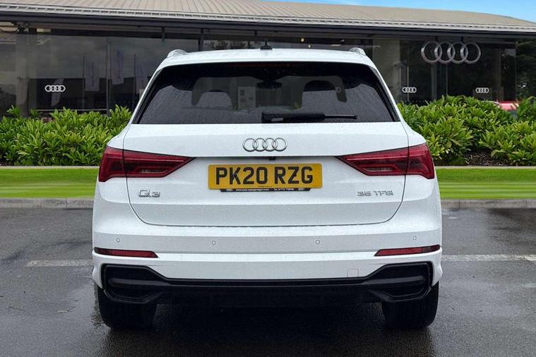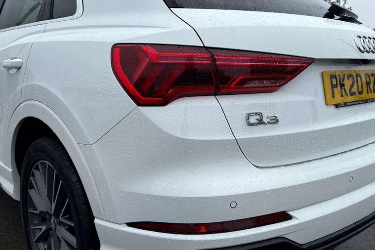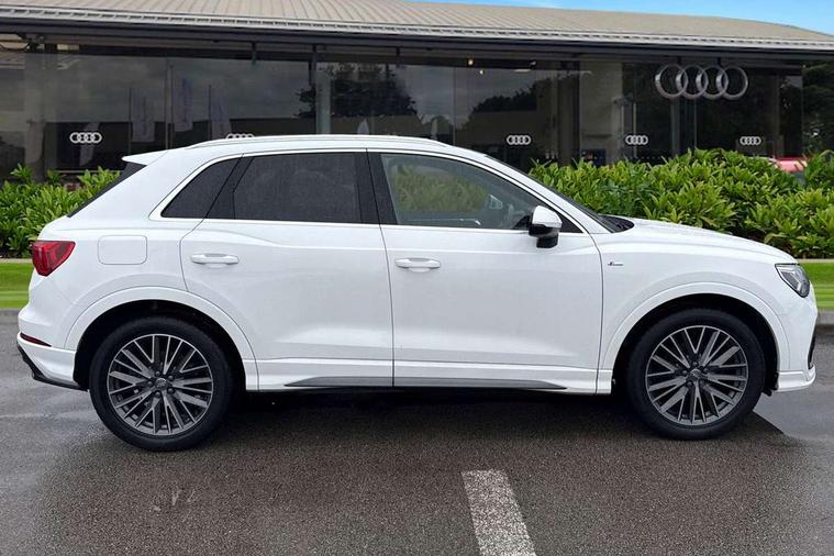 Apple CarPlay, Audi connect safety and service (e-call), Audi drive select, Audi lane departure warning, Audi side assist, Audi smartphone interface, Audi Virtual Cockpit - 10.25" display, Bluetooth interface, Camera based traffic sign recognition, Cruise control + speed limiter, MMI Navigation Plus with high resolution 10.1 inch touchscreen colour display, Power opening/closing tailgate, Progressive steering, Rear parking sensors, Service interval indicator, Start stop system with recuperation, Voice control system with natural language interaction, Sports suspension, 1 x USB type C and 1 USB type A charging points, 6 speakers, DAB digital radio module, Acoustic windscreen, Aluminium roof rails, Aluminium window trim, Auto dimming frameless rear view mirror, Body coloured bumpers, Electrically folding, adjustable and heated door mirrors with integrated LED side indicators and kerb view function for passenger side, Front and rear electric windows, Front fog lights, Front side air inlets in matt platinum grey, Front spoiler blade in matt platinum grey, Grille vertical bars in aluminium silver/Matt, High gloss black finish B and C pillars, LED headlights with LED daytime running lights and dynamic rear indicator, LED rear lights, Privacy glass, Rain and light sensors, Rear diffuser strip in matt titanium black, S Line badge on wings, S Line front and rear bumpers, Side skirt insert in matt Platinium grey, Silver chrome grille surround, Titanium black radiator grille, 12V socket in rear centre console, 40:20:40 split folding rear bench seat, 60:40 forwards/backwards position and backrest angle, Adjustable rear seat bench/backrest with centre armrest and cupholder, Aluminium door sill trims, Black cloth headlining, Dual zone electronic climate control, Front and rear black floor mats with contrast stitching in rock grey, Front and rear headrests, Front and rear roof module including reading lights, Front centre armrest with storage compartment and angle adjustment, Glove compartment lighting, Height and reach adjustable steering wheel, Illuminated door sill trims with S logo, ISOFIX child seat mounting and Top Tether with front passenger airbag deactivation, Luggage compartment light, Manual front seats with height adjustment, Perforated leather gearknob, Stainless steel luggage compartment sill finisher, Stainless steel pedals, Non smoking pack - Q3, 3x3 point rear seatbelts, 6 airbags - Driver, front passenger, curtain and side windows, Electrically operated child locks on rear doors, Electromechanical parking brake, Electronic stabilisation control including ABS, ASR and EDL, Hill descent control, Hill hold assist, Pre sense basic, Seatbelt monitoring, Tyre pressure warning, Warning triangle and first aid kit, Anti theft alarm, Anti theft wheel bolts, Audi pre-sense front with pedestrain and cyclist recognition, Remote central locking, Dark matt brushed aluminium inlay, Leatherette door armrest, MMI touch colour display in gloss black with aluminium surround,