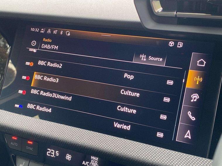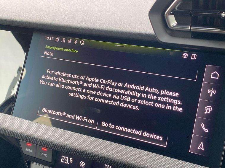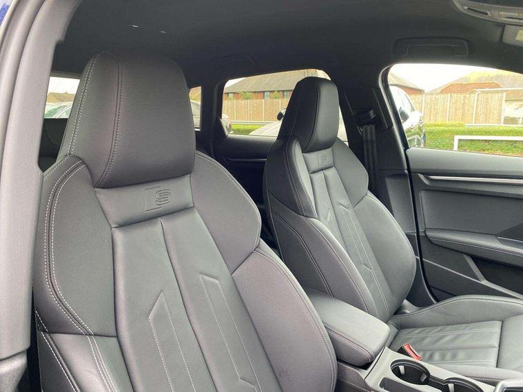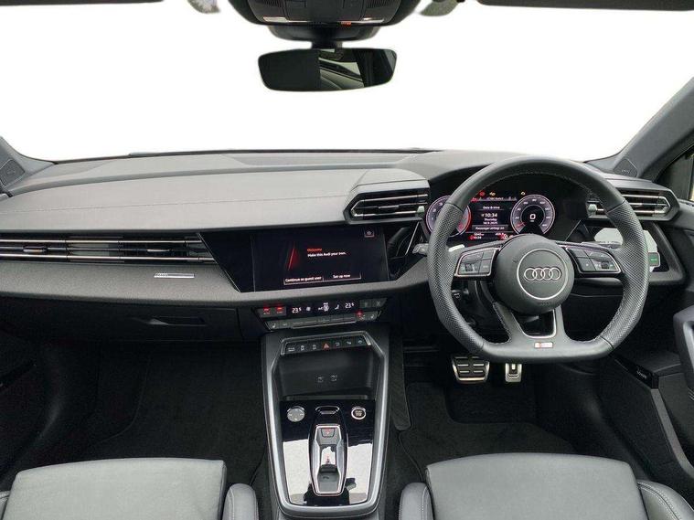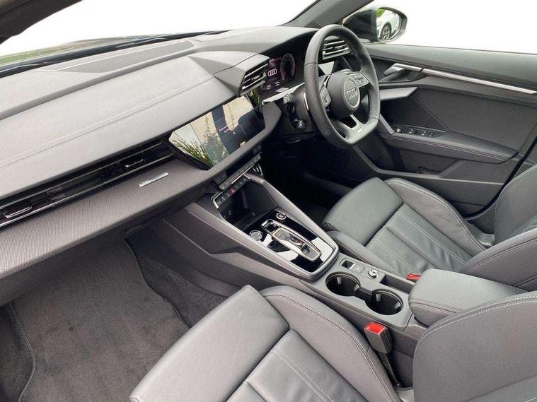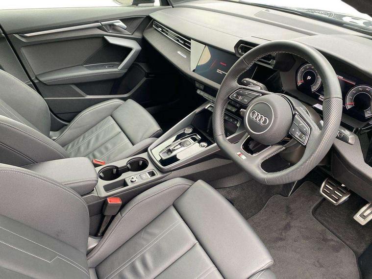 Adjustable speed limiter, Audi drive select, Audi smartphone interface with app store includes wireless Apple carplay, Android auto and Amazon alexa integration, Audi virtual cockpit plus - 12.3" full HD resolution dynamic digital instrument cluster, Automatic start/stop system with recuperation, Bluetooth interface, Camera based traffic sign recognition, Collision avoidance assistant, Cruise control, Distraction and Fatigue warning, e-Call (emergency call), Electromechanical power speed sensitive steering, Lane departure warning system, MMI Navigation Plus with high resolution 10.1" colour touch screen display, Park Assist with parking system Plus, Service indicator, Tailgate, Trip computer, Voice control system with natural language interaction, Sports suspension, Audi Phonebox light with wireless charging, Audi sound system - 10 loudspeakers including centre loudspeaker and subwoofer, DAB Digital radio, USB ports with charging function in the rear, Acoustic glass windscreen, Anthracite grey Audi rings (front and rear), Audi beam uses LEDs to project the Audi logo onto the ground as you exit your A3, Auto dimming frameless rear view mirror, Black accents front and rear bumpers, Black accents in the area of the Audi single frame grille, Black accents window trims strips, Electrically adjustable/heated/folding/auto dimming door mirrors with integrated LED indications + kerb view function for passenger side, Exterior model badging, Front electric windows, Heat insulating glass windscreen, Illuminated door sills with aluminium inserts at the front with S logo, LED 3rd brake light, LED daytime running lights, LED headlights with LED rear lights and dynamic rear indicators, Light and rain sensors, Privacy glass - dark tinted rear window, rear door and side windows, Rear electric windows, Rear side wing doors, Rear wiper, S roof spoiler, 12V socket and storage compartment in front centre console, 3 seat bench in 2nd row, 3 spoke flat bottomed leather multifunction sport steering wheel with gear shift paddles, 3-zone deluxe automatic air conditioning, 4 way electrically adjustable lumbar support for driver and front passenger, 40/20/40 split folding rear seat bench, Black cloth headlining, Front and rear centre armrest in artificial leather, Front and rear headrests, Front/rear floor mats, Heated front seats, Height and reach adjustable steering wheel, Manual boot compartment lid, Manually adjustable front seats, S badging on the steering wheel, Seat side bolsters, Single front passenger seat, Stainless steel pedals and front footrest in black, Twin leather upholstery with front sports seats S embossed logo, Aluminium interior elements pack - A3 Sportback, Multi-coloured LED interior lighting package - A3 Black Edition, 3x3 point rear seat belts, Driver and front passenger airbag with passenger airbag deactivation, Electronic Stabilisation Control (ESC) including ABS, ASR and EDL, First aid kit with warning triangle and 2 safety vests, Front side airbags with head airbags and interaction airbag, Hill hold assist, Pre-sense front with pedestrian and cyclist detection, Seatbelt monitoring, Tyre pressure loss indicator, Anti theft alarm, Anti-theft wheel bolts, Electronically operated child locks, Immobiliser, Remote control central locking, Inlays in black Impressum woven textile,