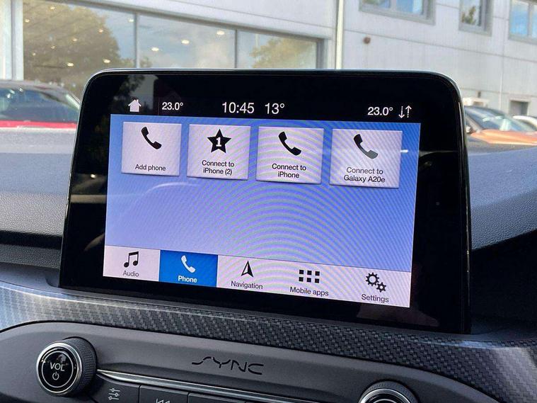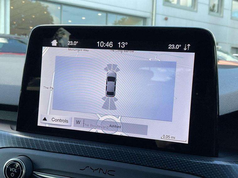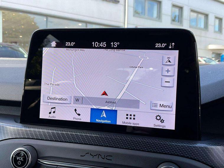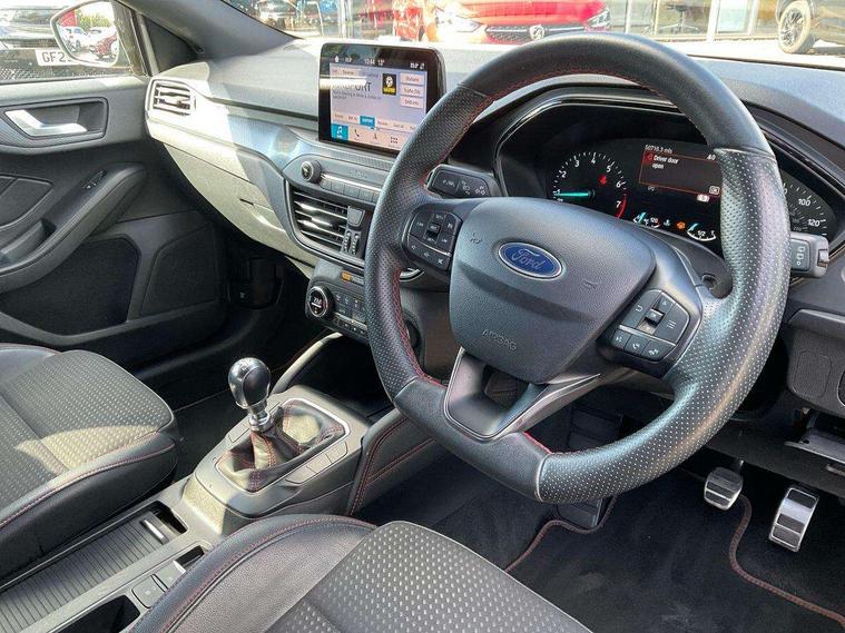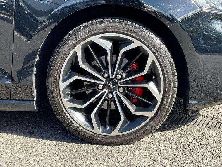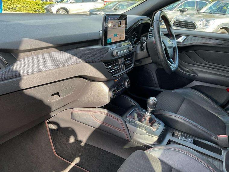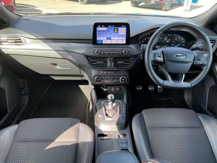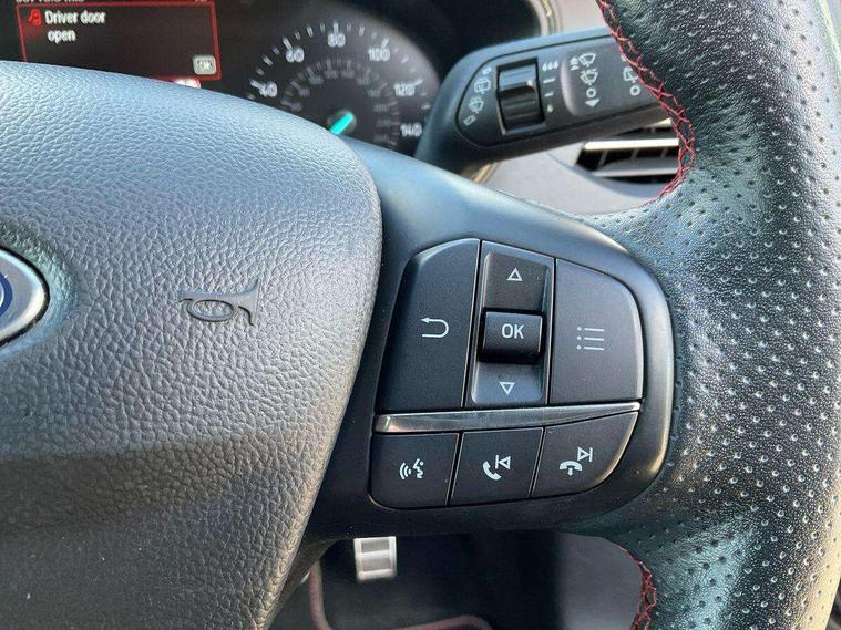 4" TFT coloured cluster screen, Bluetooth system, Digital clock, Easy fuel capless refuelling system, Eco mode, Ford pass connect, Ford SYNC 3 nav system with DAB radio, 8" colour touch screen, voice control, app link, Apple car play/Android auto and 4.2" TFT coloured cluster, Lane keeping aid with lane departure warning, PAS, Selectable drive mode, Trip computer, Sports tuned suspension, 2 USB ports, Aux input, 'Quickclear' heated windscreen/heated washer jets, Auto dimming rear view mirror, Auto headlamps (on/off), Automatic rain sensing wipers, Body colour large rear spoiler, Body colour power folding door mirrors with puddle lights, Body colour side skirt, Body coloured bumpers, Body coloured door handles, Body coloured electrically operated and heated door mirrors with side indicators, Electrically operated front and rear windows with one touch opening and closing, Front variable intermittent wipers with electric wash, Heated rear window, LED daytime running lamp, LED front fog lamps with cornering function, Polished twin tailpipe, Rear privacy glass, ST-Line upper and lower grille with full body styling kit and wing badges, Tailgate wash/wipe, Unique door and instrument panel inserts, 3 spoke flat bottomed leather steering wheel with red stitching, 6 way power adjustable driver seat, 60/40 split back and cushion rear seats with 2 height adjustable headrests, Alloy finish pedals, Aluminium gear knob, Centre console with armrest, Dark headliner, Dual zone electronic air temperature control, Front and rear floor mats with red stitching, Front passenger seat manual height and lumbar adjust, Heated front seats, Height adjustable front headrests, Isofix child seat preparation, Part leather upholstery with red stitching, Reach + rake adjustable steering column, Rear centre headrest, Red stitching on steering wheel, Soft console knee pads with red stitching, ABS+Electronic Brake force Distribution, Auto hold function, Driver airbag, Electronic parking brake, Electronic stability control, Front and rear seatbelt reminder, Front inertia reel height adjustable seatbelts with pre-tensioners, Front passenger airbag, Front side airbags, Hill start assist, Passenger airbag deactivate switch, Post collision braking, Pre collision assist with autonomous emergency braking and pedestrian/cyclist detection, Red brake calipers, Side curtain airbags, Three rear inertia reel lap/diagonal seatbelts, Tyre pressure monitoring system, MyKey system, Remote central locking & engine immobiliser, Thatcham category 1 alarm, Contrast stitching - Red, 18" 5x2 spoke matt black machined finish alloy wheels, Mini steel spare wheel,