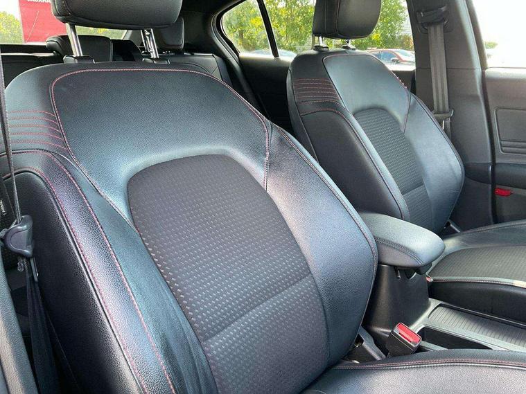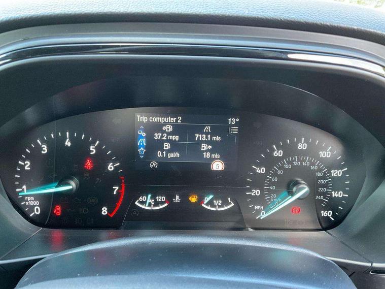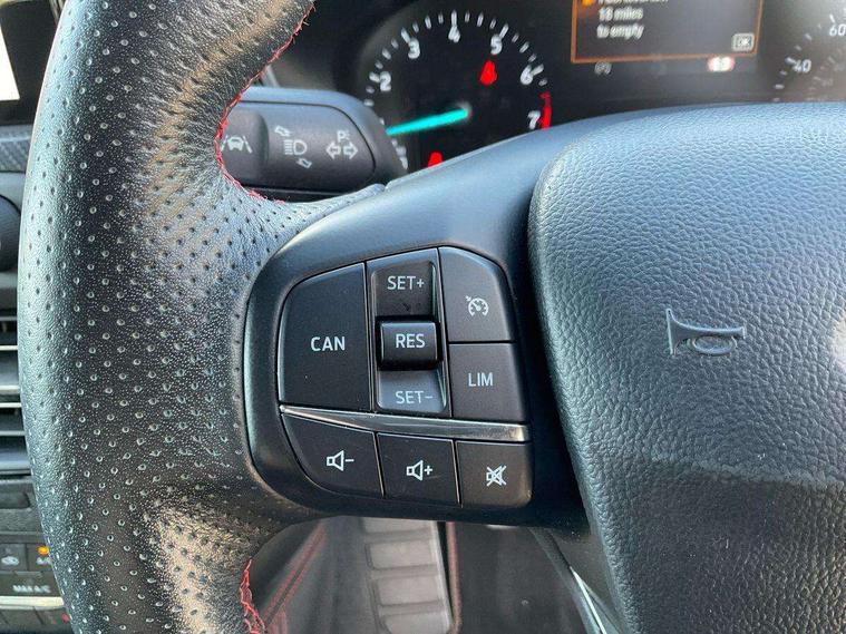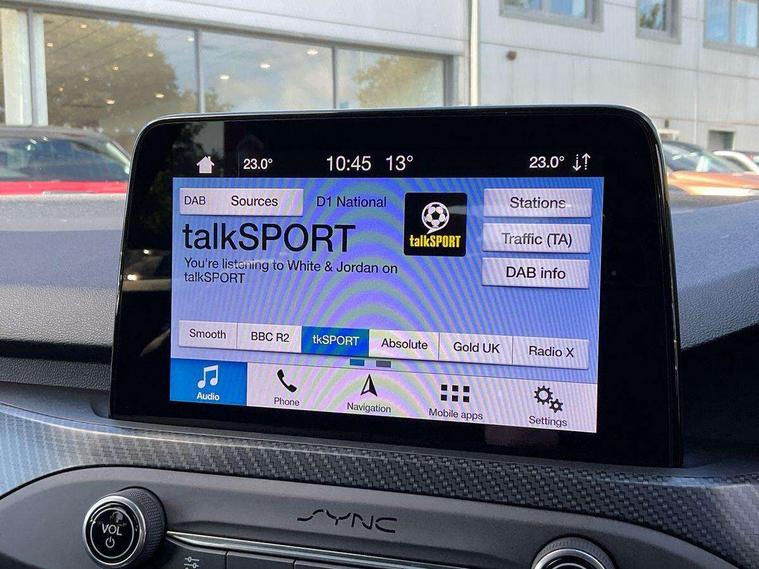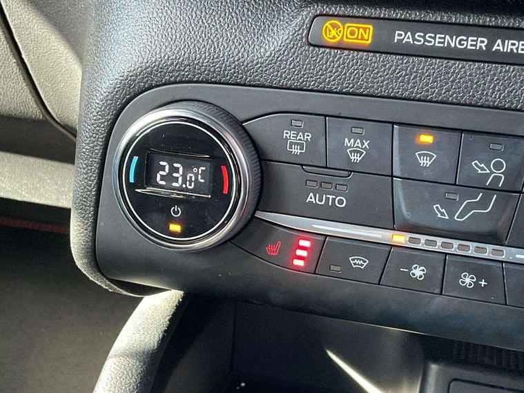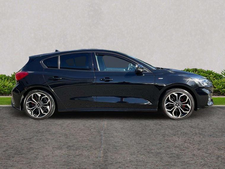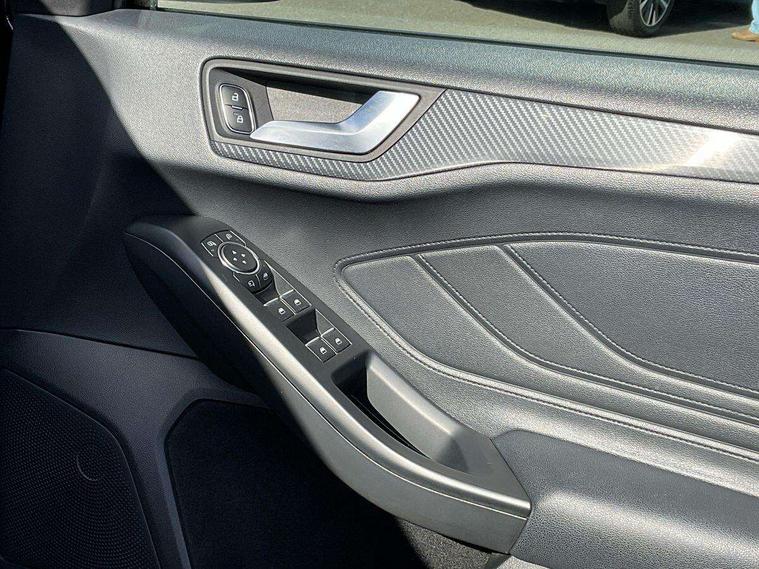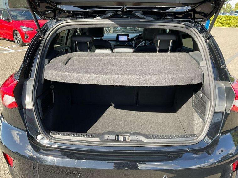 4" TFT coloured cluster screen, Bluetooth system, Digital clock, Easy fuel capless refuelling system, Eco mode, Ford pass connect, Ford SYNC 3 nav system with DAB radio, 8" colour touch screen, voice control, app link, Apple car play/Android auto and 4.2" TFT coloured cluster, Lane keeping aid with lane departure warning, PAS, Selectable drive mode, Trip computer, Sports tuned suspension, 2 USB ports, Aux input, 'Quickclear' heated windscreen/heated washer jets, Auto dimming rear view mirror, Auto headlamps (on/off), Automatic rain sensing wipers, Body colour large rear spoiler, Body colour power folding door mirrors with puddle lights, Body colour side skirt, Body coloured bumpers, Body coloured door handles, Body coloured electrically operated and heated door mirrors with side indicators, Electrically operated front and rear windows with one touch opening and closing, Front variable intermittent wipers with electric wash, Heated rear window, LED daytime running lamp, LED front fog lamps with cornering function, Polished twin tailpipe, Rear privacy glass, ST-Line upper and lower grille with full body styling kit and wing badges, Tailgate wash/wipe, Unique door and instrument panel inserts, 3 spoke flat bottomed leather steering wheel with red stitching, 6 way power adjustable driver seat, 60/40 split back and cushion rear seats with 2 height adjustable headrests, Alloy finish pedals, Aluminium gear knob, Centre console with armrest, Dark headliner, Dual zone electronic air temperature control, Front and rear floor mats with red stitching, Front passenger seat manual height and lumbar adjust, Heated front seats, Height adjustable front headrests, Isofix child seat preparation, Part leather upholstery with red stitching, Reach + rake adjustable steering column, Rear centre headrest, Red stitching on steering wheel, Soft console knee pads with red stitching, ABS+Electronic Brake force Distribution, Auto hold function, Driver airbag, Electronic parking brake, Electronic stability control, Front and rear seatbelt reminder, Front inertia reel height adjustable seatbelts with pre-tensioners, Front passenger airbag, Front side airbags, Hill start assist, Passenger airbag deactivate switch, Post collision braking, Pre collision assist with autonomous emergency braking and pedestrian/cyclist detection, Red brake calipers, Side curtain airbags, Three rear inertia reel lap/diagonal seatbelts, Tyre pressure monitoring system, MyKey system, Remote central locking & engine immobiliser, Thatcham category 1 alarm, Contrast stitching - Red, 18" 5x2 spoke matt black machined finish alloy wheels, Mini steel spare wheel,