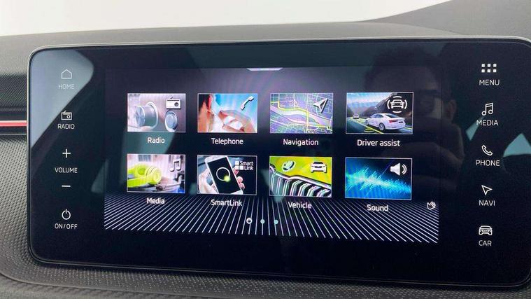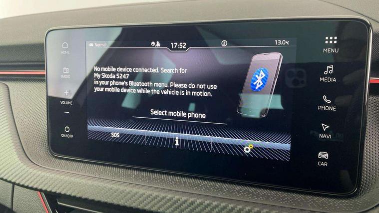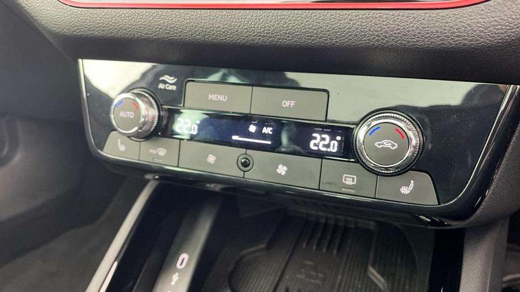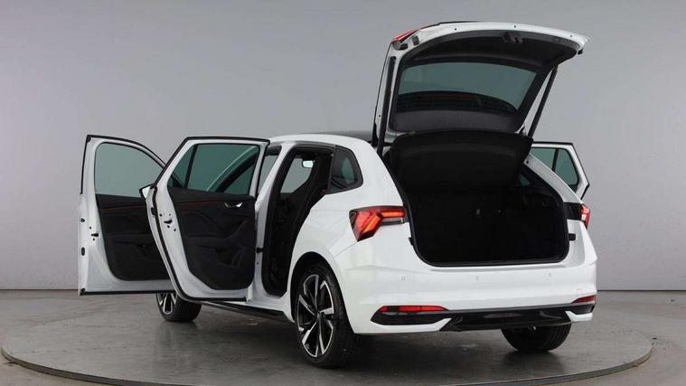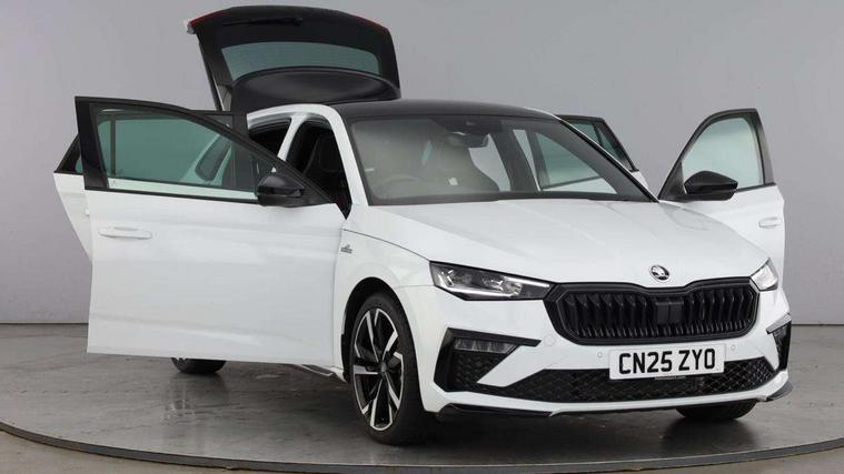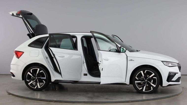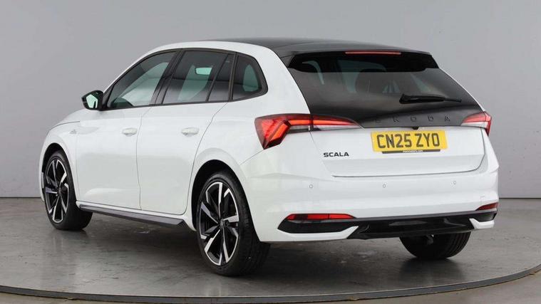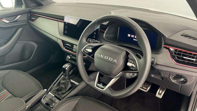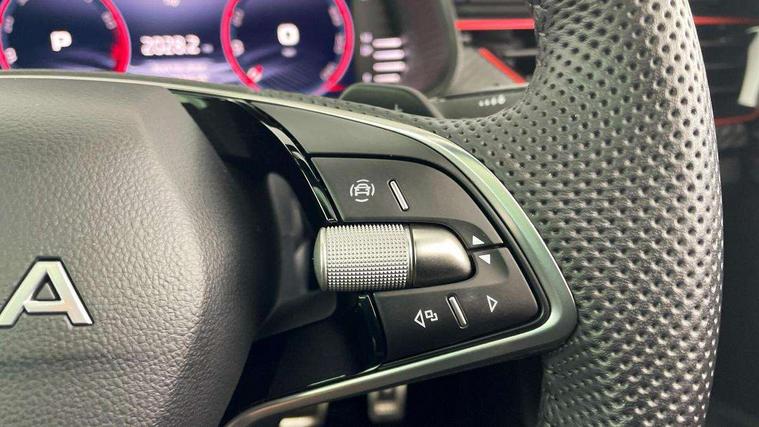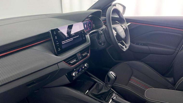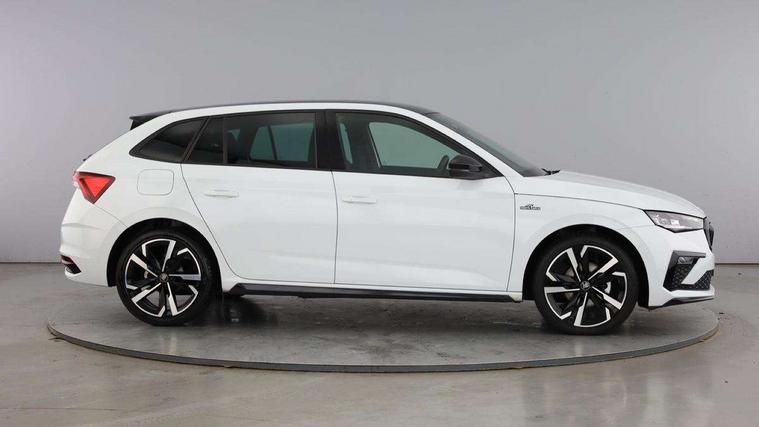 Advanced driver attention and drowsiness monitor, Bluetooth, e-Call (emergency call), Front assist system, PAS, Rear parking sensors, Rear view camera, Speed limiter, Tailgate, Traffic sign recognition, Virtual Cockpit - 10.25" digital display, Voice control system, Wireless smartlink, 4 USB C ports, 8 Speakers, 9.2" Skoda navigation display, DAB radio, Auto dimming rear view mirror, Automatic headlamp activation with Coming home and Leaving home feature, Automatic high/low beam, Automatic intermittent wipers, Black door mirrors, Black lettering on boot lid, Black radiator grille, Black rear diffuser, Black roof spoiler, Body colour bumpers, Body colour door handles, Chrome moulding around grille, Extended tailgate glass, Front and rear electric windows, Heated rear window, LED 3rd brake light, LED brake lights, LED daytime running lights, LED high beam, LED low beam, Light sensors, Monte carlo plaque, Panoramic glass roof, Privacy glass, Rear LED fog light, Rear side wing doors, Rear wiper, Tinted windows, Unique dark chrome design logo on alloy wheels, 12V socket in luggage compartment, 3 seat bench in 2nd row, Aluminium pedals, Ambient lighting in white/red, Black / White armrest stitching, Black ceiling, Black roof headlining, Cargo elements, Chrome inner door handles, Door inserts in art.leather carbon, Driver and passenger sun visors with vanity mirror, Dual zone climate control, Front and rear roof lights, Front centre armrest, Front head restraints, Height adjustable driver seat, Height adjustable passenger seat, Ice scraper, Illuminated glove compartment, Inner circulation control with pollen filter, ISOFIX for front passenger seat, Isofix preparation for back seats, Leather gearknob and handbrake lever, Luggage net under rear parcel shelf, Manual lumbar support for front seats, Monte Carlo cloth upholstery, Net package and top tether hooks in boot space, Pocket on the back of both front seats, incl. mobile phone pockets, Rear centre armrest, Red hotstamping, Single front passenger seat, Skoda lettering on steering wheel, Sport seats, Textile floor mats, Third rear headrest, Ticket holder, Top tether for front passenger seat, Umbrella in driver's door, Light and view plus pack - Scala, 3x3 point rear seatbelts, ABS, Child locks, Curtain airbags and front side airbags, Disc brakes, Driver and front passenger airbags, ESP, Hill hold control, Manual leather parking brake, One tone horn, Passenger airbag switch off function, Seatbelt reminder for driver and front passenger, Tyre pressure monitoring system, Anti theft alarm system with interior monitoring, backup horn and towing protection, Anti-theft wheel bolts, Remote central locking with 2 remote folding keys, SAFE function for remote central locking, Carbon effect decorative inserts, 18" Ursa black diamond cut alloy wheels,