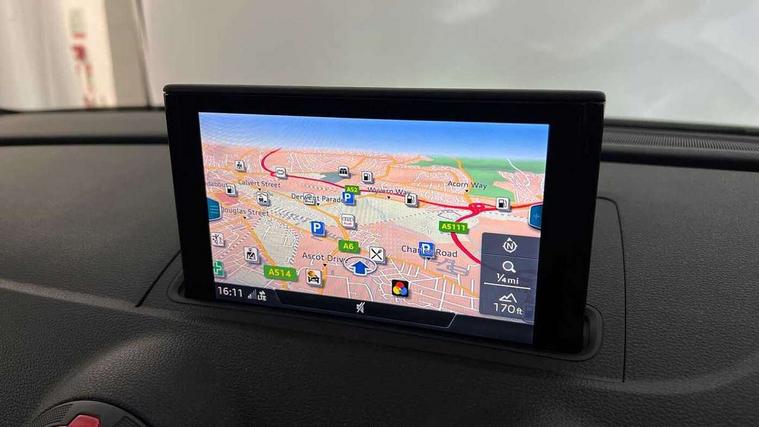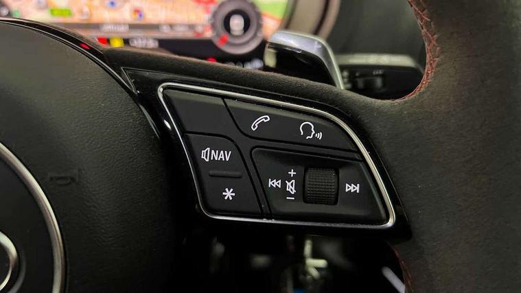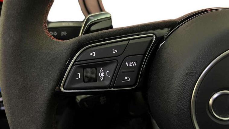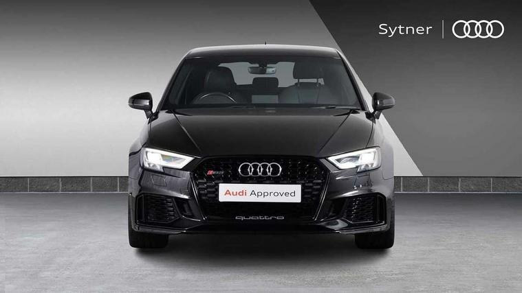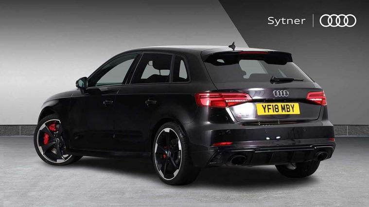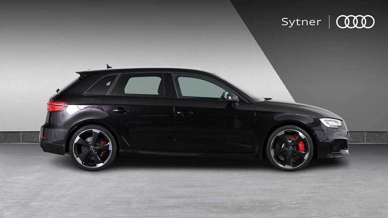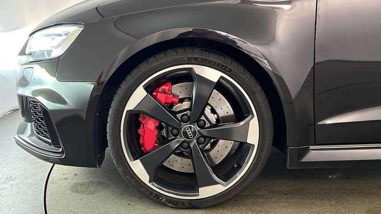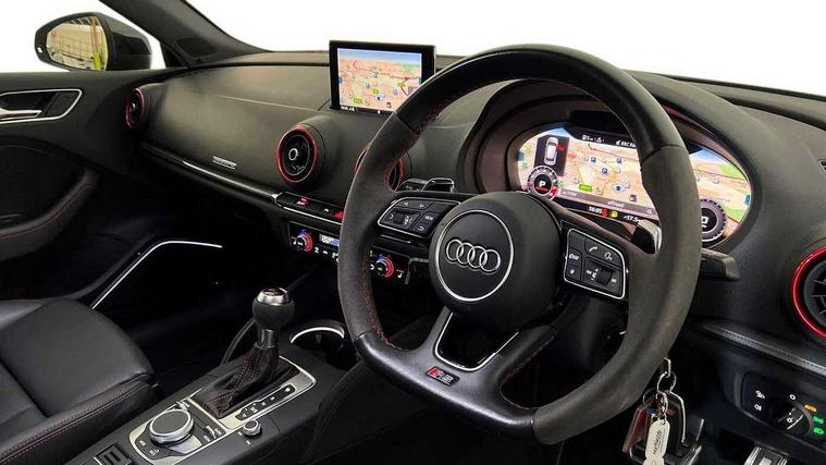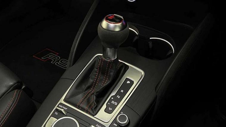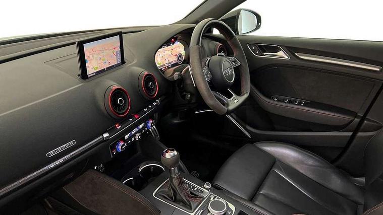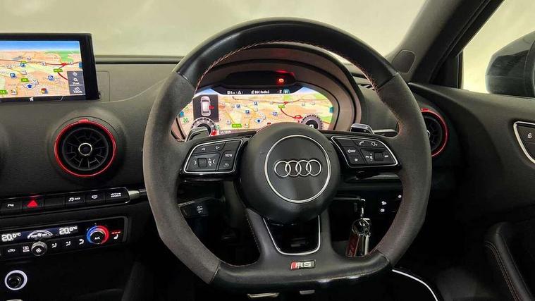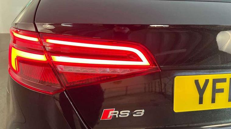 Audi connect, Audi drive select, Audi smartphone interface, Audi virtual cockpit - 12.3" high-resolution LCD display with fully customisable instrument cluster, MMI navigation plus with MMI touch, Mobile telephone preparation - bluetooth interface, Progressive power assisted steering, Service interval indicator, Speed limit display, Voice control system, RS sports suspension, 2 USB ports, Audi music interface, Auxiliary input socket, DAB Digital radio, Audi Beam uses LEDs to project the Audi Sport logo, Auto dimming rear view mirror with light and rain sensors, Black high gloss front air inlet, Body coloured side sills, Electric front windows, Electric operated/heated door mirrors, Electric rear windows, Headlight washers, Heated windscreen washer jets, High gloss black rear diffuser, LED daytime running lights, Rear wiper, RS design body styling, 3 adjustable rear headrests, 3 spoke flat bottomed sports multifunctional leather steering wheel with aluminium look gearshift paddles, 4 lashing points to secure luggage, 60/40 split folding rear seat, Adjustable front armrest, Dual zone electronic climate control, Front and rear interior lights with delay, Heated front seats, Height/depth adjustable steering column, ISOFIX child seat preparation+airbag deactivation, Jack and tool kit, Stainless steel pedals, Storage compartment in centre console, Storage compartment under front seats, Storage compartments in doors, Black Styling pack - RS3, LED interior light pack - A3/RS3, Non smoking pack - RS3, Storage and luggage pack - A3/RS3, 3 point seatbelts on all seats, ABS/EBD, Active bonnet, Active front headrests, ASR, Curtain airbags, Driver and passenger side airbags, Driver/Front Passenger airbags, Drivers knee airbag, EDL, Electromechanical parking brake, ESC - Electronic Stability Control + traction control, Manual rear child locks, Multi-Collision braking, Seatbelt warning, Warning triangle and first aid kit, Anti theft alarm, Anti-theft wheel bolts, Remote control central locking, Thatcham category 1 alarm + immobiliser, Aluminium trim elements, Tyre repair kit,