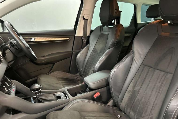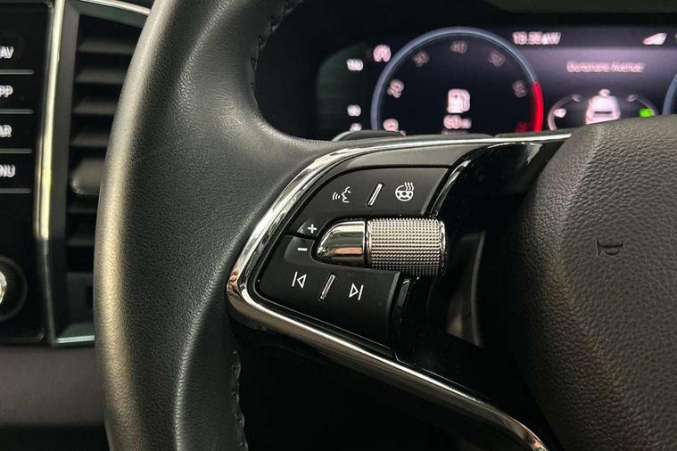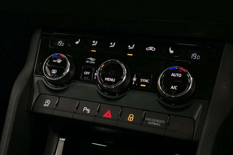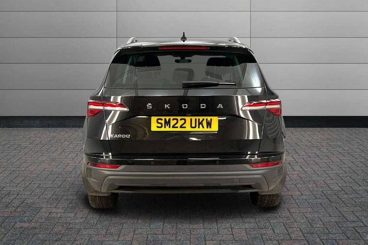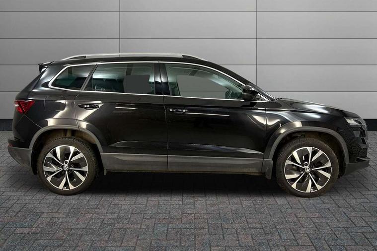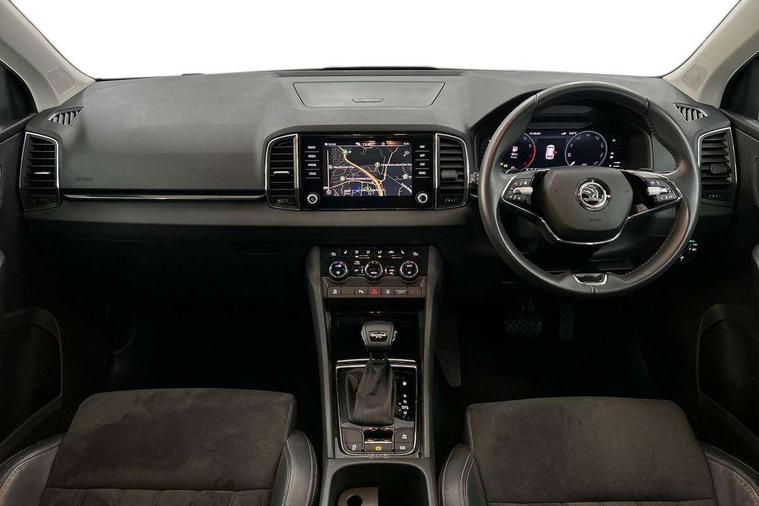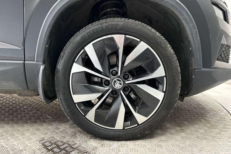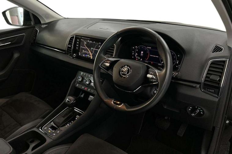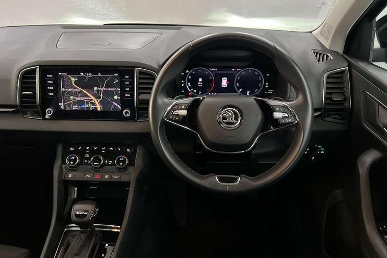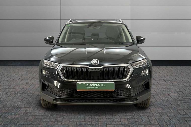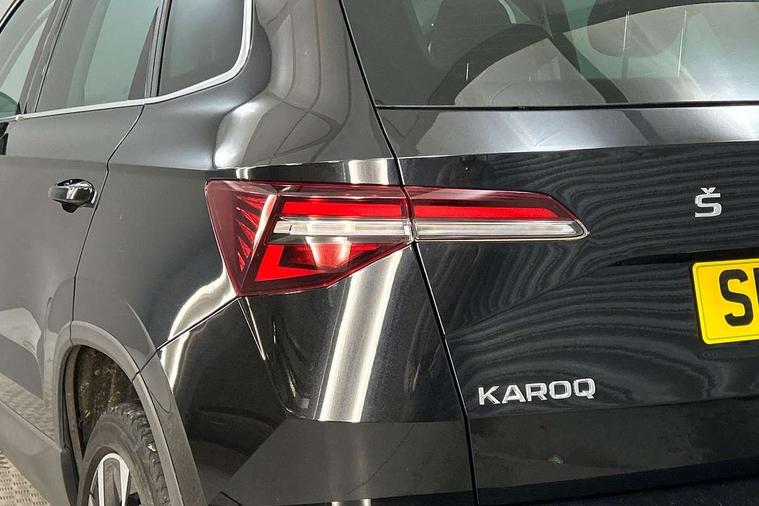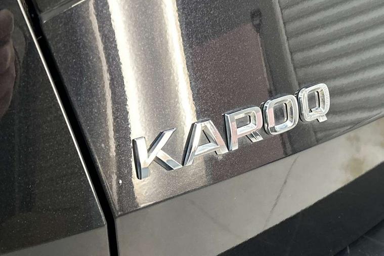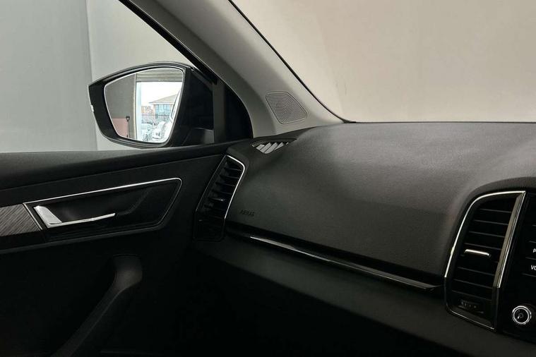 8" Digital display, Care connect, Colour multifunction trip computer, Driver fatigue sensor, Emergency services call system, Outside temperature gauge, Service interval indicator, SmartLink wireless for Apple and wired for Android, Start/stop system with regenerative braking, USB C Port x 2 in front centre console, 8 Speakers, DAB radio with Bluetooth, USB connection, Acoustic glass, Aero front windscreen wipers with intermittent function, Auto dimming rear view mirror with light and rain sensors, Automatic headlight control system, Black electric window control buttons, Body colour door mirrors and handles, Electric front and rear windows with child proof lock, Heated rear windscreen, LED daytime running lights, LED rear lights with high functionality welcome effect and dynamic indicators, Light assistant (coming/leaving home/tunnel light), Plastic scuff plates, Privacy glass, Rear side wing doors, Rear spoiler, Rear window wiper with washer system and intermittent control, Safety reflectors on front doors, 1.5 litre bottle holders in driver and front passenger door panels, 12V socket in boot, 12v socket in front centre armrest with storage compartment and rear air vents, 2 Folding hooks and nets in boot, 2 spoke leather heated multifunction steering wheel with DSG paddles, 2 x Tablet holder, 3 rear height adjustable headrests, 3 seat bench in 2nd row, 4 foldable roof handles with rear coat hooks, Black floor carpet, Chrome inner door handles, Decorative door sills with KAROQ badging, Double sided boot floor, Foldable hooks in the boot, Front head restraints, Height adjustable front three point seats belts with tensioners, Height/reach adjust steering wheel, Ice scraper, Illuminated glovebox, Illuminated luggage compartment, Isofix child seat preparation for front passenger seat, Isofix child seat preparation outer rear, Manual lumbar support for front seats, Pen holder, Pollen filter, Rear boot cover, Rear reading lights, Rubbish bin door, Safety vest holder, Single front passenger seat, Storage box in upper central dashboard closed, Sunvisors with illuminated vanity mirrors, Textile floor mats, Ticket holder, VarioFlex seats with standard rear seat release, Chrome roof rails + chrome pack - Karoq, Parking pack - Karoq, Automatic door unlocking in case of crash, Automatic fuel cut off in case of crash, Child locks on rear doors, Driver airbag, Electronic parking brake with auto hold function, Emergency rear braking signal, ESC including ABS, MSR, ASR, EDS, HBA, DSR, RBS, MKB and traction control, Front side airbags, Hill hold control, Knee airbags, Passenger airbag with switch-off function, Pedestrian monitor, Seatbelt reminder signalisation and pretensioner for all seats, Three point seatbelts rear, Two tone horn, Tyre pressure display, Tyre pressure monitor, Alarm with interior monitoring, back up horn and tilt sensor with safe function, Electronic engine immobiliser, Keyless entry and start/stop, Remote central locking with 2 remote folding keys, Chrome framed air vents, Anti-theft wheel bolts protection, Storage on wheel cover, Tool kit,