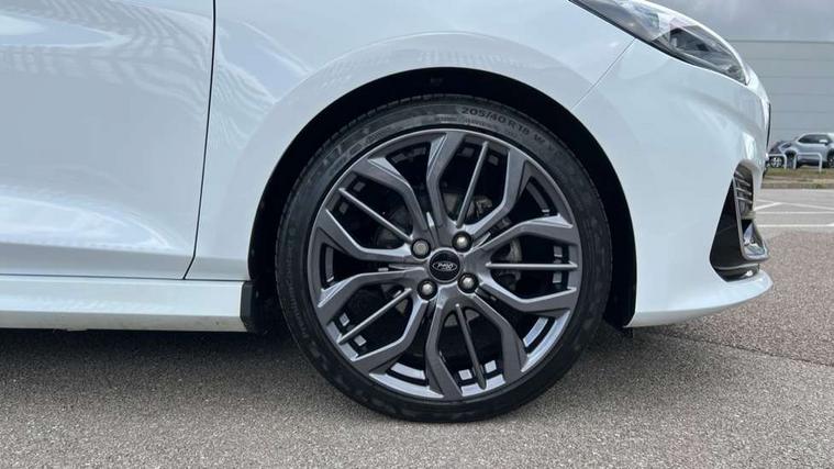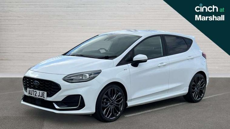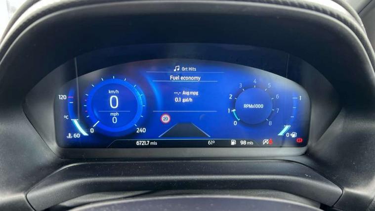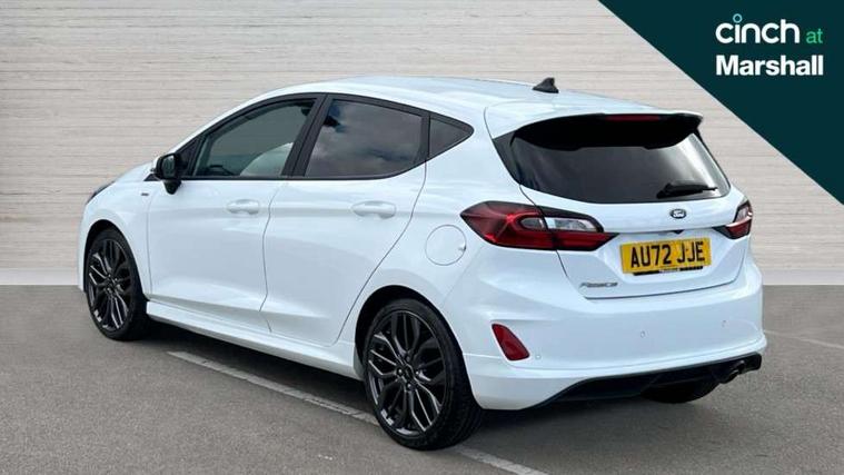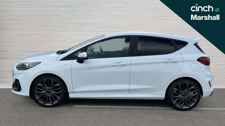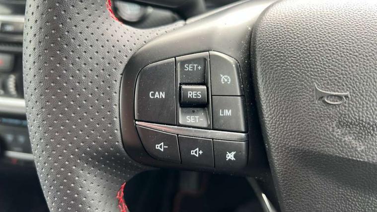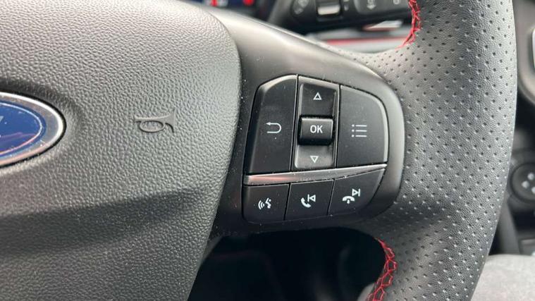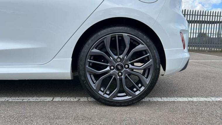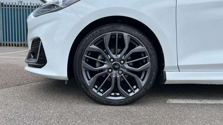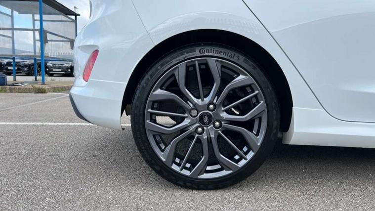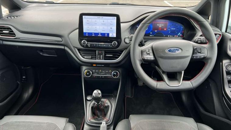 12.3" Full digital cluster, Driver alert system, Electric power steering, Ford easy fuel, Ford SYNC 3 Nav with DAB radio, 8" touch screen, voice control, emergency assist, Apple CarPlay/Android auto, 2x USB, 6 speaker, Ford pass connect, Rear parking distance sensors, Rear view camera, Selectable drive modes (Normal, Sport, Track), Speed sign recognition, Trip computer, Wrong way alert, Sports suspension, Auto high beam, Body colour bumpers, Body colour large rear spoiler, Body coloured electrically operated with side indicators, Electric front windows/one touch facility, Front unique ST scuff plates, LED Night signature to rear lights, LED third brake light, Quickclear heated windscreen, Rain sensing wipers and auto dimming rear view mirror, Rear privacy glass, Rear side wing doors, Rear wiper, Unique ST-Line upper grille & full bodystyling kit with ST-Line wing badges, 3 seat bench in 2nd row, 4 way manually adjustable passenger seat, Adjustable head restraints, Black headlining, Centre console with opening armrest, 2x cupholders, 12v and USB, Drivers and Passenger lumbar support, EATC - Electronic Auto Temperature control, Front floor mats in velour, Leather gaiter, LED ambient lighting, Manual 4-way driver seat adjust, Sensico partial premium leather upholstery with red stitching, Sensico wrapped steering wheel, Single front passenger seat, NCAP Pack - Fiesta, Winter pack [GTBAB]- Fiesta, 3 point seatbelts on all rear seats, Electronic stability control with hill start assist, Manual child lock in rear doors, Tyre pressure monitoring system, Ford keyfree system with Keyless entry and keyless start, MyKey system, Remote central locking, Thatcham alarm with power door dead locks, 18" 5x2 spoke alloys with pearl grey machined finish,