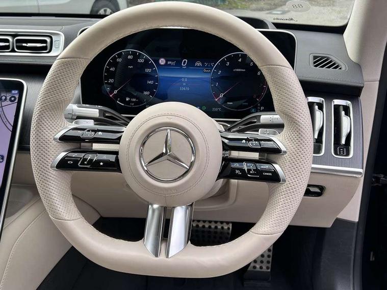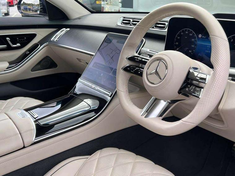 12.3" 3D driver display, 12.8" OLED central display, Attention assist, Bluetooth connection, Crosswind Assist, Direct steering, DYNAMIC SELECT with a choice of driving modes, ECO start/stop function, Extended MBUX functions, Fingerprint scanner, Hands-free access for boot lid, Hard-disc navigation, Intelligent parking pilot, MBUX augmented reality for navigation, MBUX augmented reality head-up display, MBUX interior assist - front and rear, MBUX navigation premium, MBUX rear tablet, Mercedes-Benz emergency call, Power closing doors and boot lid, Pre-installation for car sharing, Preinstallation for Navigation Services, Rear belt status indication in the instrument display, Remote boot lid release and closing, Service indicator (ASSYST), Wireless charging system for mobile devices in the front, Wireless charging system for mobile devices in the rear, Wireless smartphone integration, 76 litre fuel tank, 9G TRONIC 9 speed automatic transmission, Airmatic air suspension, EQ Boost starter-alternator (48V mild hybrid technology), Petrol Particulate Filter, Burmester 3D surround sound system, DAB Digital radio, Front 2x USB type-C ports, Rear 2x USB type-C ports, Sound personalisation, 3rd brake light, Adaptive brake lights, AMG body styling with chrome elements, AMG front apron in A-wing design with large air intakes and fins in chrome plus front splitter in chrome, AMG rear apron with diffuser and trim element in chrome, Automatically dimming rear view mirror, Digital light - LED headlight, adaptive highbeam, cornering and active light, enhanced fog light, city, country road mode, weather and LED rear lamp, Electrically adjustable, heated and automatic dimming driver side exterior mirrors with kerb/parking function, Front and rear electric windows, Heat insulating, dark tinted noise insulating and infrared reflecting laminated glass, Heated windscreen, Illuminated door sill panels with Mercedes-Benz lettering, LED daytime running lights, Magic vision control, Panoramic sliding sunroof, Privacy glass, Radiator grille with chrome surround and three horizontal cross struts in chrome with inserts in high-gloss black, Rear boot, Rear side wing doors, Shoulderline trim strip in chrome, Side sill panels with chrome insert, Visible tailpipe trim elements in chrome, 12V socket in boot, 12V socket in rear centre console plus in the front passenger footwell, 3 seat bench in 2nd row, 3 twin spoke flattened bottom multifunction sports steering wheel in nappa leather with silver chrome shift paddles, 4 way lumbar support for driver and front passenger, Adaptive rear compartment lighting, Ambient lighting with projection of brand logo, AMG floor mats, AMG pedals in brushed stainless steel with rubber studs, Automatic child seat recognition sensor, Belt feeders in the rear, Centre console in black crystal look finish, Climatised front seats, Climatised rear seats, Double sun visors with pivoting section to cover the side window, EASY ADJUST luxury head restraints with additional cushion for driver and front passenger, foldable and removable on front passenger side, Easy entry system for driver, Electric rear window sunblinds, Electric sunblinds in rear doors, left and right, Electrically adjustable rear seats including memory function, Energizing Air Control - Air quality and fine particle sensor, Fabric roof liner, Front centre armrest, Front passenger side seat electrically adjustable from the rear, Nappa leather upholstery, Rear centre armrest with double cup holder and trim element, Rear head restraints, Single front passenger seat, Steering column gear selector, Steering wheel gearshift paddles, Steering wheel heating, Thermotronic automatic 4 zone climate control, Through loading system, Two bag hooks, Chauffeur pack - S Class, Driving assistance package - S Class, Memory pack - S Class, Parking package with 360 degree camera - S Class, USB pack plus - S Class, Warmth comfort package - S Class, Anti lock braking system (ABS) with brake assist, Beltbags in rear, Brake pad wear indicator front brakes, Centre airbag, Child locks on rear doors, Driver/Front Passenger airbags, Electric parking brake, Electronic stability programme with acceleration skid control, First aid kit, Forward facing rear airbags, Front and rear illuminated designer belt buckles, Front large compound brake discs 390x36mm internally ventilated and perforated, Front side airbags, Grey painted brake callipers with Mercedes-Benz lettering at the front, grey logo badge at the rear, i-Size and ISOFIX Child Restraint system, Pedestrian protection, Pre-safe system including pre-safe sound, Rear larger compound brake discs 360x26mm internally ventilated and perforated, Rear side airbags, Three 3 point rear seatbelts, Tyre pressure loss warning system, Window airbags, Dashcam, Increased anti-theft protection, KEYLESS-GO starting function with seamless door handles, Locking wheel nuts, Urban guard vehicle protection plus, Anthracite open-pore poplar wood, 21" AMG multispoke alloy wheels in himalaya grey with high-sheen finish, Noise reduced tyre with foam absorber, Summer tyres, Tyrefit tyre sealant kit,