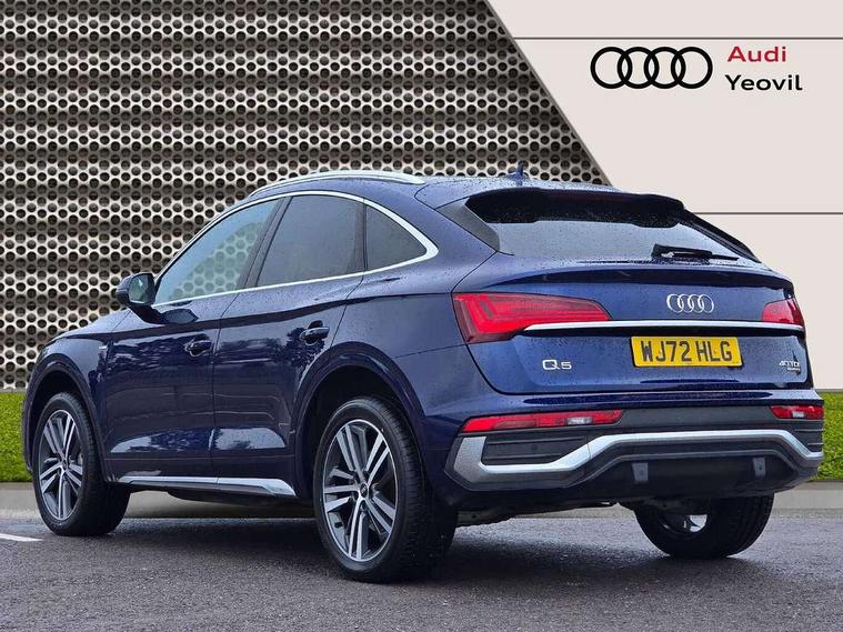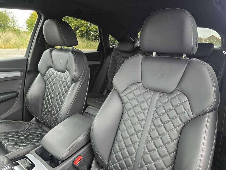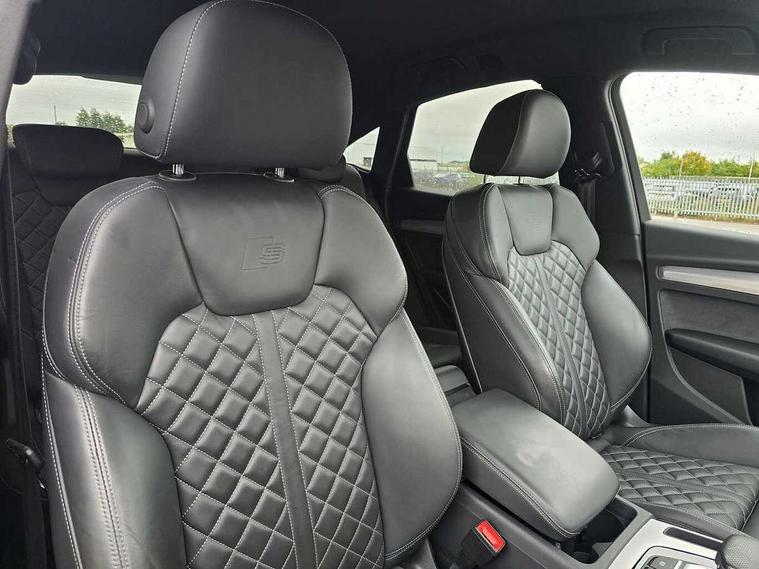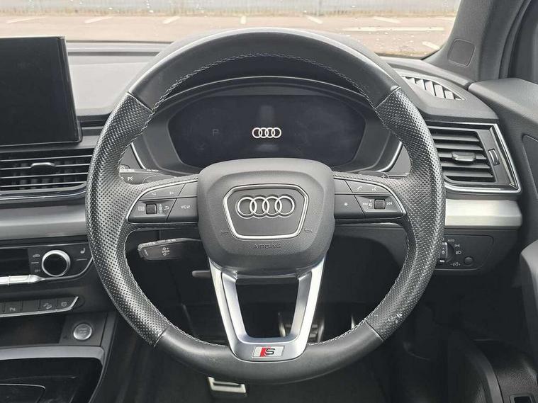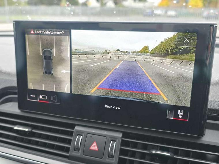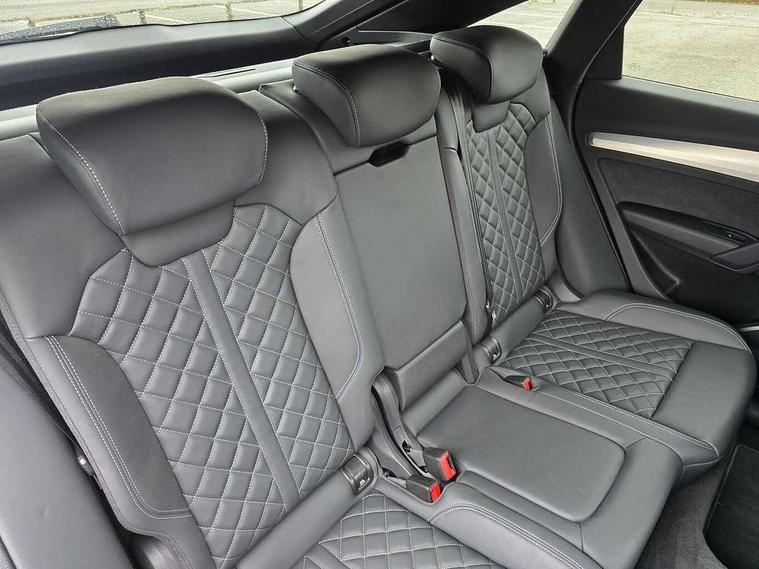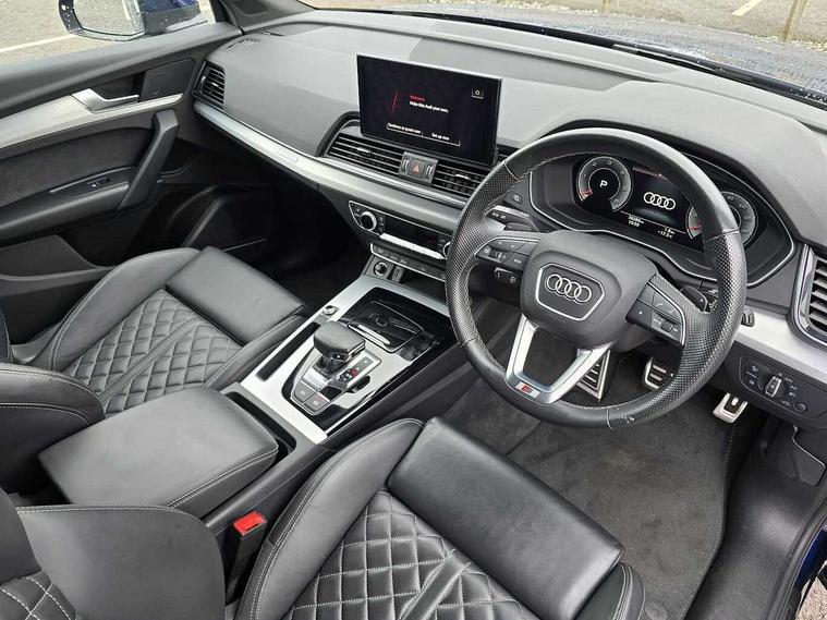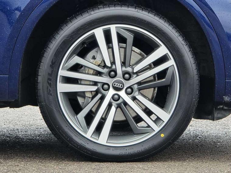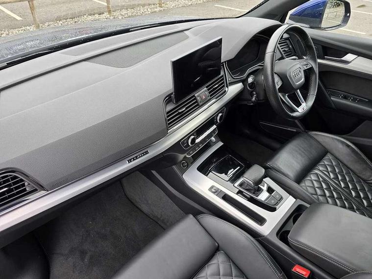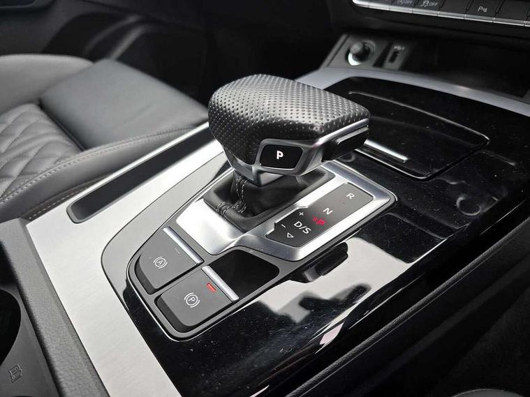 Audi connect safety and service (e-call), Audi connect with Amazon Alexa Integration, Audi drive select, Audi virtual cockpit plus with 12.3" screen and three different layout designs, Audi wireless smartphone interface, Automatic start-stop system with coasting functionality and efficiency programme, Bluetooth interface, Electro - mechanical power assisted steering, MMI navigation plus with 10.1" touch screen, Power tailgate, Reversing camera, Service interval indicator, Voice control system with Audi hotword activation "Hey Audi", Diesel particulate filter, Quattro on demand, S line sports suspension, 2 x USB charging port with aux input socket, DAB Digital radio, Acoustic windscreen, Aluminium roof rails, Audi matrix LED headlights with dynamic front and rear indicators, Auto dimming door mirrors, Auto dimming rear view mirror, Automatic headlights and windscreen wipers, Body colour door mirrors, Body colour rear diffuser with matt aluminium silver surrounds, Body colour underbody protection, Chrome plated exhaust trims, Daytime running lights, Door sills in Selenite silver, Electric adjustable/heated/folding door mirrors, Front air inlet surrounds in aluminium, Front and rear electric windows, Front radiator grille in honeycomb design, Headlight washers, High level LED brake light, Lower bumpers painted in contrast Manhattan grey, Rear chrome trim strip below lights, Rear privacy glass and rear side windows, Rear side wing doors, Rear wiper, Roof bars, S Line badges on the front wings, S Line front and rear bumpers, S Line rear spoiler, S Line side skirts, 3 rear headrests, 40:20:40 split folding 3 rear bench seat in 2nd row with rear centre armrest, Black cloth headlining, Comfort front centre armrest, Contrast stitching on seats, steering wheel and gear lever gaiter, Deluxe 3 zone electronic climate control, Front head restraints, Front/rear floor mats, Gear lever in black leather, Heated front seats, Height/reach adjustable steering column, Illuminated door sill trims with S logo, ISOFIX child seat mounting and top tether, Manual seat adjustment with 4-way electric lumbar support, Removable luggage compartment floor, Single front passenger seat, Stainless steel pedals, Sunvisors with vanity mirrors, Trunk roller cover, High gloss pack - Q5, LED interior light pack - Q5, 3 point seatbelts on all seats, 6 airbags - Driver, front passenger, curtain and side airbags, Electrically operated child locks on rear doors, Electromechanical parking brake, Electronic stabilisation control including ABS, ASR and EDL, Front passenger airbag deactivation, Hill descent control, Hill hold assist, Multi collision brake assist, Pop-up bonnet for pedestrian protection, Pre sense city, Seat belt force limiter, Seatbelt monitoring, Tyre pressure warning, Warning triangle and first aid kit, Anti theft alarm, Anti-theft wheel bolts, Keyless Go access/ignition system, Remote central locking, Matt brushed aluminium inlays,