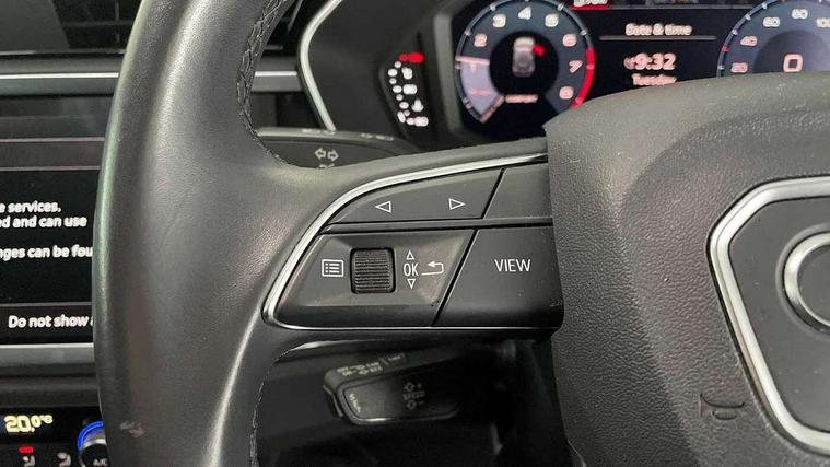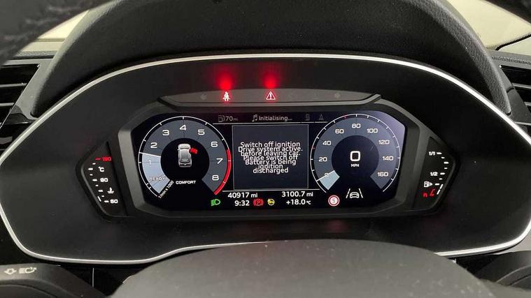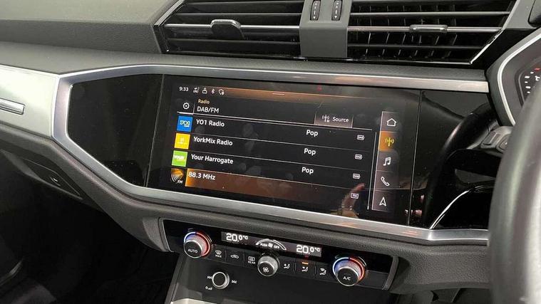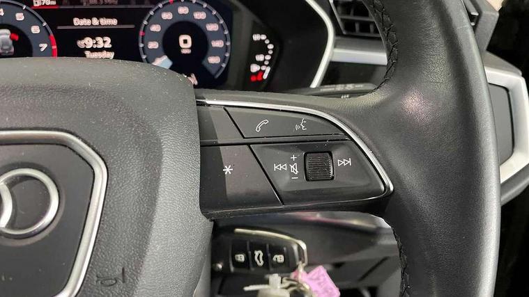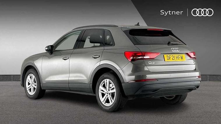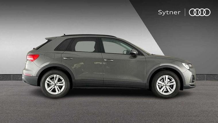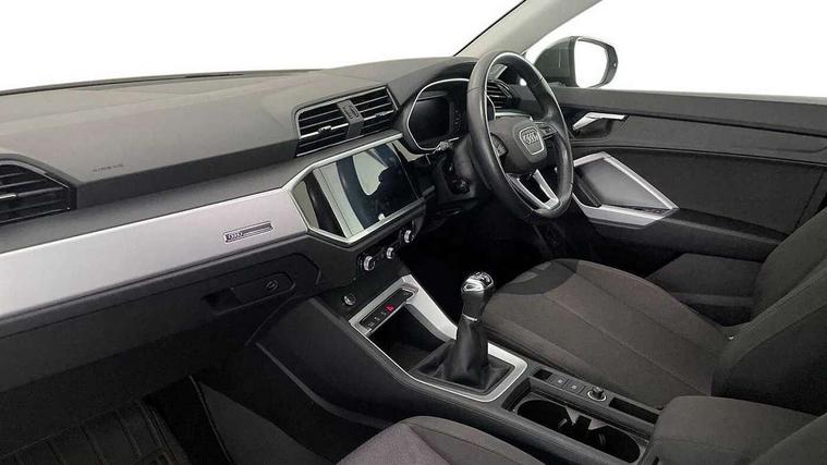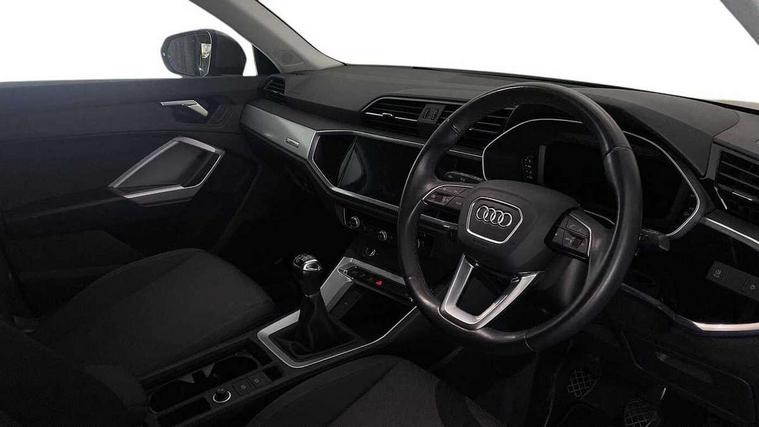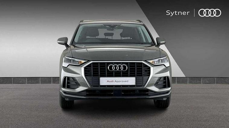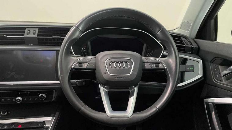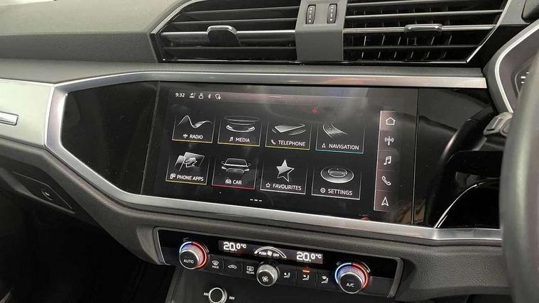 Amazon alexa Integration, Audi connect safety and service (e-call), Audi drive select, Audi lane departure warning, Audi smartphone interface includes wireless Apple carplay/Android Auto, Audi Virtual Cockpit - 10.25" display, Bluetooth interface, Camera based traffic sign recognition, Cruise control + speed limiter, MMI Navigation Plus with high resolution 10.1 inch touchscreen colour display, Power operated tailgate, Progressive steering, Rear parking sensors, Service interval indicator, Start stop system with recuperation, Voice control system with natural language interaction, Standard suspension, 2 USB-C ports with charge and data functions, 6 passive loudspeakers, DAB digital radio module, Acoustic windscreen, Auto dimming frameless rear view mirror, Black roof rails, Body colour door mirrors, Diffuser in grained anthracite, Electrically folding, adjustable and heated door mirrors with integrated LED side indicators and kerb view function for passenger side, Exterior bumper with wheel arch trims and side sill trims in grained black matt, Front and rear electric windows, Grained radiator protective grille, Halogen rear lights, LED headlights with LED daytime running lights, Rain and light sensors, 12V socket in rear centre console, 3 spoke multi-function leather steering wheel, 40:20:40 folding with manual adjustment for 60:40 forwards/backwards position and backrest angle, Dual zone electronic climate control, Front and rear floor mats, Front and rear headrests, Front and rear roof module including reading lights, Front centre armrest, Glove compartment lighting, Height and reach adjustable steering wheel, ISOFIX child seat mounting for front passenger with airbag deactivation and outer rear seat including top tether attachment point for outer rear seats, Luggage compartment light, Lunar silver cloth headlining, Manual front seats with height adjustment, Stainless steel luggage compartment sill finisher, Non smoking pack - Q3, 3x3 point rear seatbelts, 6 airbags - Driver, front passenger, curtain and side windows, Audi pre-sense front with pedestrain and cyclist recognition, Electrically operated child locks on rear doors, Electromechanical parking brake, Electronic stabilisation control including ABS, ASR and EDL, Hill descent control, Hill hold assist, Pre sense basic, Seatbelt monitoring, Tyre pressure warning, Warning triangle and first aid kit, Anti theft alarm, Anti theft wheel bolts, Remote central locking, Detail dashboard around MMI touch colour display in glass look, black with surround in aluminium look, Micrometallic silver inlay, 17" 5 twin spoke design alloy wheels,