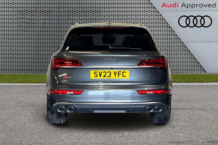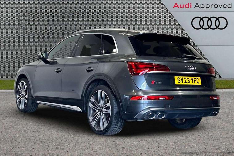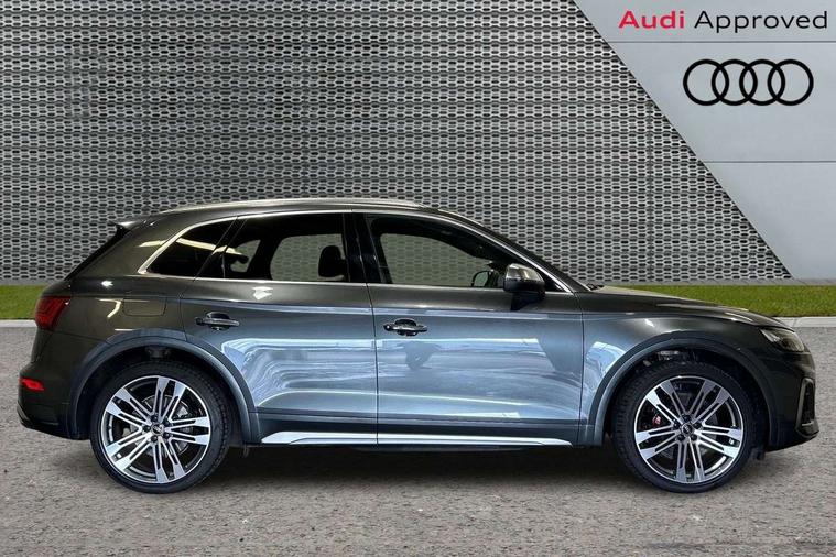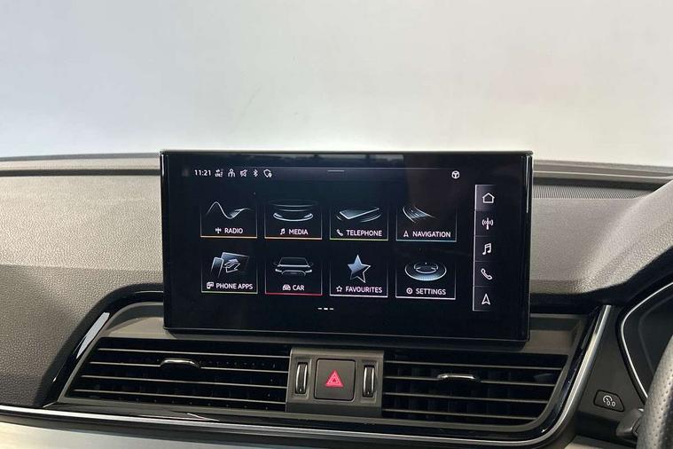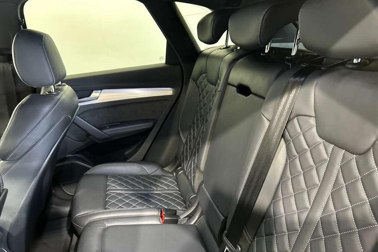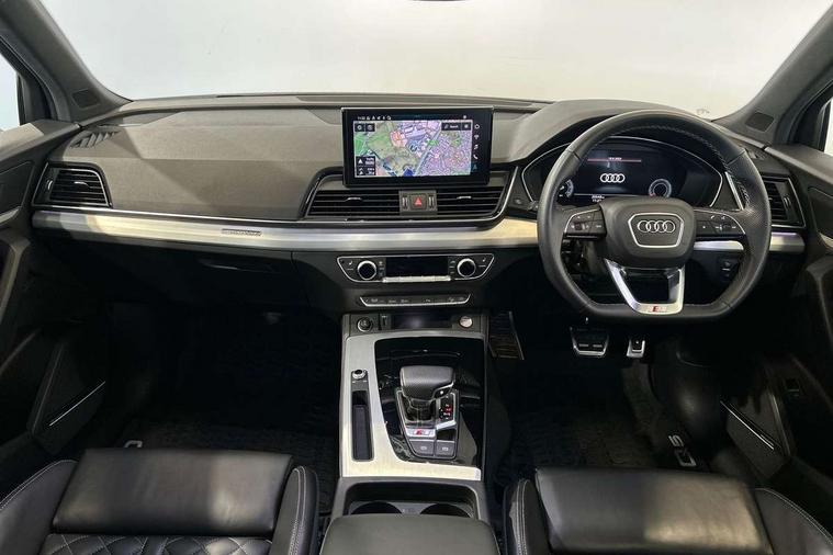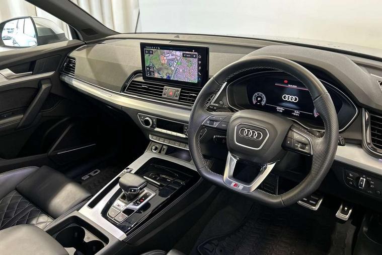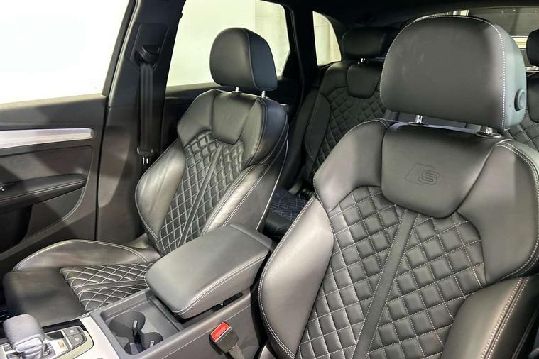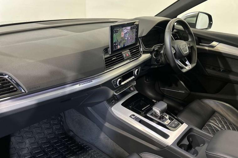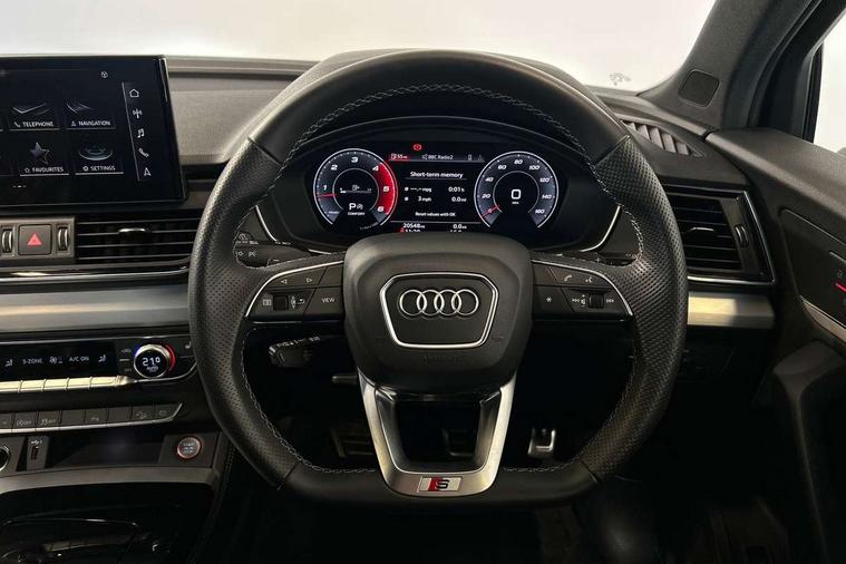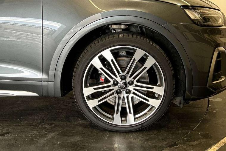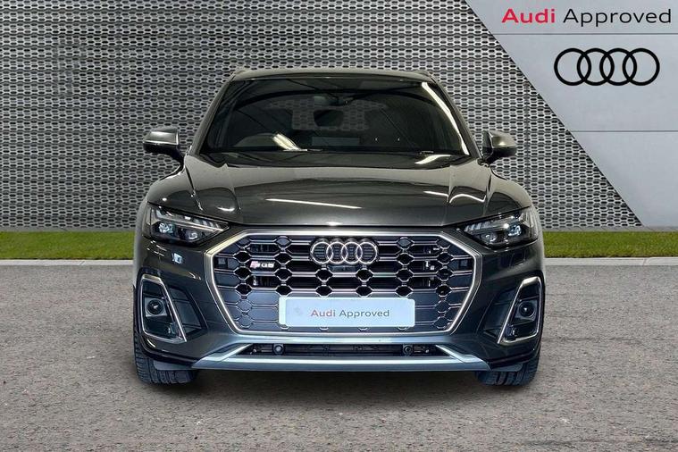 Acoustic front and rear parking sensor, Audi connect safety and service (e-call), Audi connect with Amazon Alexa Integration, Audi drive select, Audi virtual cockpit plus with 12.3" screen and three different layout designs, Audi wireless smartphone interface, Automatic start-stop system with coasting functionality and efficiency programme, Bluetooth interface, Electro - mechanical power assisted steering, MMI navigation plus with 10.1" touch screen, Power tailgate, Reversing camera, Service interval indicator, Voice control system with Audi hotword activation "Hey Audi", 70 litre fuel tank and 24 litre AdBlue tank, Diesel particulate filter, Quattro on demand, S sport suspension with damper control, 2 x USB charging port with aux input socket, Audi sound system, DAB Digital radio, Acoustic windscreen, Aluminium roof rails, Audi beam, Audi beam with Audi rings logo, Audi matrix LED headlights with dynamic front and rear indicators, Auto dimming door mirrors, Auto dimming frameless rear view mirror, Automatic headlight adjustment, Automatic headlights and windscreen wipers, Body colour bumpers, Body colour rear diffuser with matt aluminium silver surrounds, Body colour underbody protection, Chrome plated exhaust trims, Daytime running lights, Door sills in Selenite silver, Electric adjustable/heated/folding door mirrors, Front air inlet surrounds in aluminium, Front and rear electric windows, Front radiator grille in honeycomb design, Headlight washers, High gloss black B pillar trims and triangular rear door trim, High level LED brake light, Rear chrome trim strip below lights, Rear privacy glass and rear side windows, Rear side wing doors, Rear wiper, Roof bars, S front and rear bumpers, S Line rear spoiler, S Line side skirts, S specific rear diffuser, 3 rear headrests, 4 way electric lumbar support for driver and front passenger, 40:20:40 split folding 3 rear bench seat in 2nd row with rear centre armrest, Black cloth headlining, Comfort front centre armrest, Contrast stitching on seats, steering wheel and gear lever gaiter, Deluxe 3 zone electronic climate control, Fine Nappa leather upholstery with diamond pattern contrast stitching + front sport seats with S embossed logo, Front/rear floor mats, Fully electrically adjustable seats, Gear lever in black leather, Heated front seats, Height adjustable front head restraints, Height/reach adjustable steering column, Illuminated door sill trims with S logo, Luggage compartment cover, Massage function for front seats, Rear seat bench plus-adjust for forwards/backwards position/backrest angle, cupholders in the armrest, load through hatch and remote backrest release, Removable luggage compartment floor, Single front passenger seat, Stainless steel pedals, Sunvisors with vanity mirrors, Extended interior upholstery pack - Q5, High gloss pack - Q5, LED interior light pack - Q5, 3 point seatbelts on all seats, 6 airbags - Driver, front passenger, curtain and side airbags, Electrically operated child locks on rear doors, Electromechanical parking brake, Electronic stabilisation control including ABS, ASR and EDL, First aid kit with warning triangle and vests, Front passenger airbag deactivation, Hill descent control, Hill hold assist, ISOFIX child seat mounting for front passenger seat and ISOFIX child seat mounting with Top Tether for outer rear seats, Multi collision brake assist, Pop-up bonnet for pedestrian protection, Pre sense city, Seat belt force limiter, Seatbelt monitoring, Tyre pressure warning, Anti theft alarm, Anti-theft wheel bolts, Keyless Go access/ignition system, Remote central locking, Air vents inserts and centre console in gloss black, 20'' 5 twin star spoke design alloy wheels in gloss graphite grey,