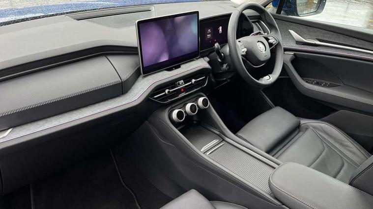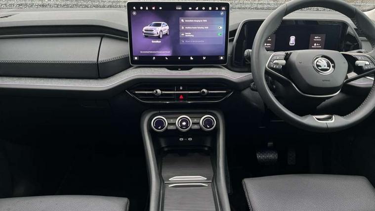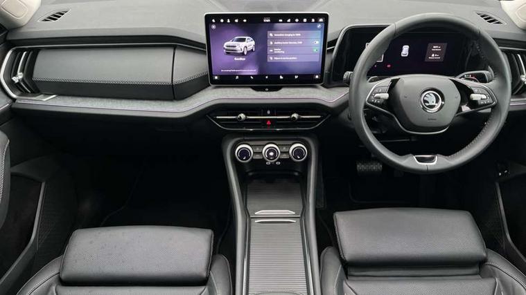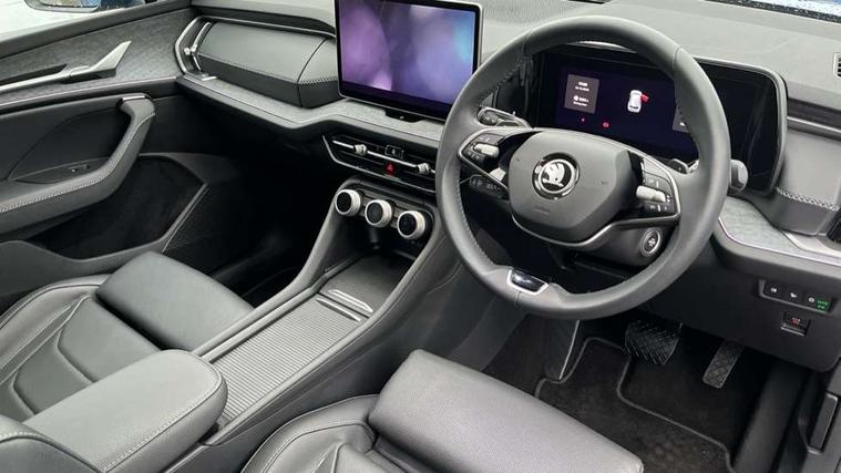 13" satellite navigation touchscreen display, Blind spot detection with door exit warning, Bluetooth system, ChatGPT functionality, Drive mode selector, Driver alert with fatigue sensor, Driver drowsiness alert system, Dry display cleaner, e call+, Front cross traffic assist, Lane assist, PAS, Rear traffic assist, Tailgate unlocking from outside, Traffic sign recognition, USB C Port x 2 in front centre console, Virtual Cockpit - 10.25" digital display, Voice control system, Wireless charging for two smartphones (15W) with cooling function, Wireless SmartLink for Apple CarPlay and Android Auto, 32A charging cable, Stop/start function, 2x USB-C in the rear, DAB Digital radio, Aero front windscreen wipers with intermittent function, Auto dimming rear view mirror, AWL (all weather lighting) and all weather light with cornering function, Black wheel arch surrounds, Body colour bumpers, Body colour door mirrors and handles, Cornering light and poor weather light, Electric folding /adjustable/separted heated/folding door mirrors, auto dimming with boarding sports and memory function, Electric front and rear windows, Exterior black decorative trims, Heat insulating glass in windshield, Heated rear window, Ice scraper in fuel tank cap, Invisible tailpipe, LED daytime running lights, LED rear fog light, LED third brake light in rear spoiler, Light assistant with automatic headlight control and coming home feature, Logo projection in door mirrors, Privacy glass, Rear side wing doors, Rear spoiler, Rear window wiper, Red decorative strip between rear LED lights, Safety reflectors on front and rear doors, Window control switches with black trim, Windscreen wipers with rain sensor, Without engine designation, 1.5l bottle holder points in all door, 12V socket in boot, 1x centre rear reading light, 3 configurable smart dials with 32mm coloured display, 3 seat bench in 2nd row, 4 foldable roof handles with rear coat hooks, Ambient interior lighting - Dashboard, front-door stowage compartments, front and rear door panels and footwell lighting, Automatic gear selector on steering wheel, Chrome interior door handles, Driver/front passenger reading lights, Fabric headlining, Fixed bench 40:60:40 split folding backrests, Front and rear floor mats, Front centre armrest with jumbo box storage compartment, cup holder and 12V socket, Front courtesy lights, Height adjustable front headrests, Isofix child seat fittings in outer rear seats and front passenger with top tether, iV badging on boot, Manually adjustable steering column, Pollen filter, Rear centre armrest with cupholders, Rear seat boot backrest release, Retractable luggage compartment cover, Single front passenger seat, Sliding trunk cover, Small Bags on the inner sides of the front backrests, Storage pocket including mobile phone pockets on the backs of the front seats, Sunvisors with illuminated vanity mirrors, Three rear height adjustable headrests, Ticket holder on A Pillar, Tri zone climate control, Umbrella in door panel x1 made from sustainable materials, Upper and lower glovebox with card holder and coin compartment, USB C port by rear view mirror for charging only (15W), Exterior styling pack - Kodiaq, Auto door release and activation of warning lights in the event of an accident, Driver and front passenger airbag with knee airbag and front passenger airbag deactivation, Electric child locks, Electronic parking brake, ESC (incl. ABS+EMD+MSR+ASR+EDL+HBA+DSR+RBS+ESBS+MCB+TSA+XDS), Front assist with braking reaction to vehicles, pedestrians and cyclists, Front disc brakes, Fuel cut off safety device, Height adjustable front 3 point seatbelts + pretensioners, Hill hold control, Junction assist with automatic emergency braking, Rear disc brakes, Safety vest holder in door, Seat belt reminder for all seats, Three point rear seat belts, Two tone horn, Tyre pressure monitor, Anti-theft wheel bolts, Immobiliser, Remote central locking with 2 keys, Breakdown kit,