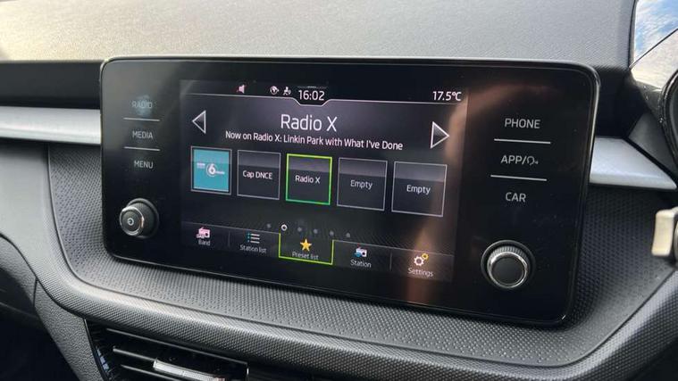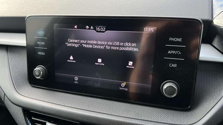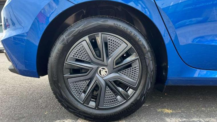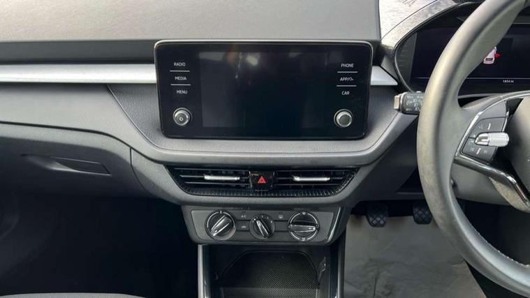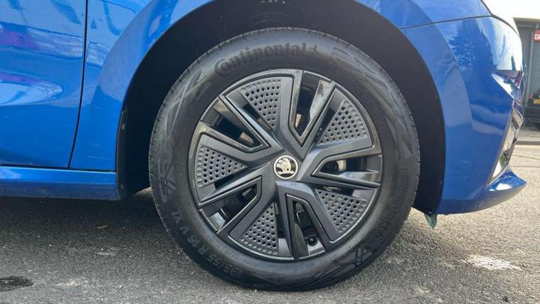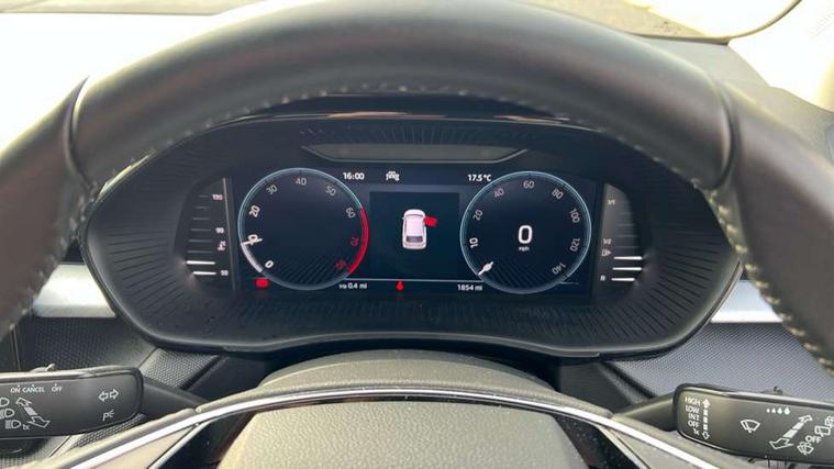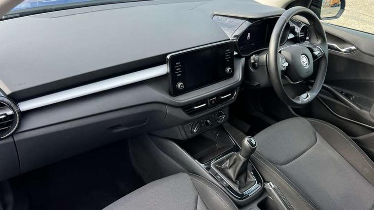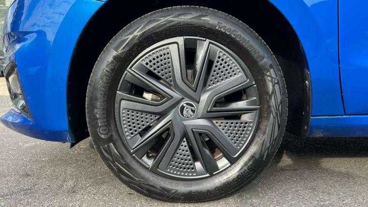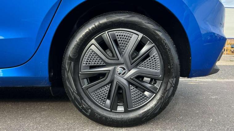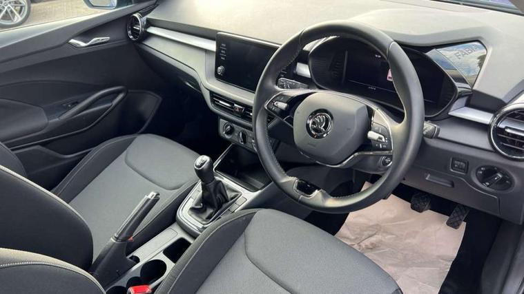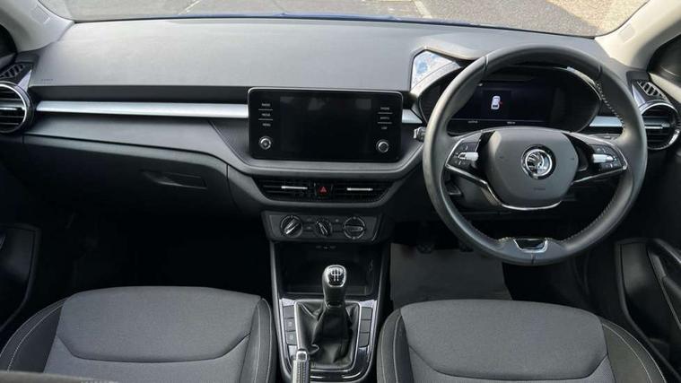 Bluetooth connection, Driver alert system - DAS, Electromechanical power steering, Exterior temperature gauge, Lane assist including road edge detection, Service interval indicator, Virtual cockpit with 10.25" colour display, 2x USB-C in the front (for data transmission and charging), 6 Speakers (4 in front and 2 in rear), Auxiliary socket for external MP3 player, Bolero radio with 8" colour display, DAB digital radio reception, Basic rear lights, Body coloured bumpers, Dimming rear view mirror with black frame, Door mirror integrated indicators, Electrically adjustable and heated door mirrors, Electrically adjustable front windows with function auto up/down, Front window wiper intermittent control, Headlight range control - Automatic, Ice scraper in fuel cap, LED daytime running lights with coming and leaving home feature, Mechanical adjustable rear windows, Privacy glass, Rear LED fog light, Rear side wing doors, Rear window wiper with washing nozzles, Roof colour door mirrors, Roof mounted spoiler, SKODA tailgate lettering in chrome, Third brake light, 3 rear headrests, Backrest split and folding, Central console with fixed cup holder and storage box, Chrome handbrake release button, Fabric upholstery, Gearshift knob/handle in leather, Grain satin black interior door handles, Hand brake lever handle in leather, Height adjustable front headrests, Height adjustable steering wheel, ISOFIX and TopTether anchorage points to the outer rear seats, ISOFIX and TopTether on the front passenger seat, Luggage compartment lighting, Pollen filter, Rear seat bench unsplit, Single front passenger seat, Storm grey headlining, Sun visors with mirror and airbag label on passenger side, Ticket holder, Umbrella in drivers door, 3-point height adjustable front seats belts with pretensioner and force limiter, Automatic warning lights in case of crash, Driver and passengers airbag with switch off function, e-Call+, ESC including ABS, MSR, ASR, EDS, HBA and XDS, Front and rear seat belt warning, FRONT ASSIST (AEB City and AEB Inter Urban), Front side airbags, Head airbags, One tone horn, Pedestrian protection, Three rear 3-points safety seat belts with pretensioner and force limiter including stop function for outer rear seat belts, Tyre pressure monitoring system, Anti-theft alarm system including immobiliser, interior monitoring, backup horn, and towing protection, Anodized cross line upper decorative trim, Colour Edition air vents, Grain satin black central console cover, Grain satin black lower decorative trim, Satin black door and side trim panel in front, Anti-theft wheel bolts protection, Super-low rolling resistance tyres,