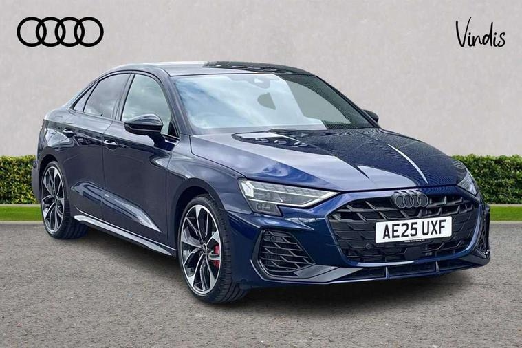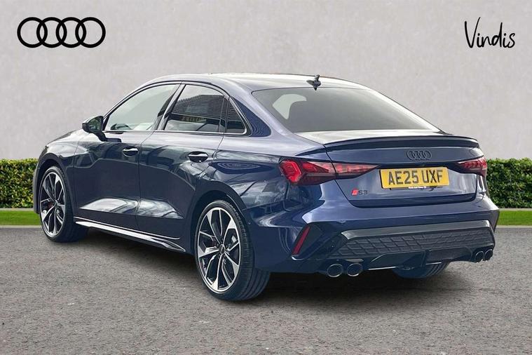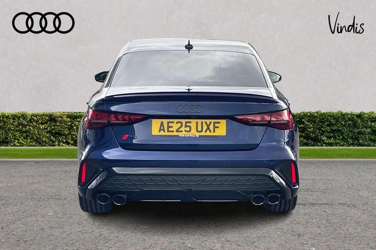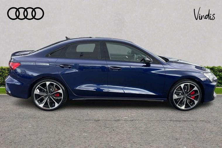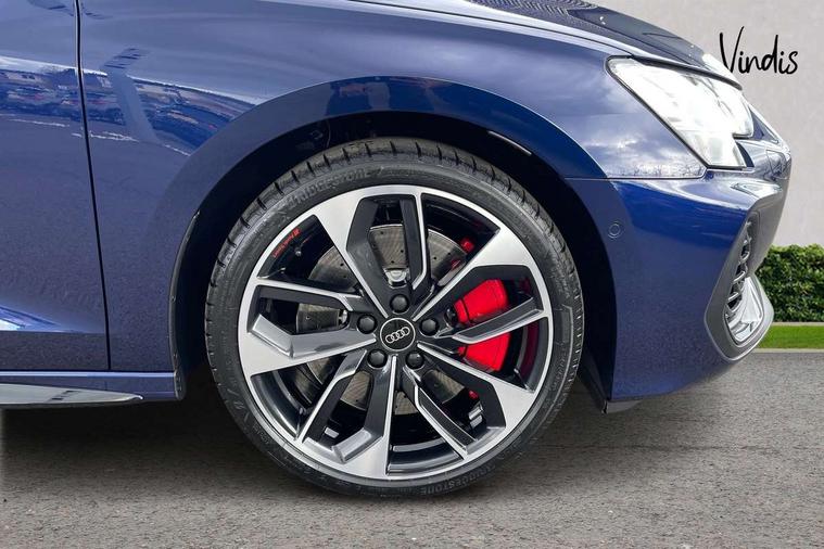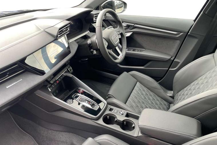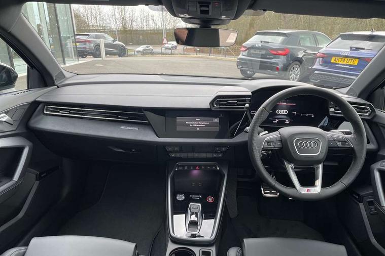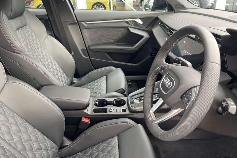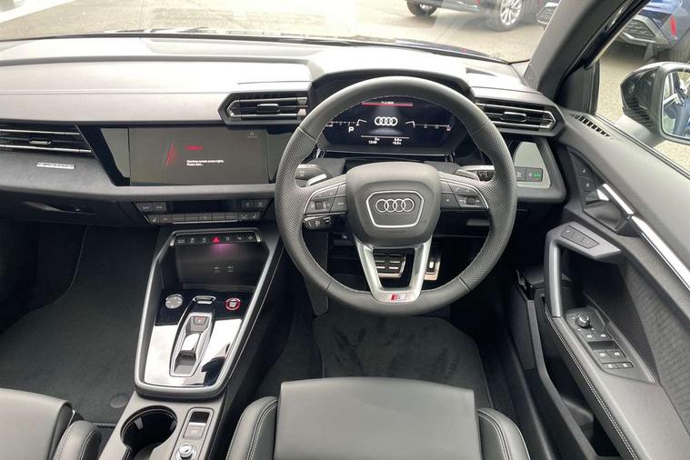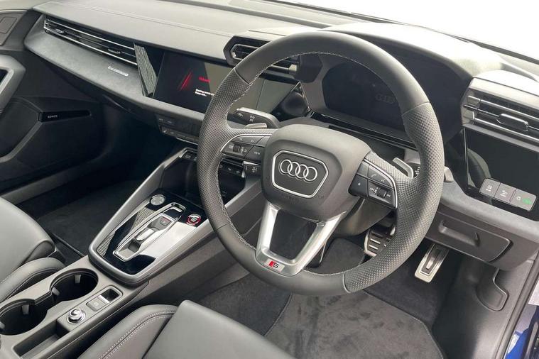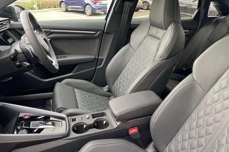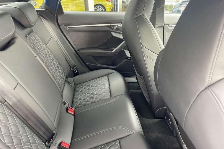 Adjustable speed limiter, Audi drive select, Audi smartphone interface with app store includes wireless Apple carplay, Android auto and Amazon alexa integration, Audi virtual cockpit plus - 12.3" full HD resolution dynamic digital instrument cluster, Automatic start/stop system with recuperation, Bluetooth interface, Camera based traffic sign recognition, Collision avoidance assistant, Distraction and Fatigue warning, e-Call (emergency call), Lane departure warning system, MMI Navigation Plus with high resolution 10.1" colour touch screen display, Park Assist with parking system Plus, Progressive steering, Service indicator, Trip computer, Voice control system with natural language interaction, quattro permanent all-wheel drive with torque splitter, S sport suspension with spring damper adjustment and lowering by 15mm, Audi Phonebox light with wireless charging, DAB Digital radio, USB ports with charging function in the rear, Anthracite grey Audi rings (front and rear), Audi Beam uses LEDs to project the rhombus S logo onto the ground as you exit your S3, Auto dimming frameless rear view mirror, Black accents front and rear bumpers including air inlets, Black accents in front grille and frame, Black accents window trims strips, Electrically adjustable/heated/folding/auto dimming door mirrors with integrated LED indications + kerb view function for passenger side, Exterior model badging, Front electric windows, Headlight washers, Heat insulating glass windscreen, Illuminated door sills with aluminium inserts at the front with S logo, LED 3rd brake light, LED daytime running lights, LED headlights with LED rear lights and dynamic rear indicators, Light and rain sensors, Privacy glass - dark tinted rear window, rear door and side windows, Rear boot, Rear electric windows, Rear side wing doors, S grille, S3 front bumper with S specific air intake grilles, 12V socket and storage compartment in front centre console, 3 seat bench in 2nd row, 3 spoke flat bottomed leather multifunction sport steering wheel with gear shift paddles, 3-zone deluxe automatic air conditioning, 4 way electrically adjustable lumbar support for driver and front passenger, 40/20/40 split folding rear seat bench, Black cloth headlining, Fine Nappa leather upholstery with front sports seats S embossed logo, Front and rear centre armrest in artificial leather, Front and rear centre armrest in artificial leather with contrasting stitching on armrests and instrument panel, Front and rear headrests, Front/rear floor mats, Heated front seats, Height and reach adjustable steering wheel, Manual boot compartment lid, Manually adjustable front seats, Rear cup holders, S badging on the steering wheel, Seat side bolsters, Single front passenger seat, Stainless steel pedals and front footrest in black, Aluminium interior elements pack - A3, Extended ambient lighting package Pro - S3 Black edition, Storage package - A3 Saloon, Technology package - A3, 3x3 point rear seat belts, Driver and front passenger airbag with passenger airbag deactivation, Electronic Stabilisation Control (ESC) including ABS, ASR and EDL, First aid kit with warning triangle and 2 safety vests, Front side airbags with head airbags and interaction airbag, Hill hold assist, Pre-sense front with pedestrian and cyclist detection, Seatbelt monitoring, Tyre pressure loss indicator, Anti theft alarm, Anti-theft wheel bolts, Electronically operated child locks, Immobiliser, Remote central locking with safelock, Inlays in black dynamica microfibre, Tyre repair kit,