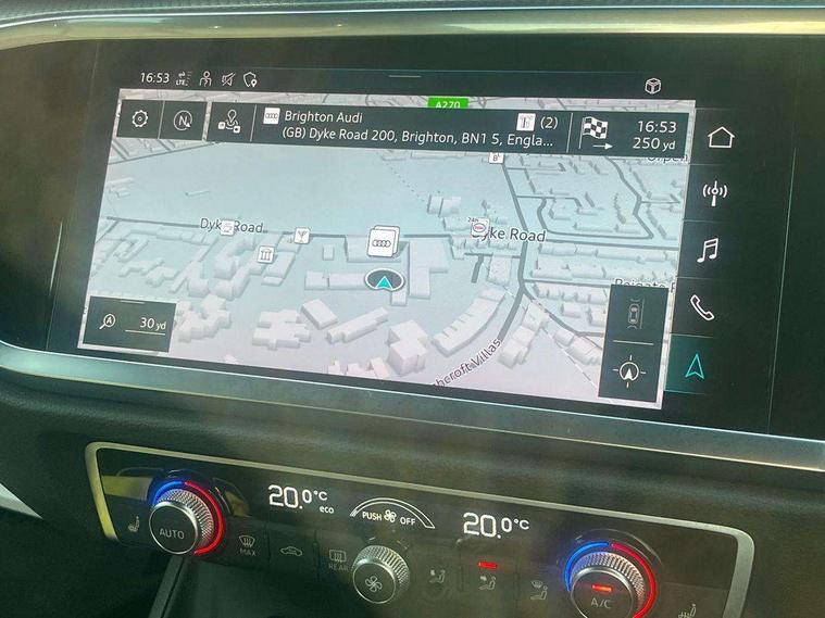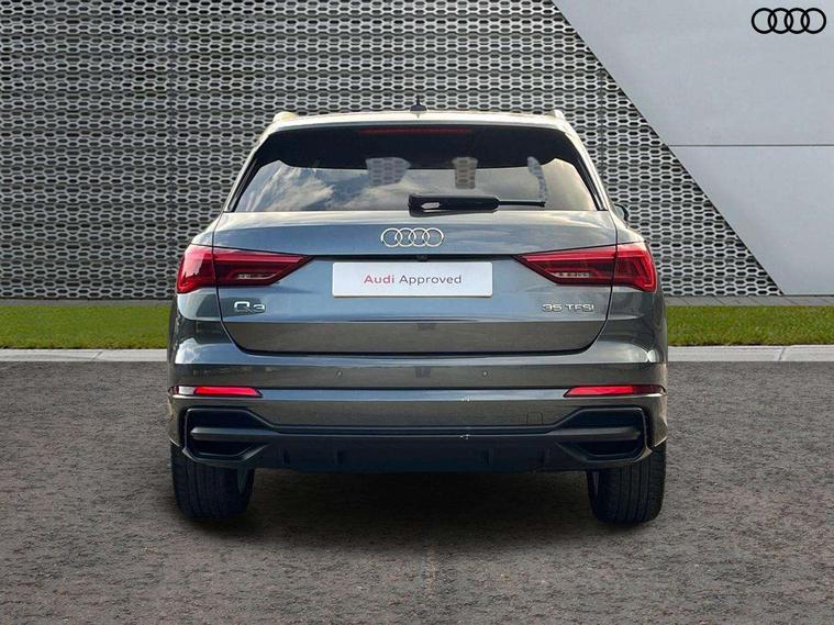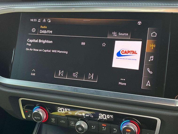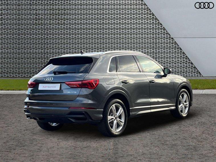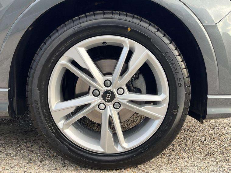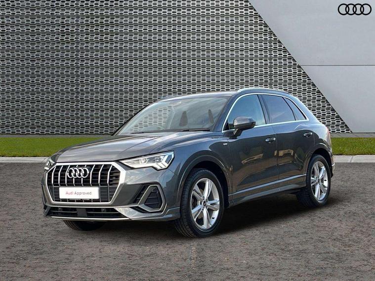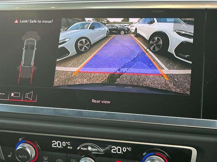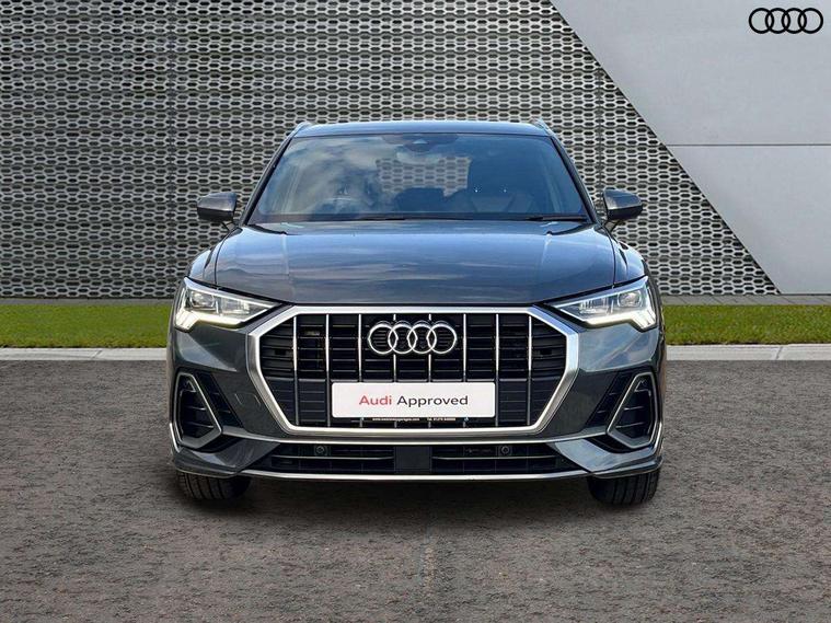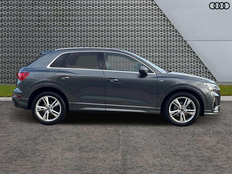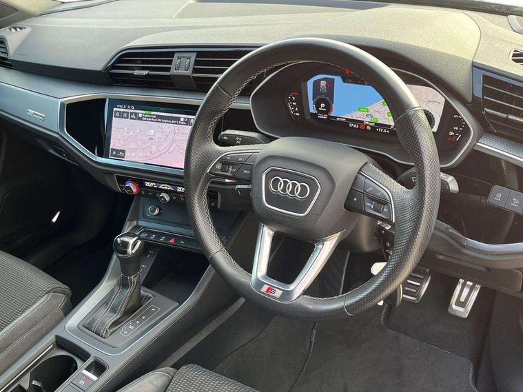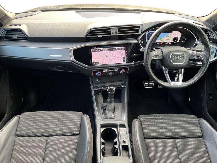 Amazon alexa Integration, Audi connect safety and service (e-call), Audi drive select, Audi lane departure warning, Audi Virtual Cockpit - 10.25" display, Bluetooth interface, Camera based traffic sign recognition, MMI Navigation Plus with high resolution 10.1 inch touchscreen colour display, Power operated tailgate, Progressive steering, Service interval indicator, Smartphone interface includes wireless Apple carplay/Android Auto, Start stop system with recuperation, Voice control system with natural language interaction, 48V Mild hybrid technology, Sports suspension, 2 USB-C ports with charge and data functions, 6 passive loudspeakers, DAB digital radio module, Acoustic windscreen, Aluminium roof rails, Aluminium window trim, Auto dimming frameless rear view mirror, Body coloured bumpers, Electrically folding, adjustable and heated door mirrors with integrated LED side indicators and kerb view function for passenger side, Front and rear electric windows, Front fog lights, Front side air inlets in matt platinum grey, Front spoiler blade in matt platinum grey, Grille vertical bars in aluminium silver/Matt, High gloss black finish B and C pillars, LED headlights with LED daytime running lights and dynamic rear indicator, LED rear lights, Privacy glass dark tinted rear and rear-side windows (from B-pillar backwards), Rain and light sensors, Rear diffuser strip in matt titanium black, S line badges on front wings, S Line front and rear bumpers, Side skirt insert in matt Platinium grey, Silver chrome grille surround, Titanium black radiator grille, 12V socket in rear centre console, 40:20:40 folding with manual adjustment for 60:40 forwards/backwards position and backrest angle, Adjustable rear seat bench/backrest with centre armrest and cupholder, Black cloth headlining, Dual zone electronic climate control, Front and rear black floor mats with contrast stitching in rock grey, Front and rear headrests, Front and rear roof module including reading lights, Front centre armrest, Glove compartment lighting, Height and reach adjustable steering wheel, Illuminated door sill trims with S logo, ISOFIX child seat mounting for front passenger with airbag deactivation and outer rear seat including top tether attachment point for outer rear seats, Luggage compartment light, Manual front seats with height adjustment, Perforated leather gearknob, Stainless steel luggage compartment sill finisher, Stainless steel pedals, Non smoking pack - Q3, 3x3 point rear seatbelts, 6 airbags - Driver, front passenger, curtain and side windows, Audi pre-sense front with pedestrain and cyclist recognition, Electrically operated child locks on rear doors, Electromechanical parking brake, Electronic stabilisation control including ABS, ASR and EDL, Hill descent control, Hill hold assist, Pre sense basic, Seatbelt monitoring, Tyre pressure warning, Warning triangle and first aid kit, Anti theft alarm, Anti theft wheel bolts, Remote central locking, Dark matt brushed aluminium inlay, Detail dashboard around MMI touch colour display in glass look, black with surround in aluminium look, Leatherette door armrest, Tool kit, Tyre repair kit,